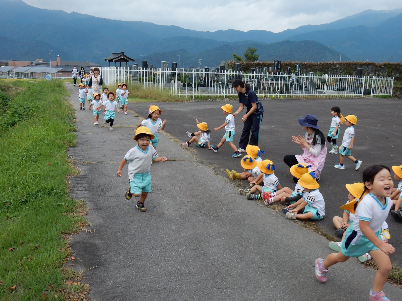 農道に立ててある看板、クラスカラーまで走るのが毎日の日課なんですが、マラソン大会では、どのクラスも、1つ、または2つ大きいクラスの看板まで走るんです!折り返し地点で待っていてくれる先生に、元気にタッチ!大会当日は、お母さん、お父さんに、折り返し地点で待機していただき、後半は、親子で一緒に走って下さいね!
