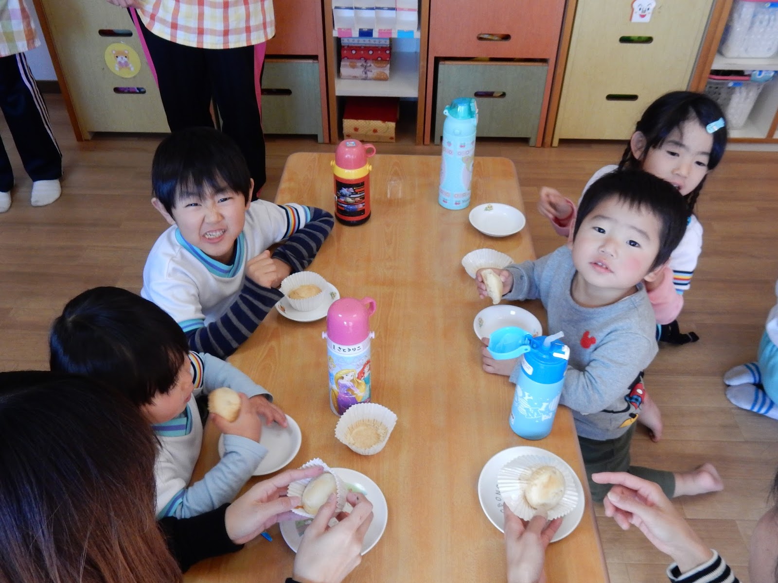 そしてこの日のおやつは、♡りんごのカップケーキ♡ お家の人と一緒に食べたおやつはとってもおいしくて、みんなうれしくてニコニコ笑顔でいっぱいでした!