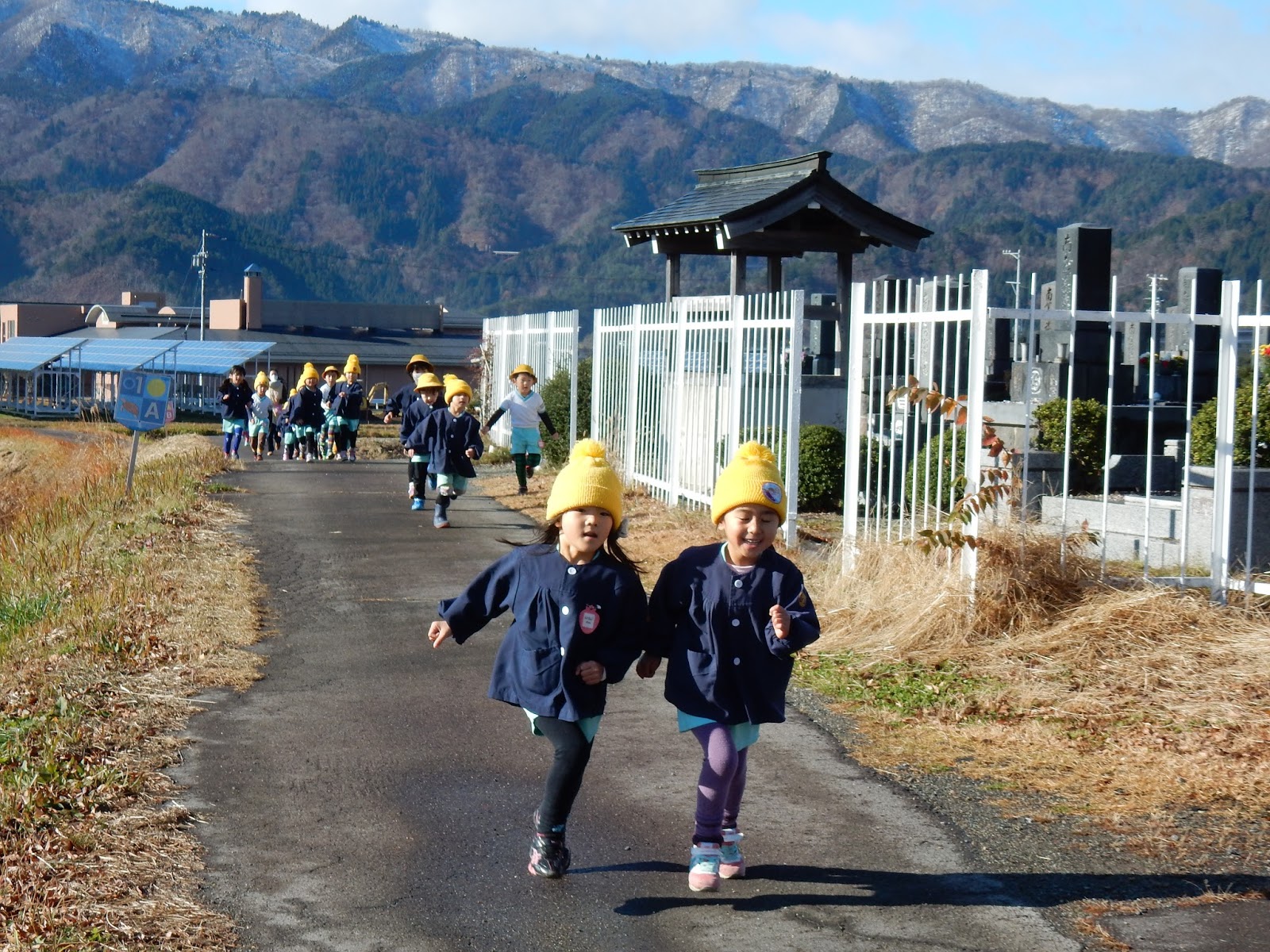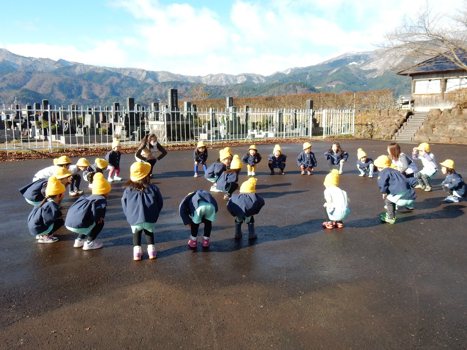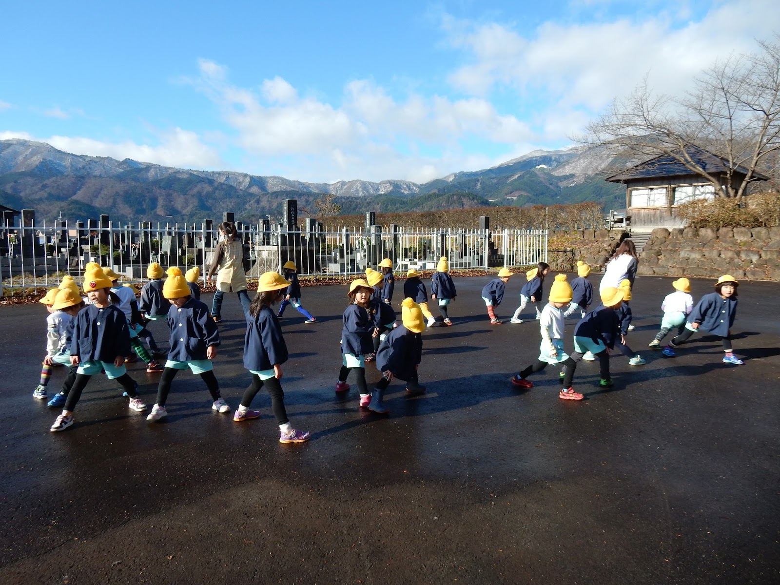 園庭が濡れていた為、隣の駐車場で体操をしました。久しぶりのマラソンは天気も良くって