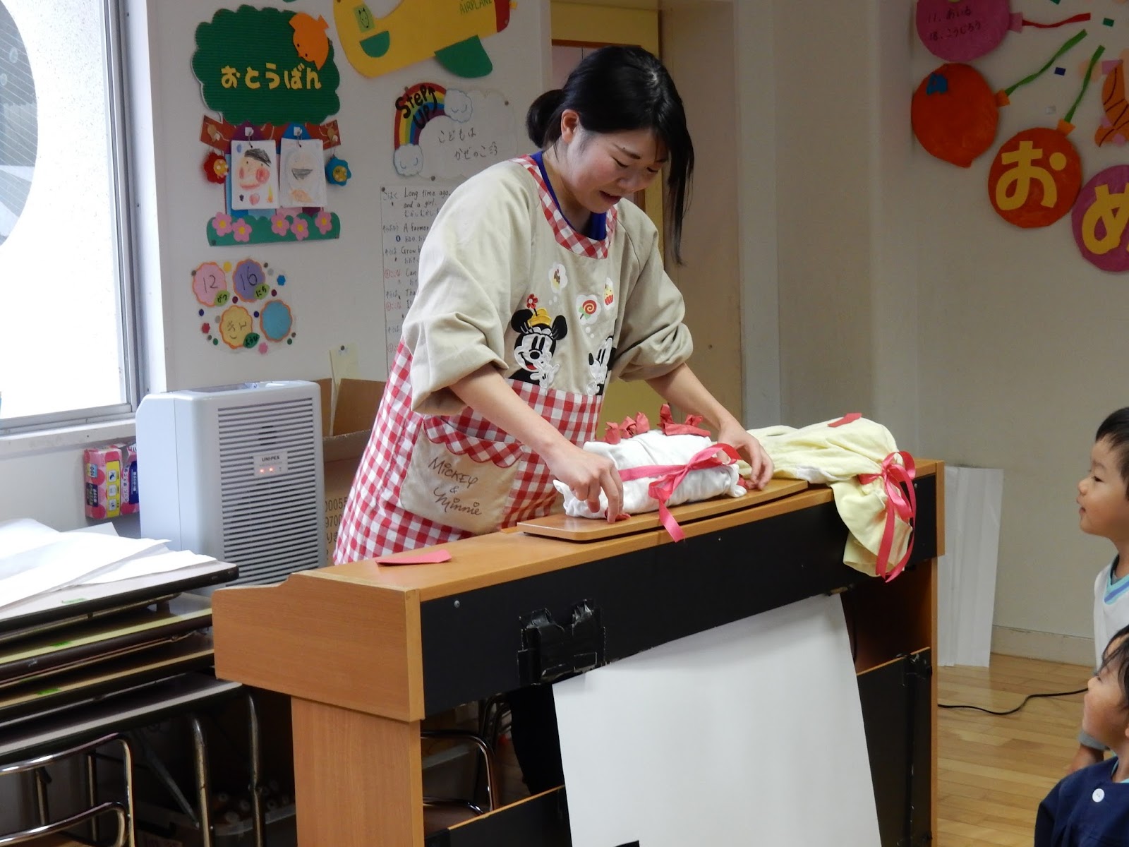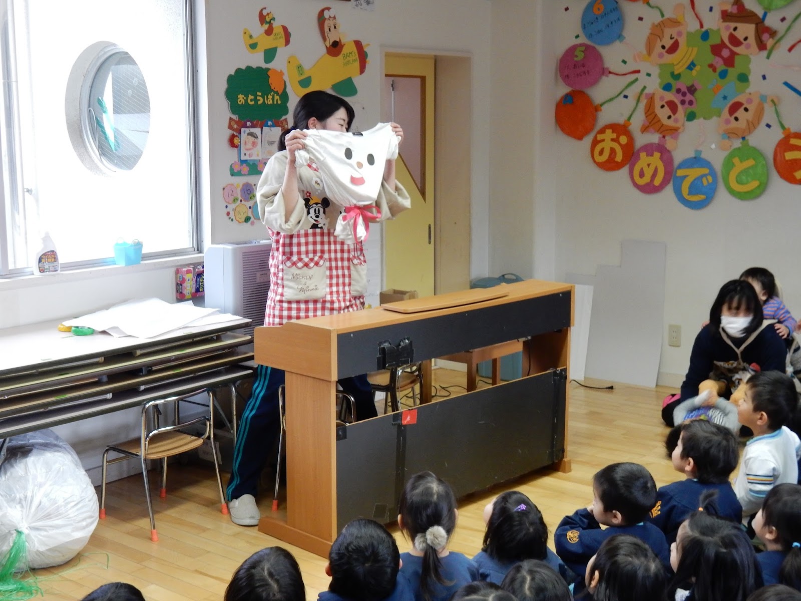 あい先生からふたつお話プレゼントがありました。ひとつめは何やら、おもしろい形をした白い動物が・・・・ ”うさぎ?” そして、変身したものは・・・・
