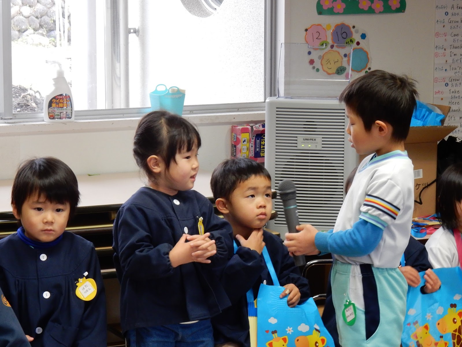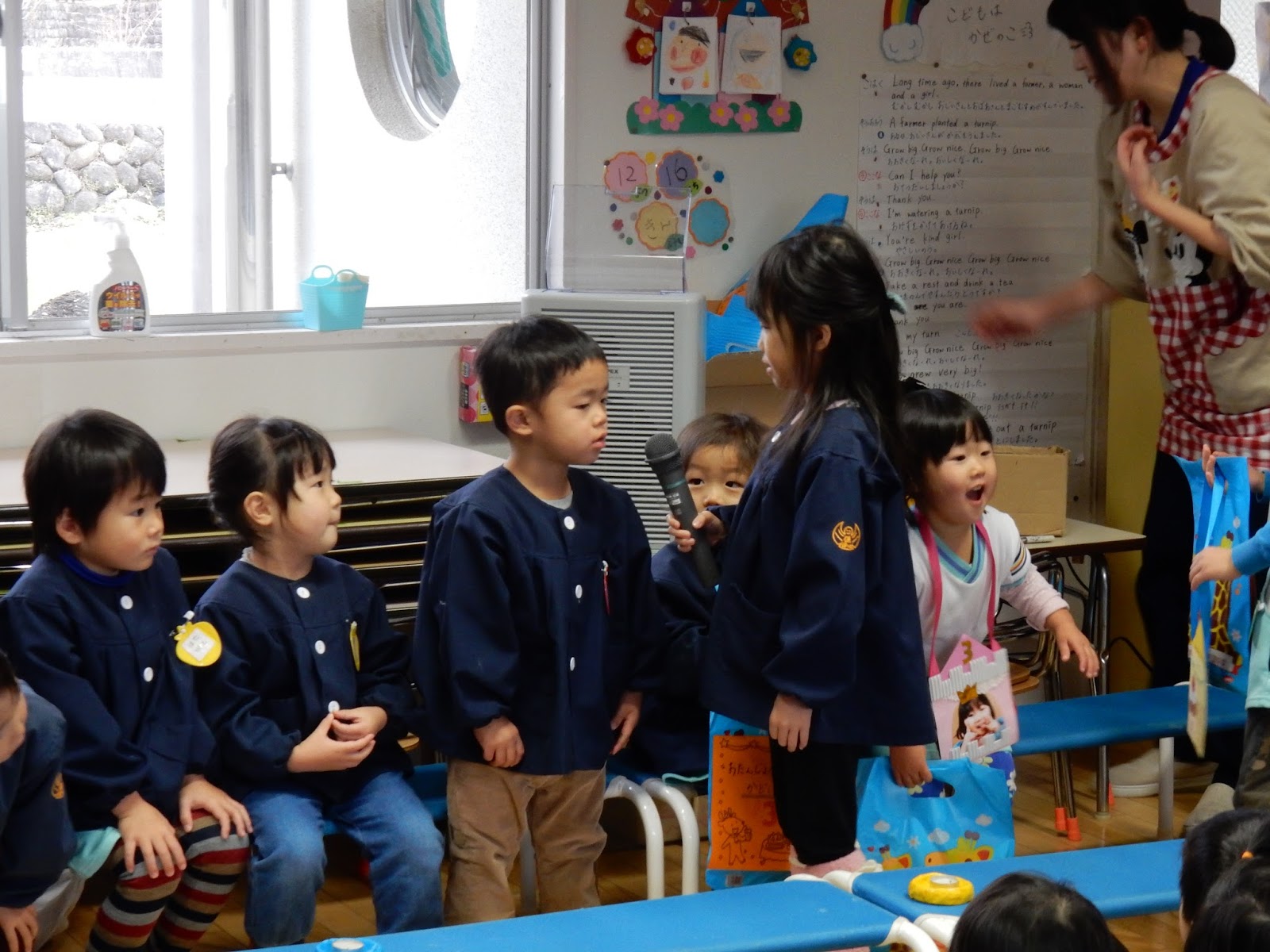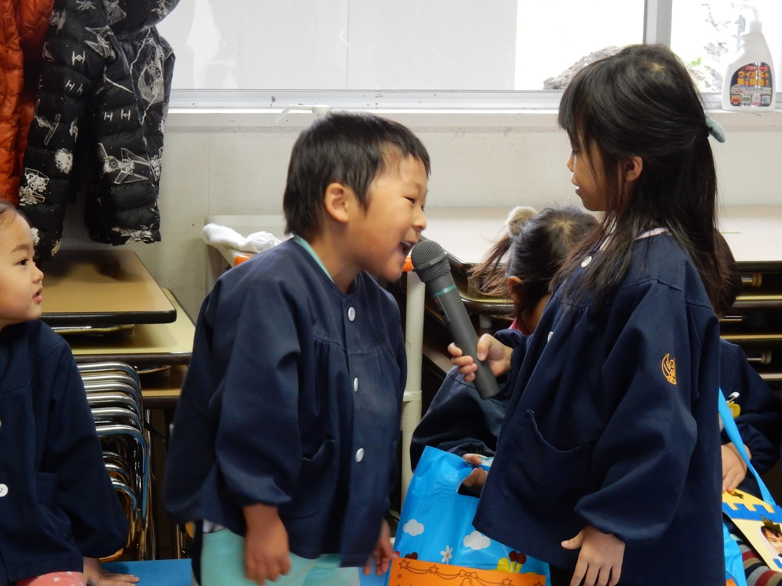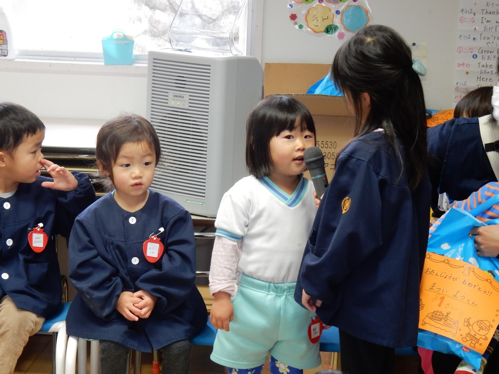 お名前と何才になりましたか?のインタビュー。 小さい組のひよこさんとすみれさんは、元気よくおはなしできました!!!