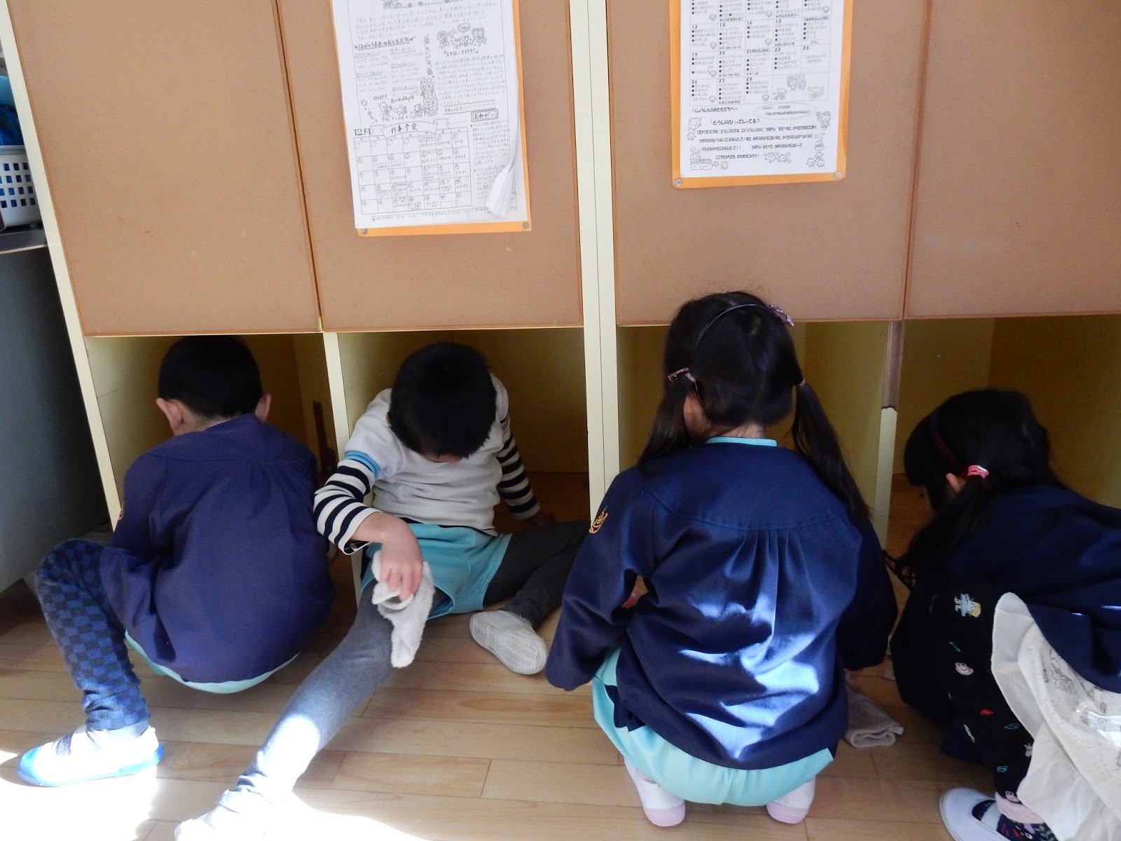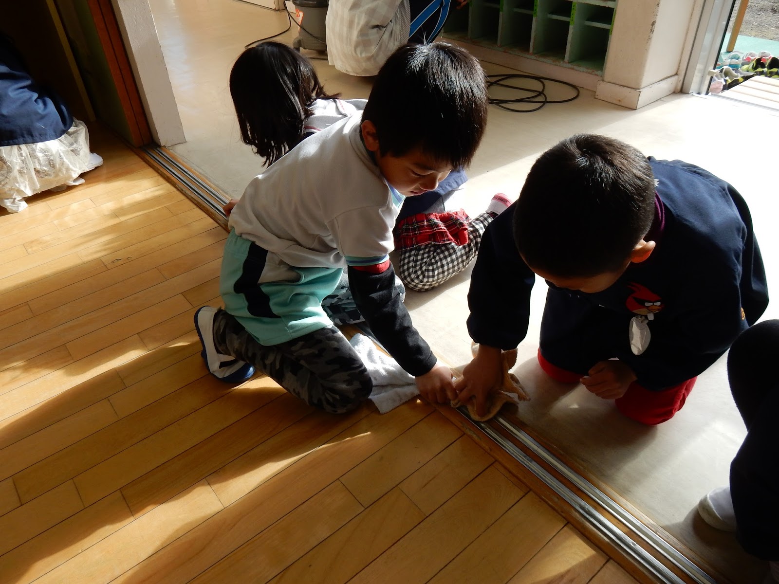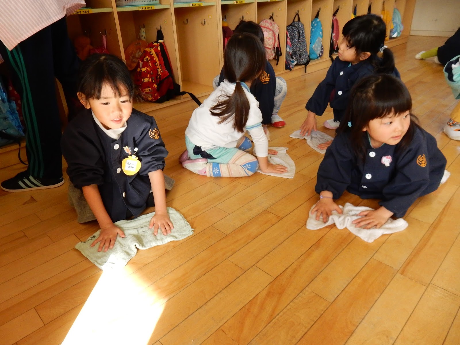 ゆり組は、椅子・ロッカー・廊下・靴箱・・・などなど、いろんな所を拭きました。みんなでギュウギュウになりながら、掃除しました!