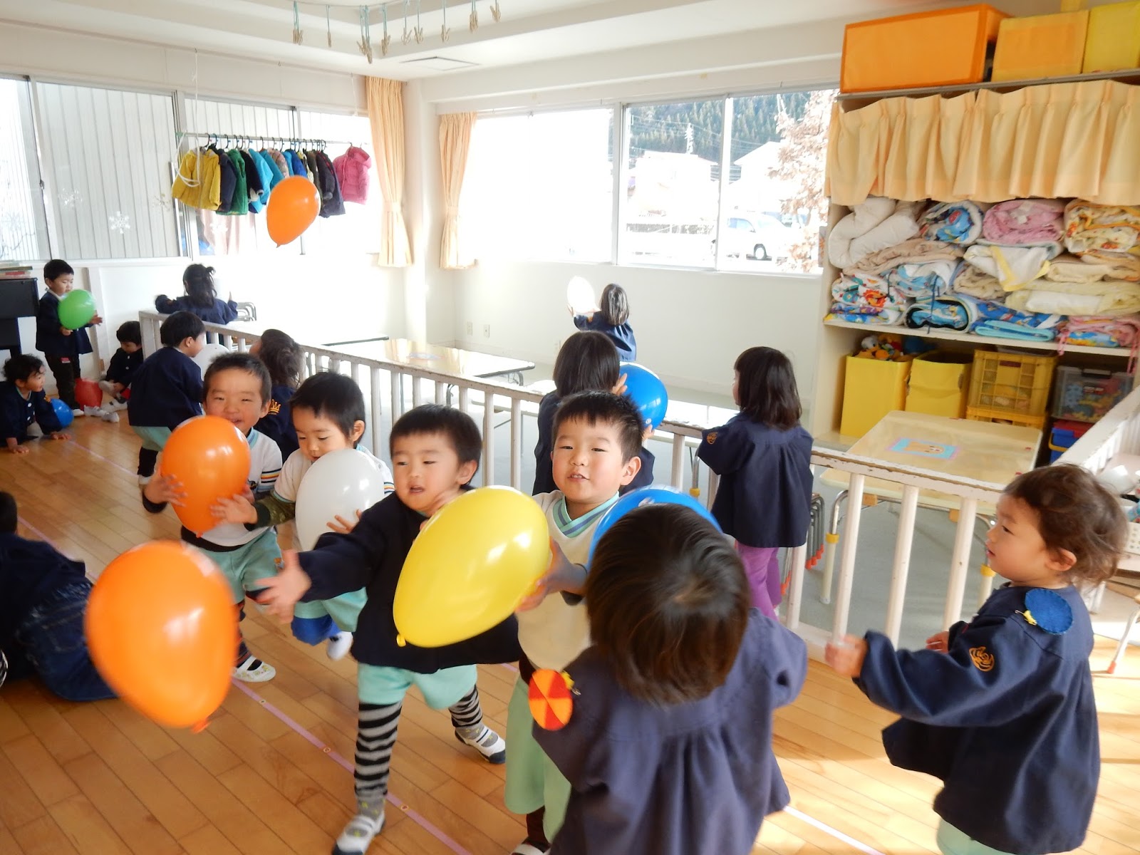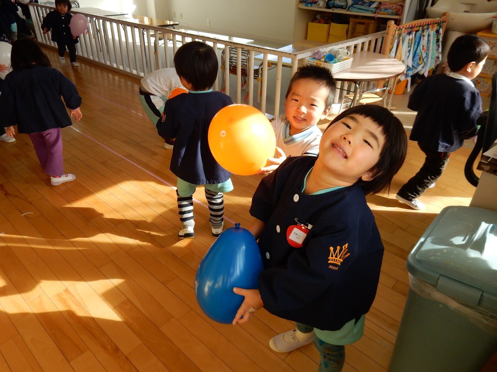 すみれ組に行くと、ちょうど大掃除が終わった後でした・・・(ガーン) でも、みんな上手にロッカーをふけたようです。そして、掃除の後に風船遊びを楽しみました!