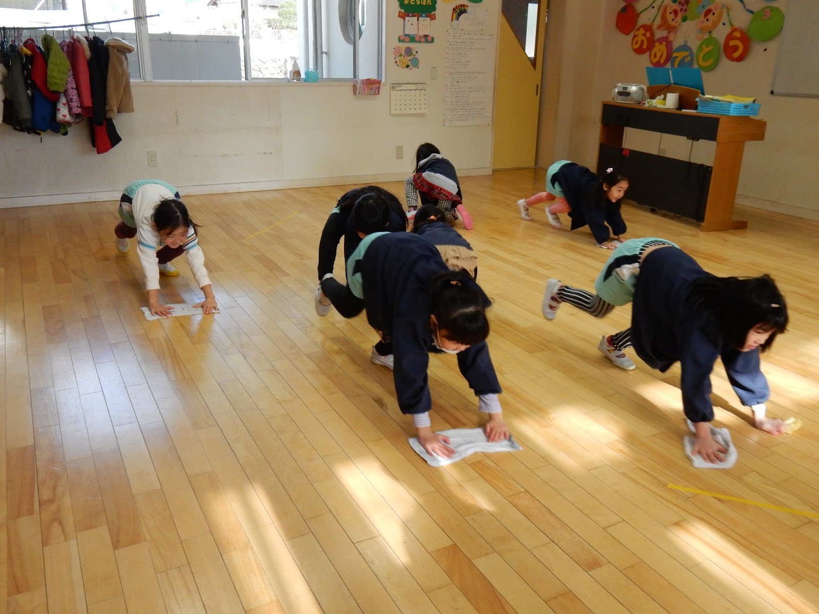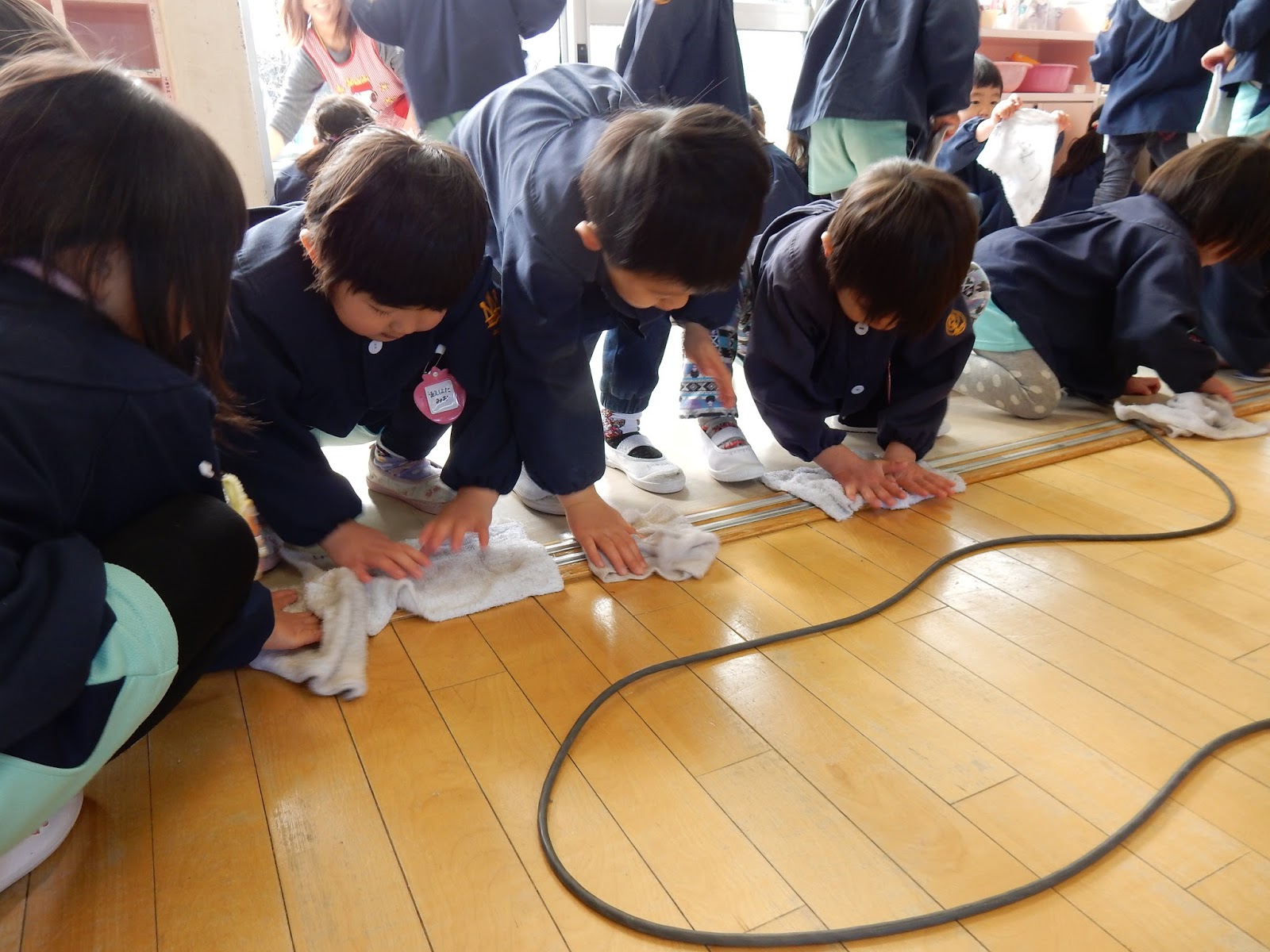 たんぽぽ組は、床拭きをしました!広いお部屋の床を”キュッキュッ”ゴシゴシ”床拭き、楽しいなあ~♪