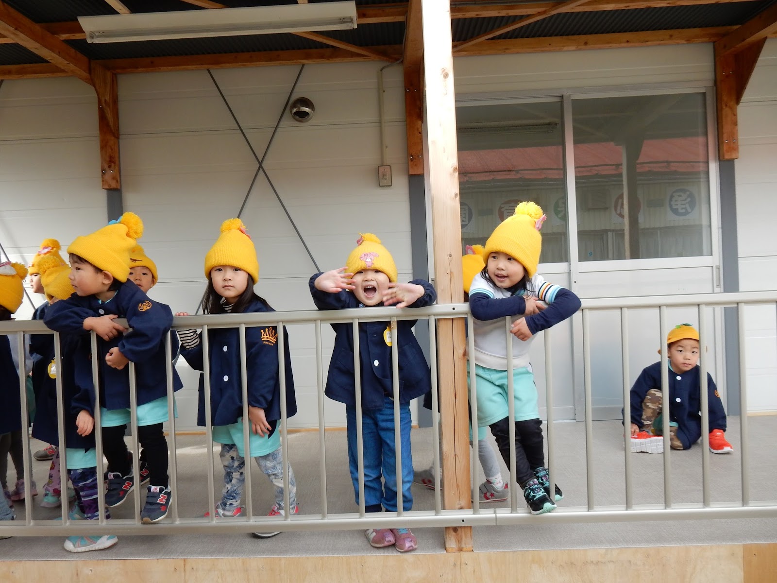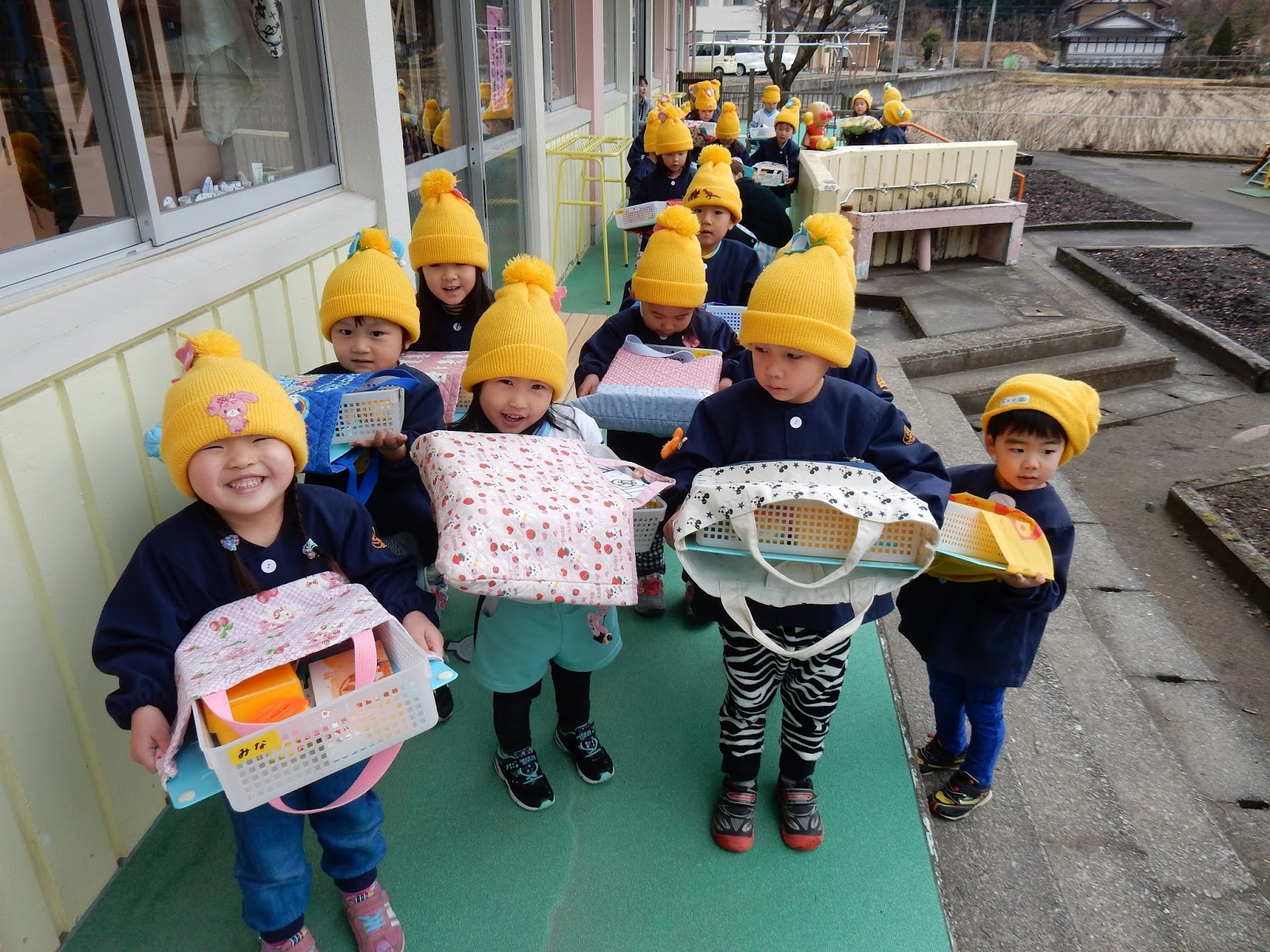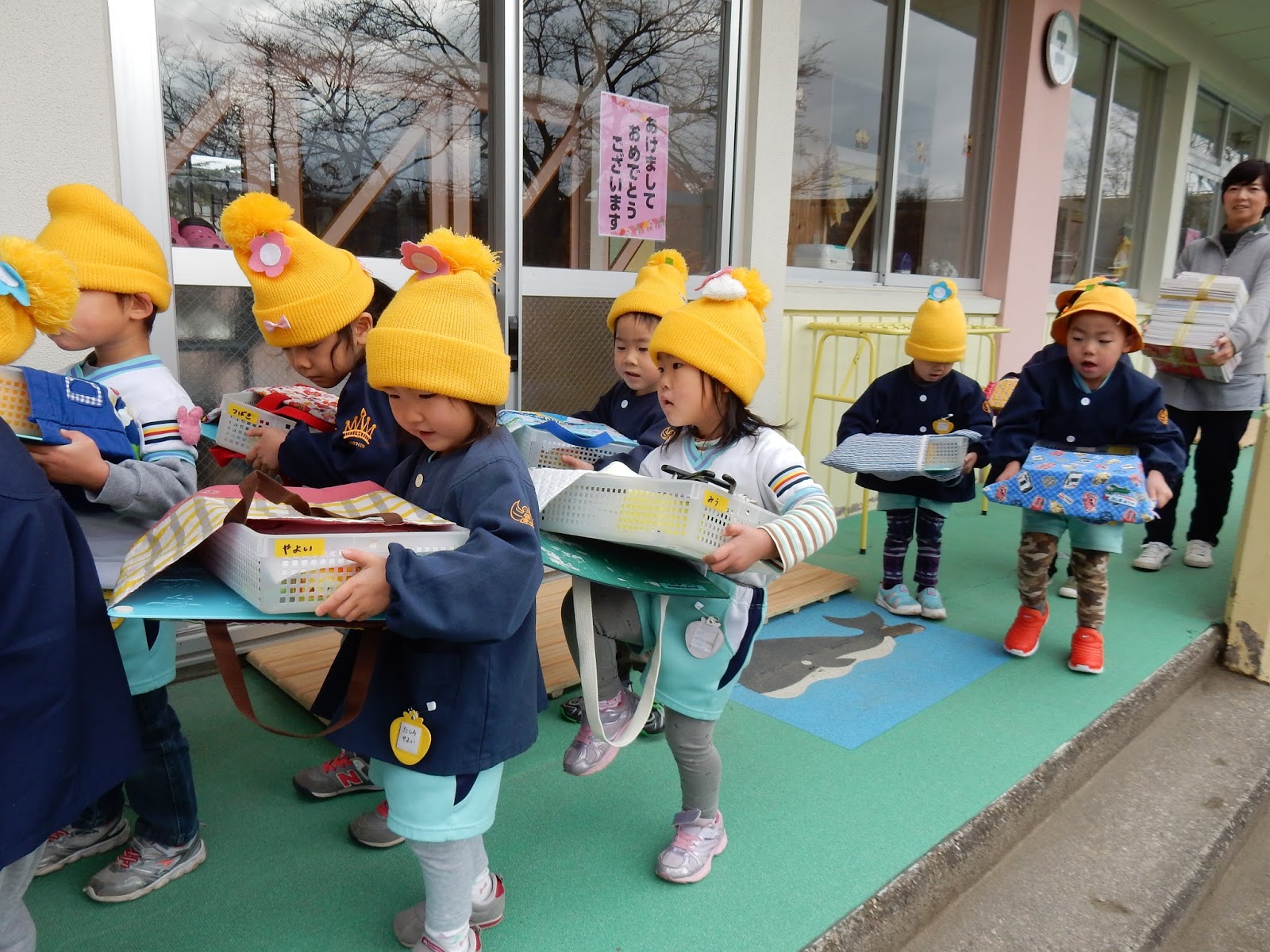 2017.01.10 あと4日で・・・・・ この園舎で生活するのもあと4日となりました。今週は最後の一週間です・・。今日は、ひまわりさんの部屋に集まり、交通安全のお話を聞きました。 いつもならスライドを見てのお話なのですが、あい先生の実演でみんな楽しくお話が聞けました。 そして、今日はたんぽぽさんがお引越しの準備をしました!自分のお道具箱を両手に持ち”おもい~!!!”と言いながら、仮設園舎まで運んで行きました!! お道具箱を置いたら、”早く新しい所で遊びた~い!”と、楽しみにしているたんぽぽさんでした。