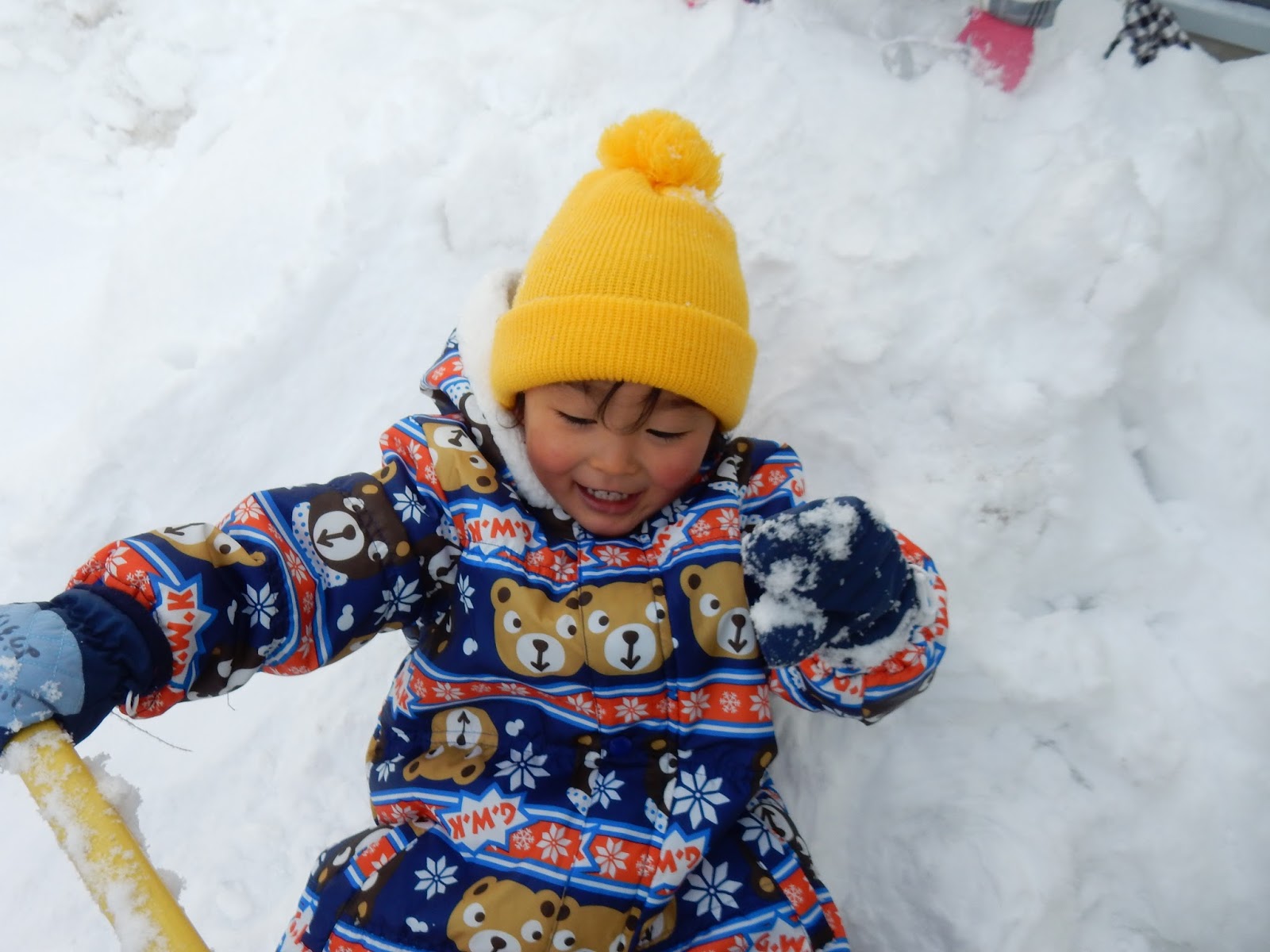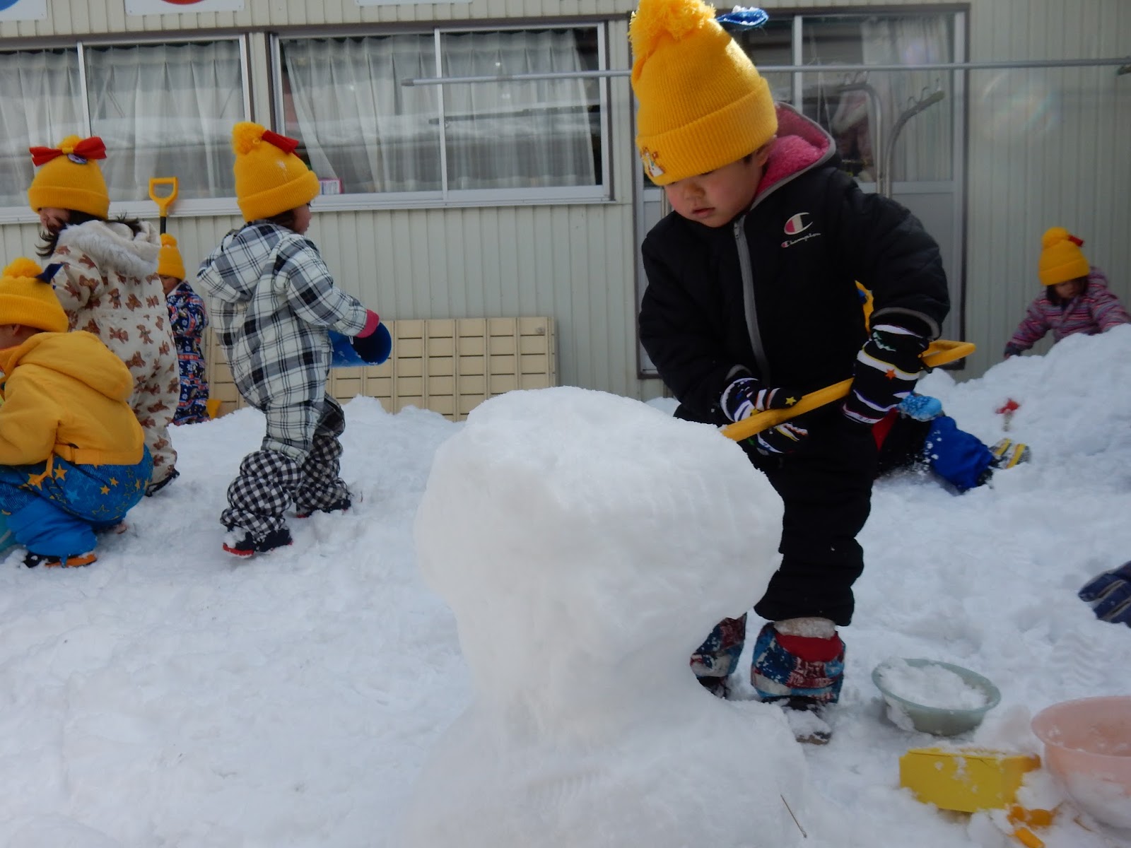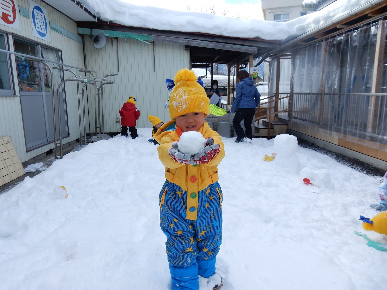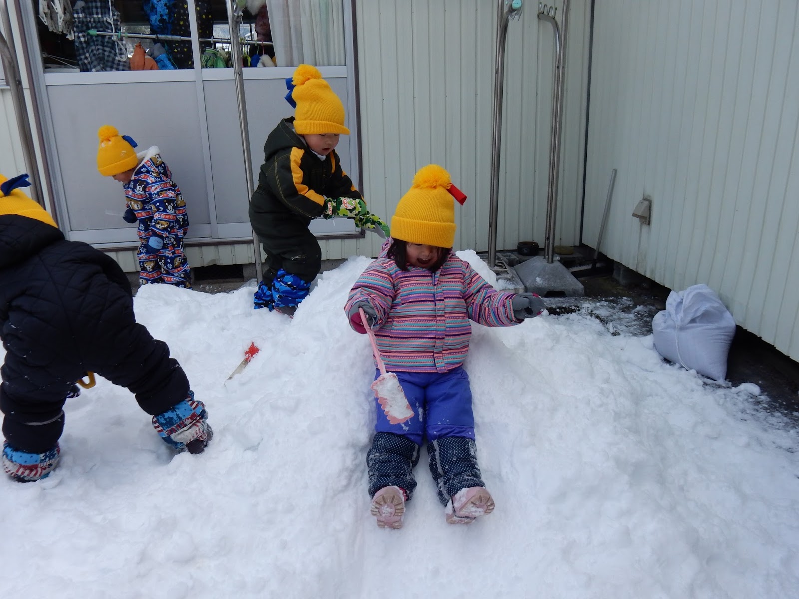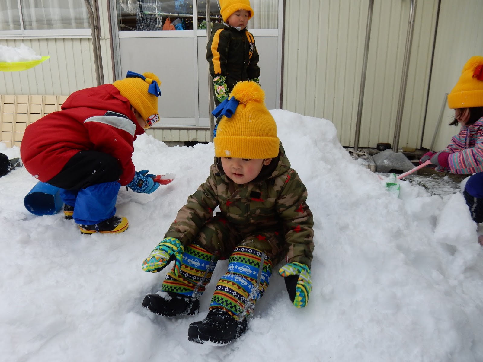 仮設園舎の中庭?に、ちょうどいいスペースの広さがあり、そこにいいくらいの雪が積もり、雪遊びをして遊びました!!