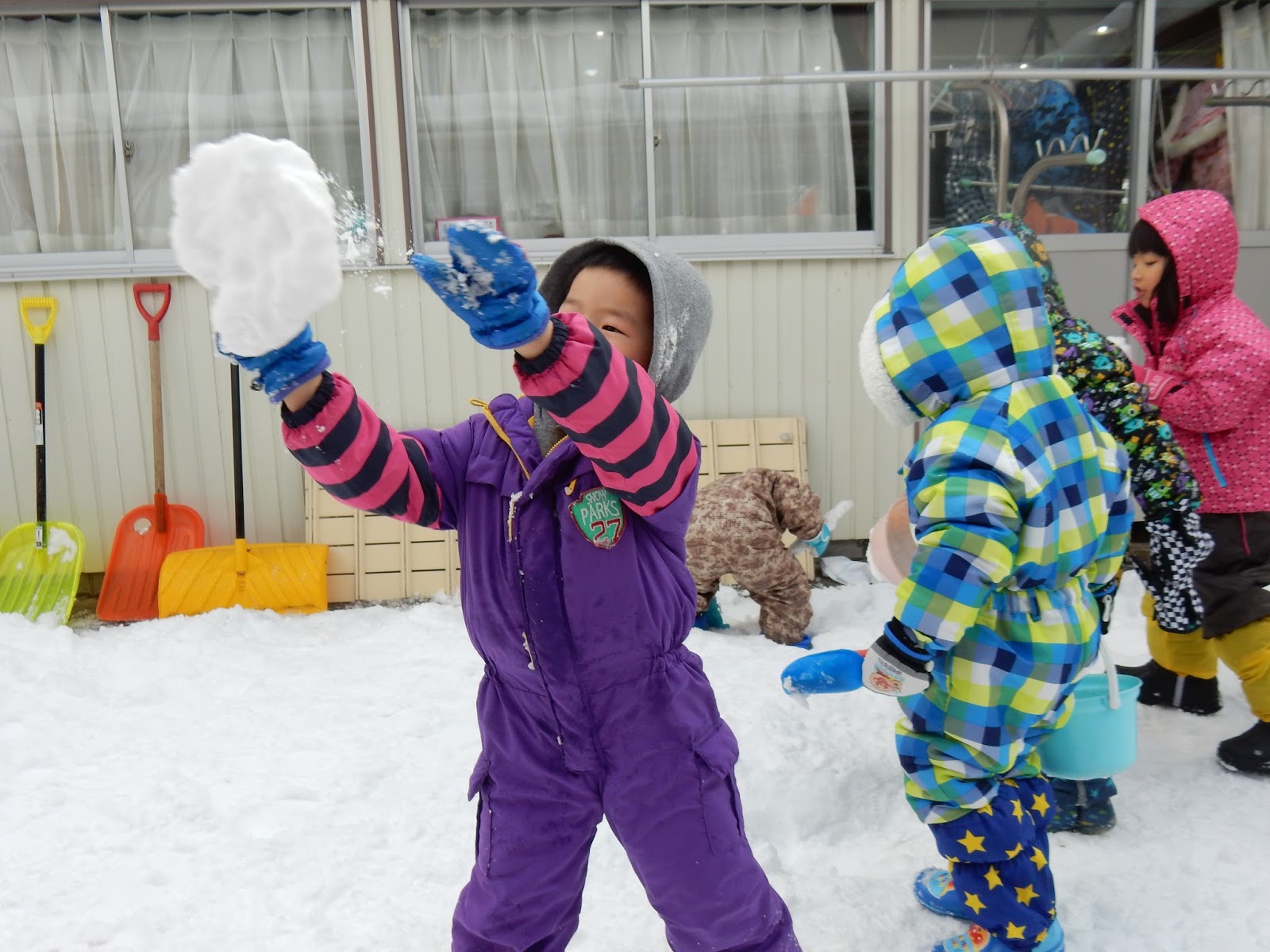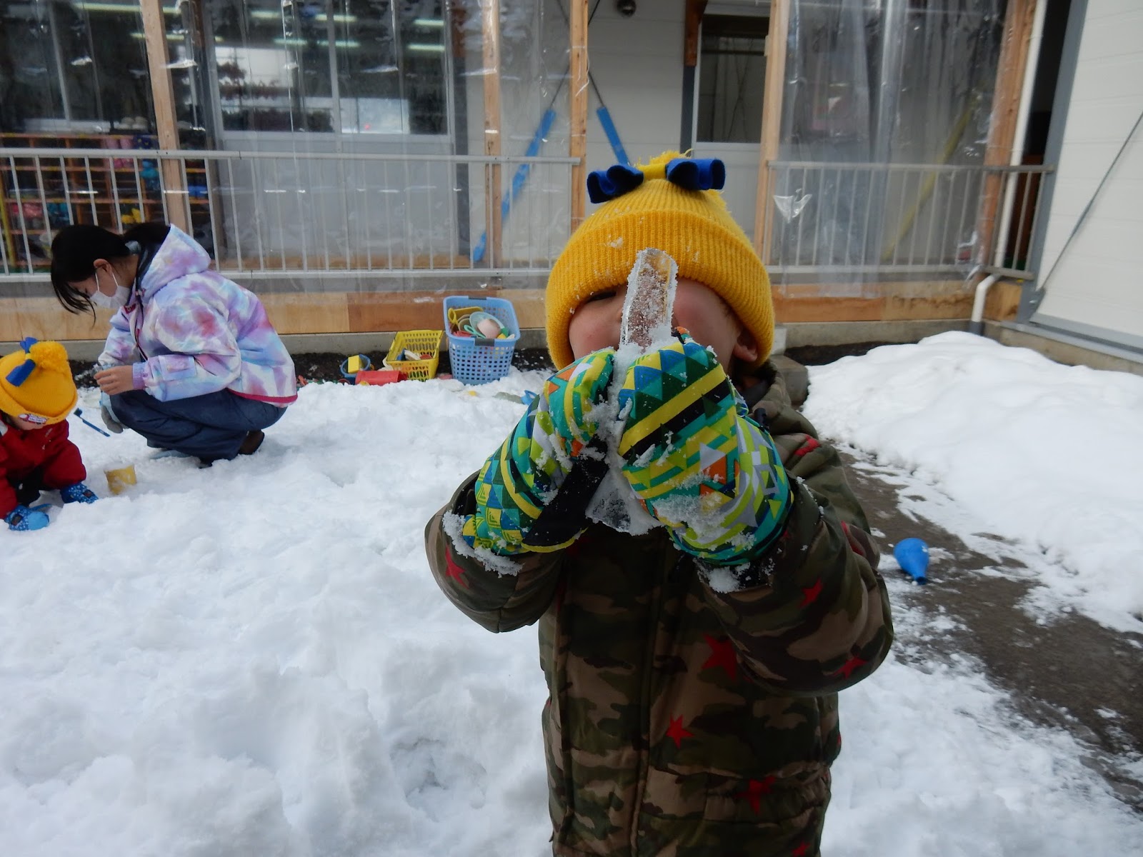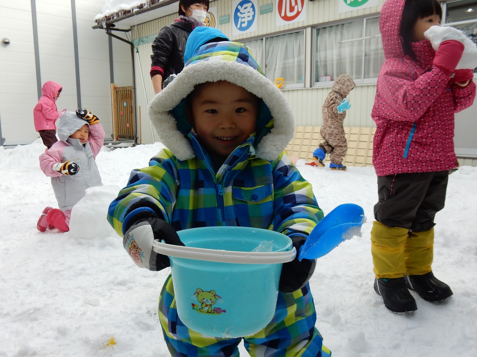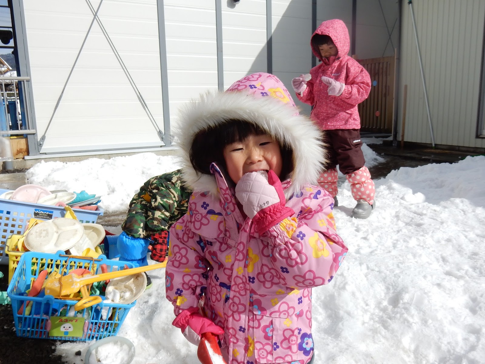 仮設園舎の中庭?に、ちょうどいいスペースの広さがあり、そこにいいくらいの雪が積もり、雪遊びをして遊びました!!