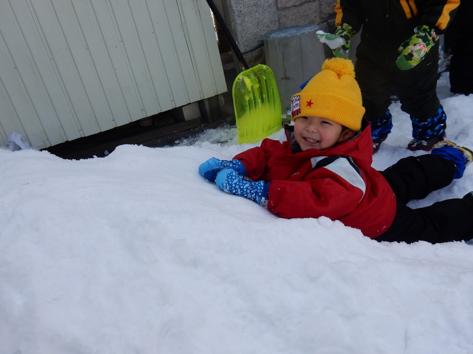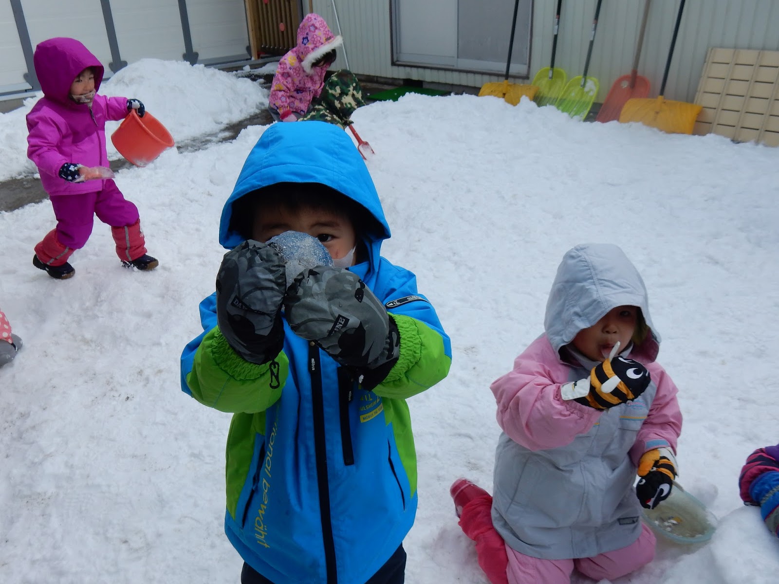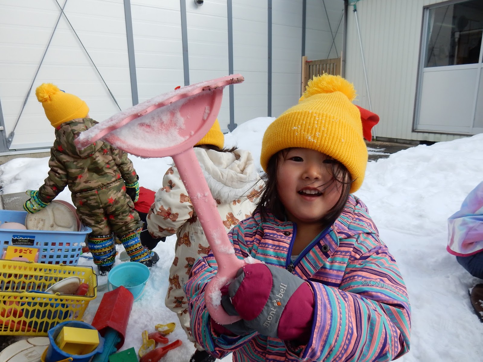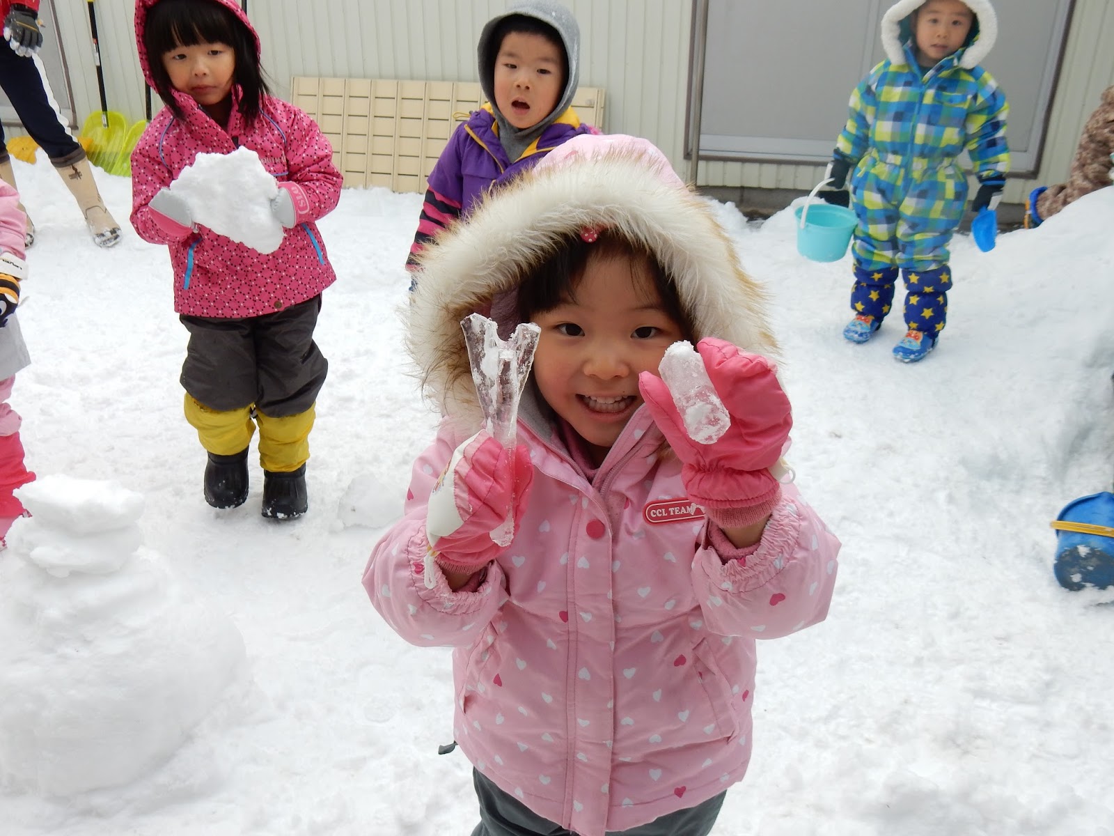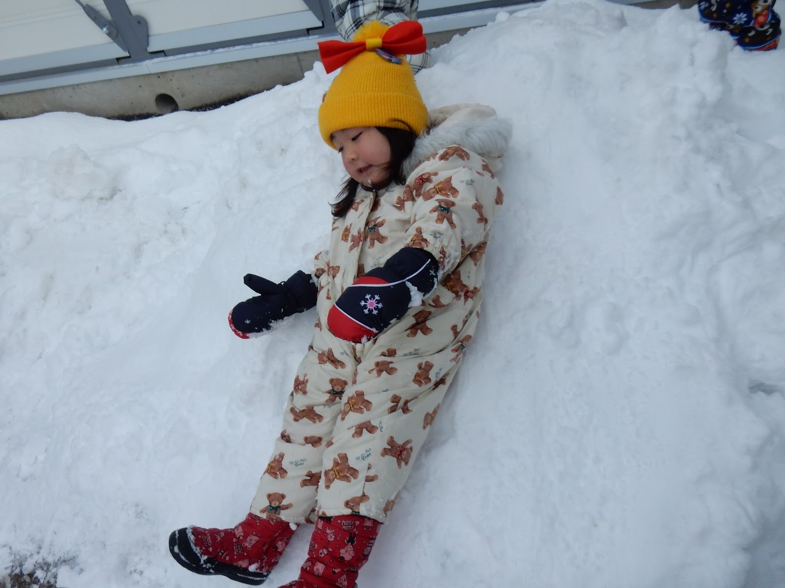 仮設園舎の中庭?に、ちょうどいいスペースの広さがあり、そこにいいくらいの雪が積もり、雪遊びをして遊びました!!