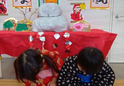 園庭の方は、まだ工事用の壁があり、全く見えませんが、ひよこさんの部屋の前には、風船とかかかかっていてちょっぴり楽しいですよ!