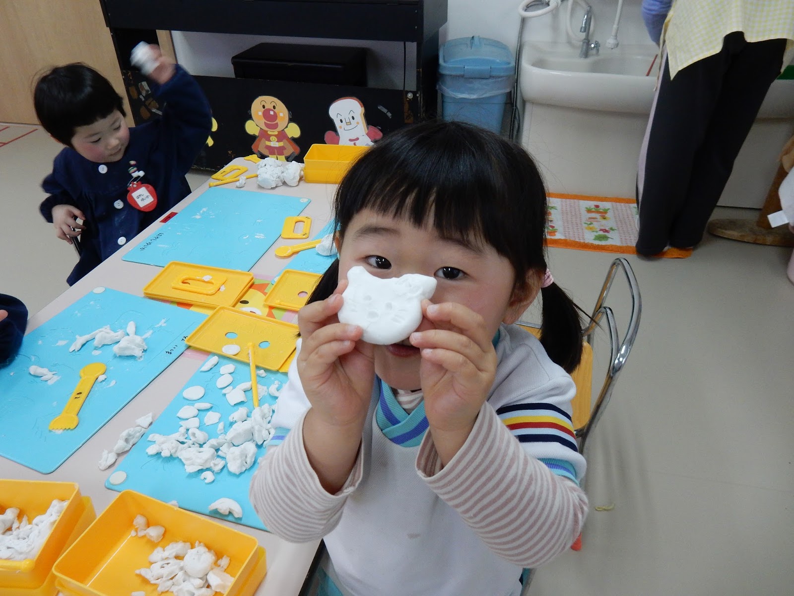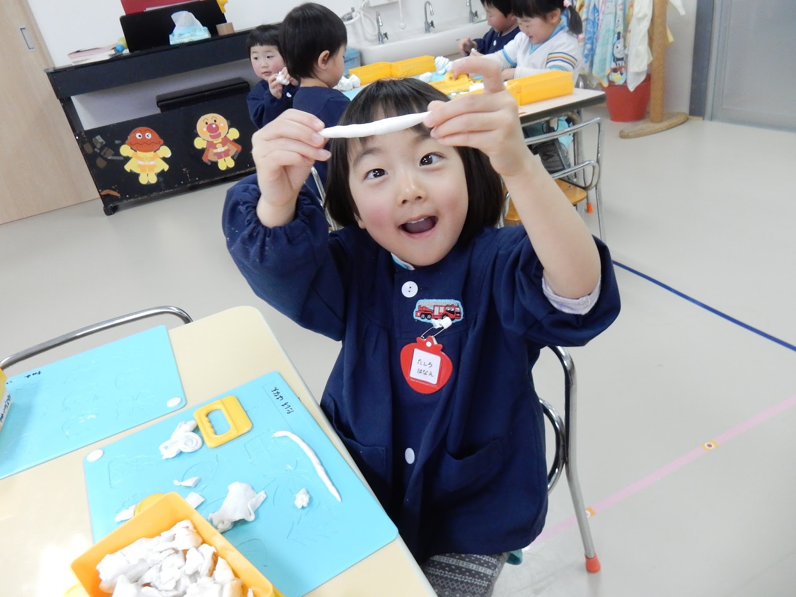 すみれさんのお部屋を覗いてみたら、粘土遊びをしてました。「先生~!見てみて~!」と元気いっぱい!