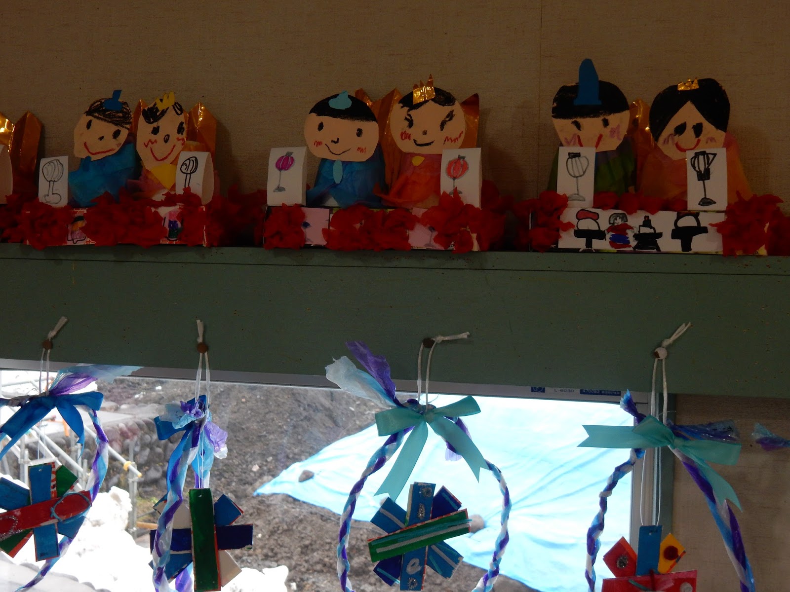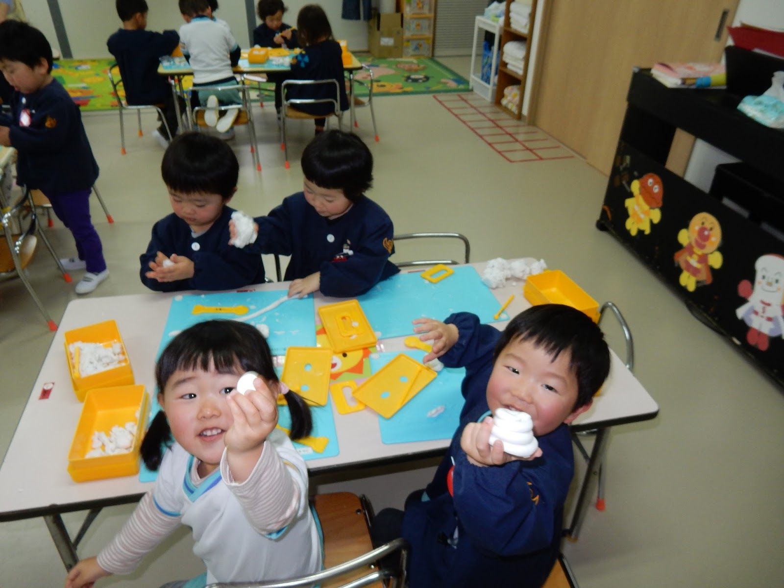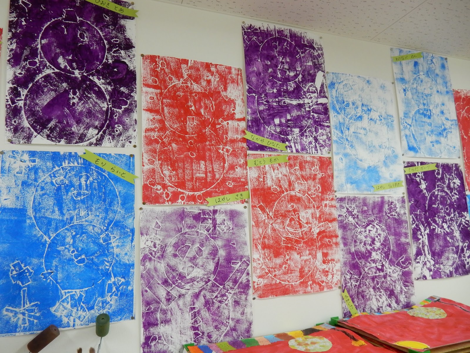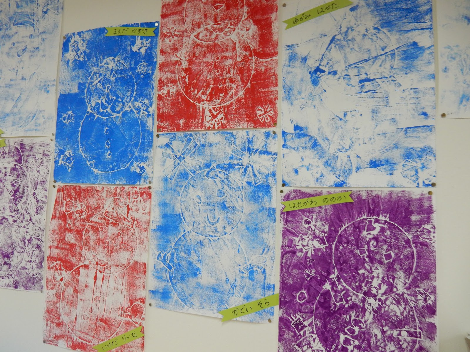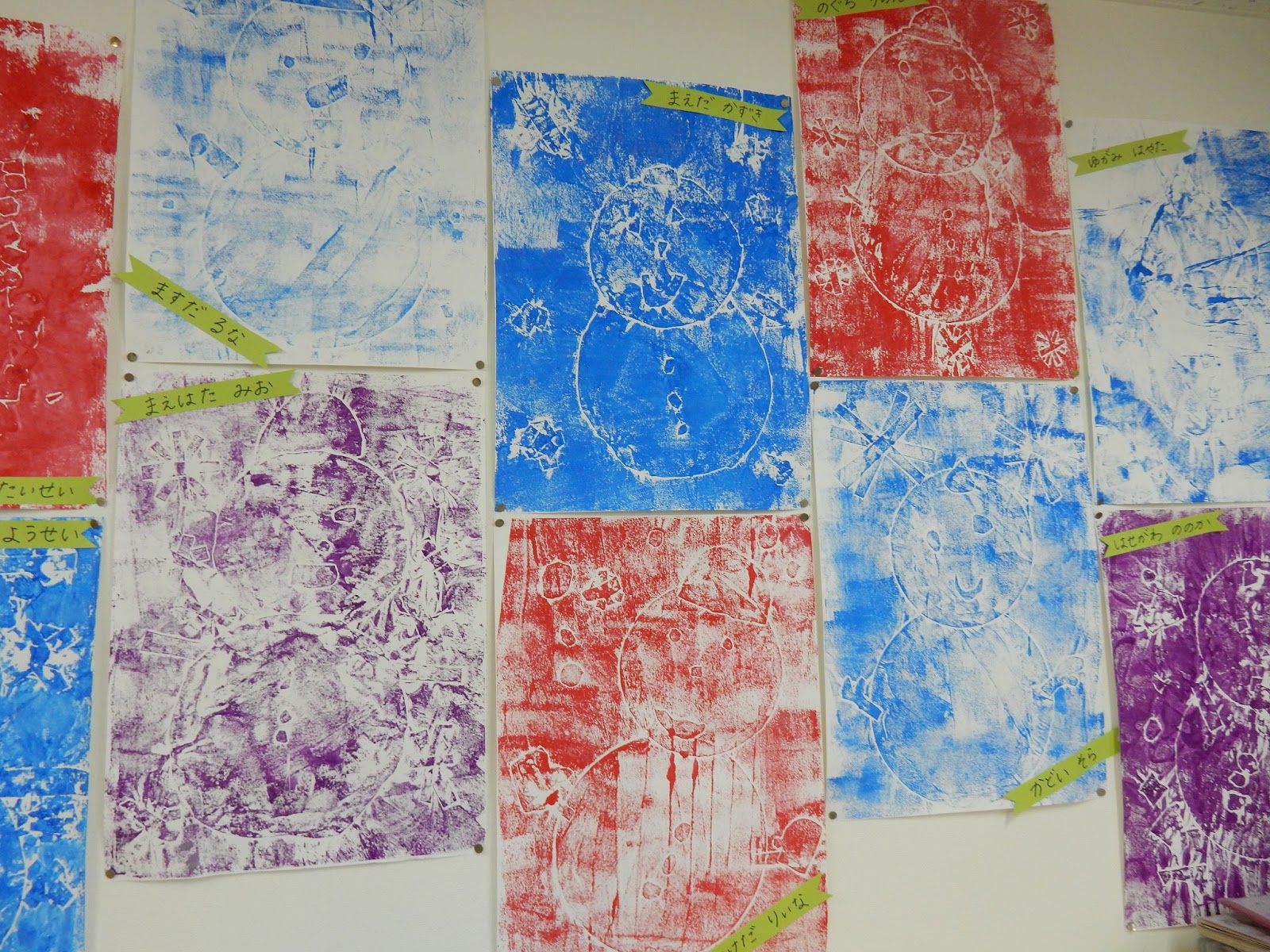ゆりさんのお部屋には、版画でつくった雪だるまができあがってました。大きな画用紙一面に大きな雪だるまがいっぱい!!