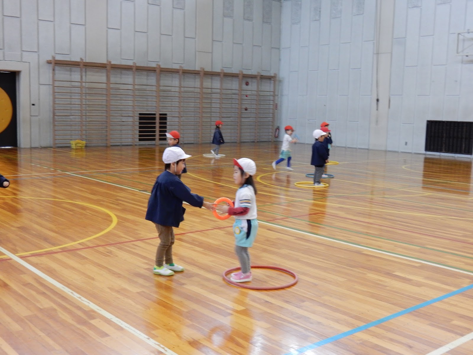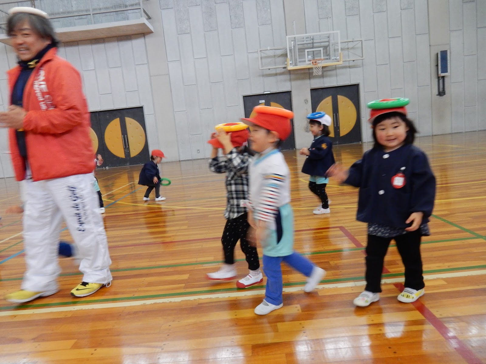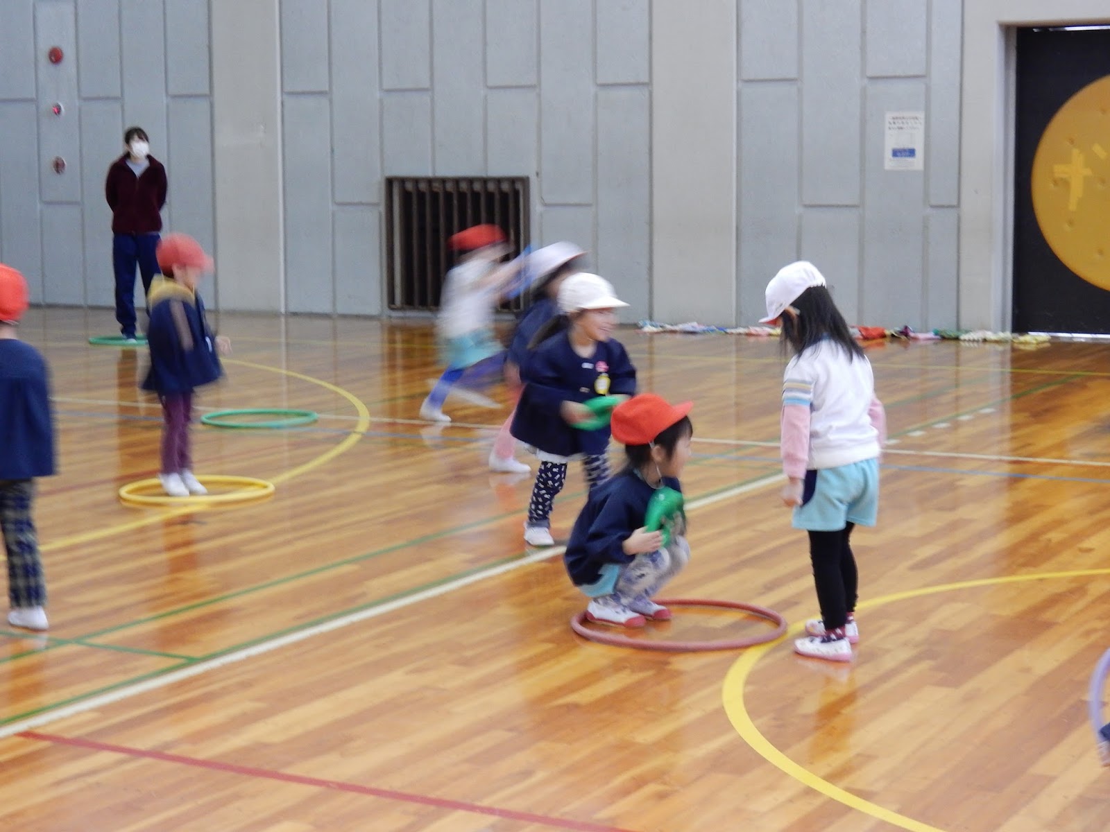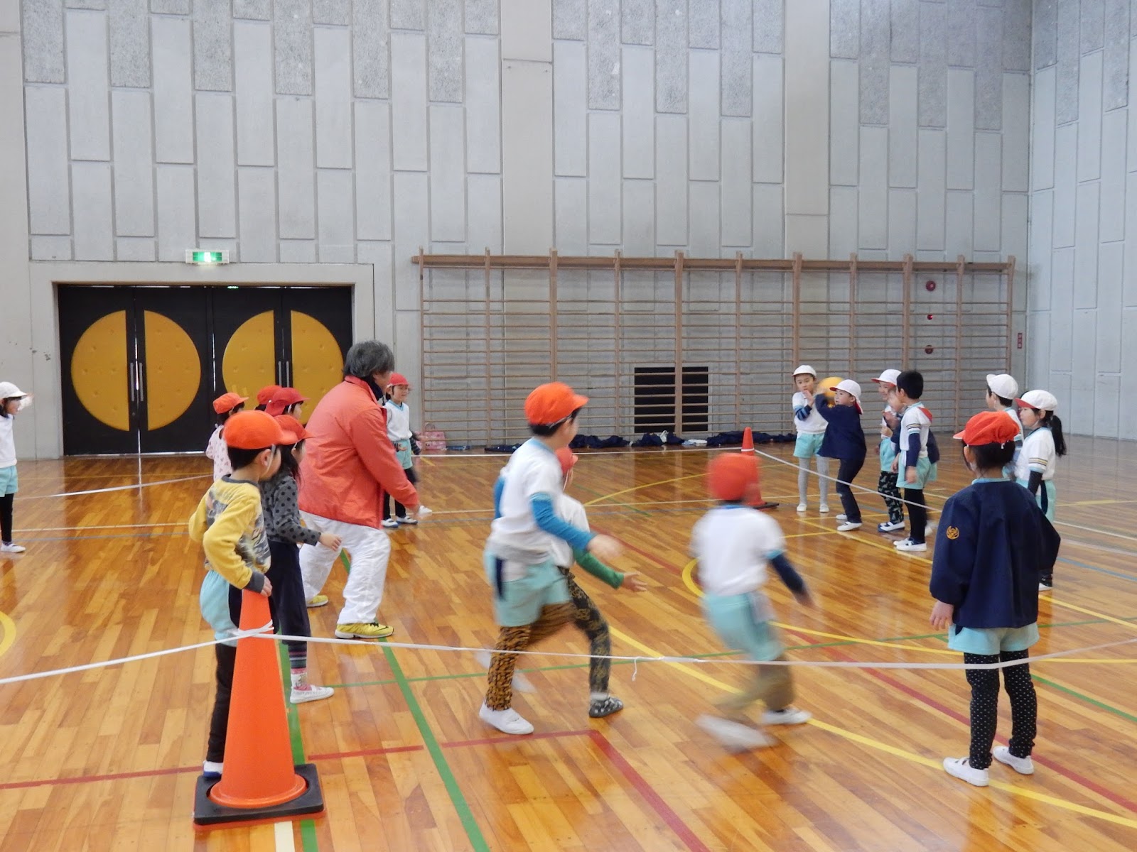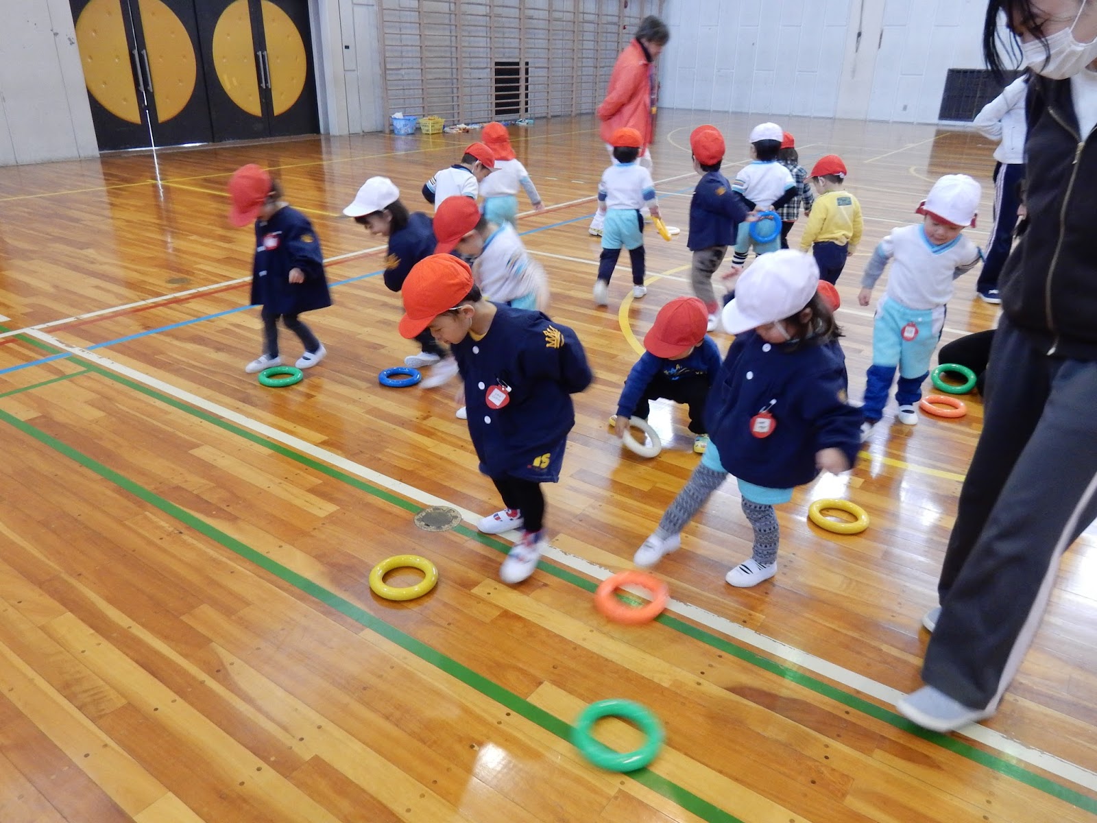 1番最初は、たんぽぽさん!この一年で色んな事が成長し、楽しく体操ができるようになってきました!バトンを車に見立てて次のお友達へ渡します。ルールがわかってくると、楽しいですよね!