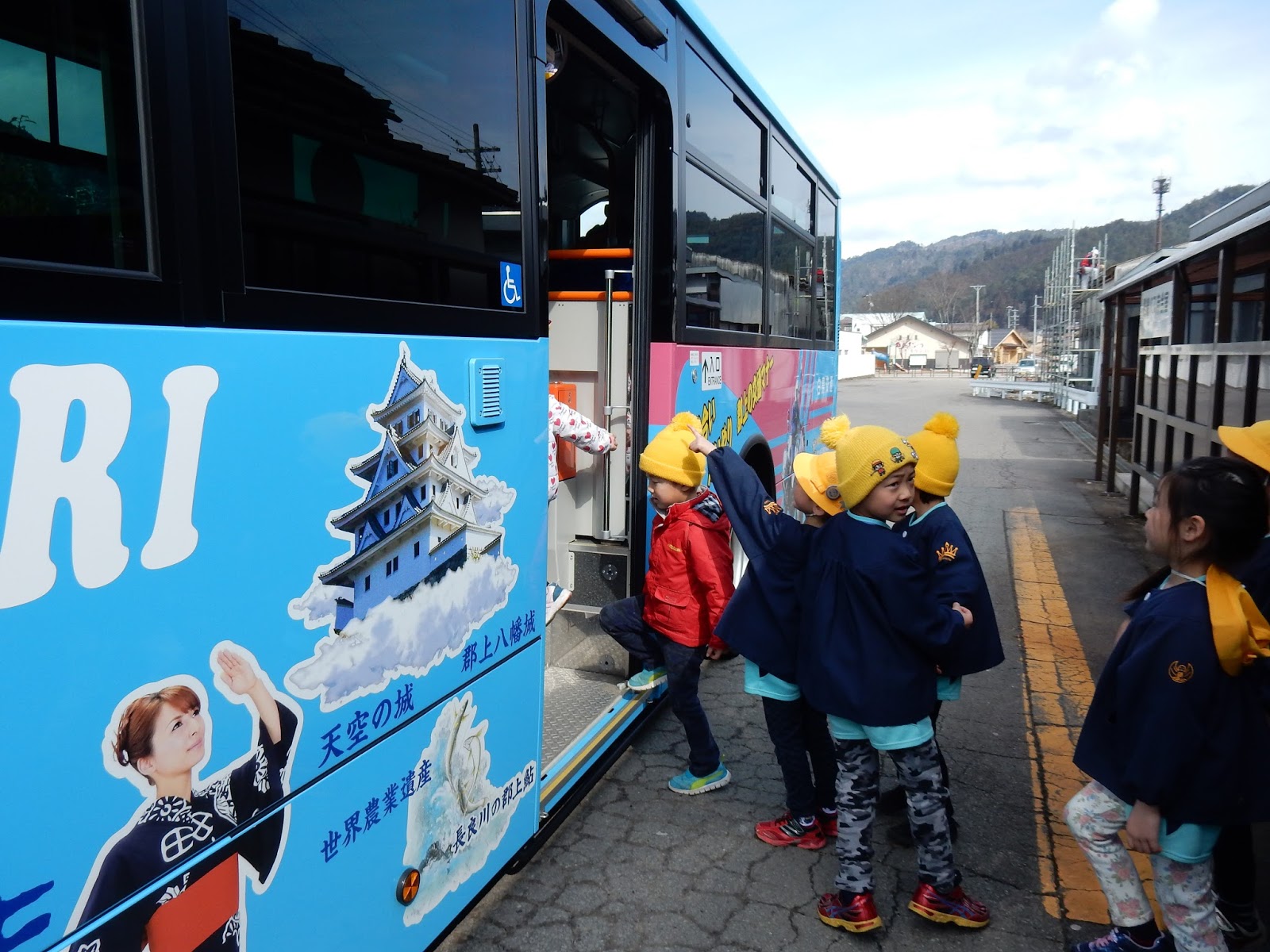 卒園を前に、ひまわりさんのみんなで”八幡観光”と”食品サンプル体験”など、楽しい思い出作りをしてきました!!!行きは、このバス!『白鳥駅』から路線バスに乗って、八幡の『城下町プラザ』まで行きましたよ~!
