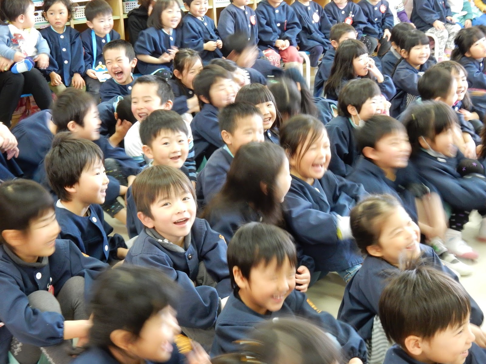 あいさつのお話なのですが、最後の終わりに”さようなら”ということばを”さ・よ・お・な・ら”の”お・な・ら”??が強調されて、ケラケラと笑いが広がり、とても楽しく見てました!