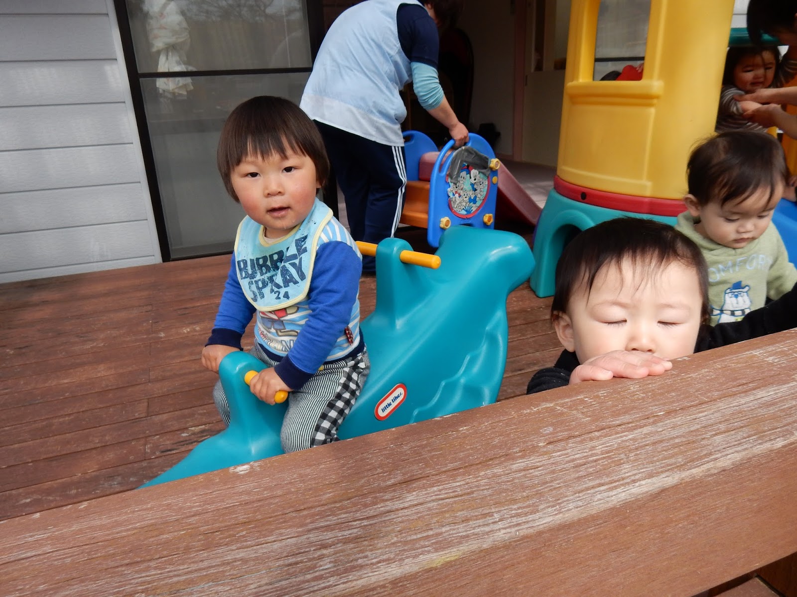 お天気のいい日は、お外で元気いっぱい遊んでま~す!!新しいお友達も、朝はちょっぴり泣いていたけど、すぐに泣きやみ一緒に遊んでま~す!!