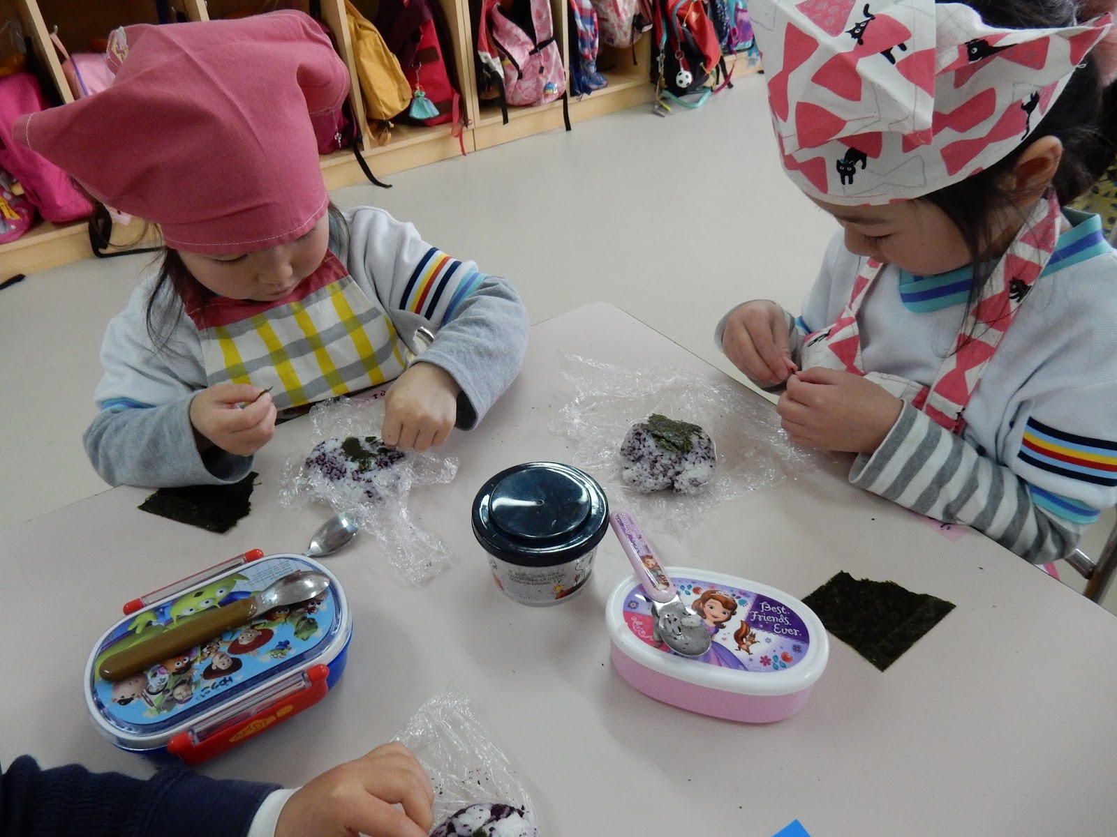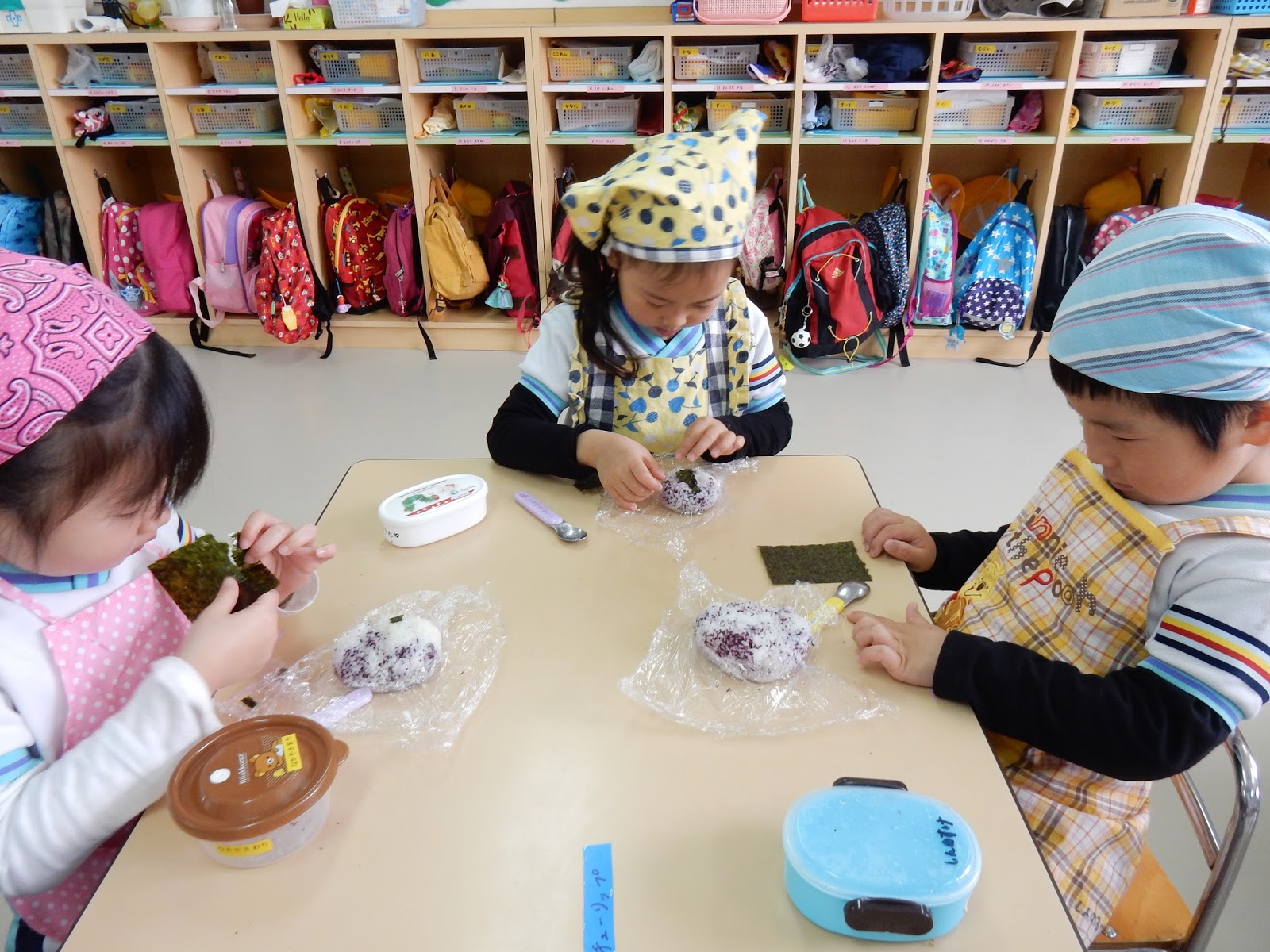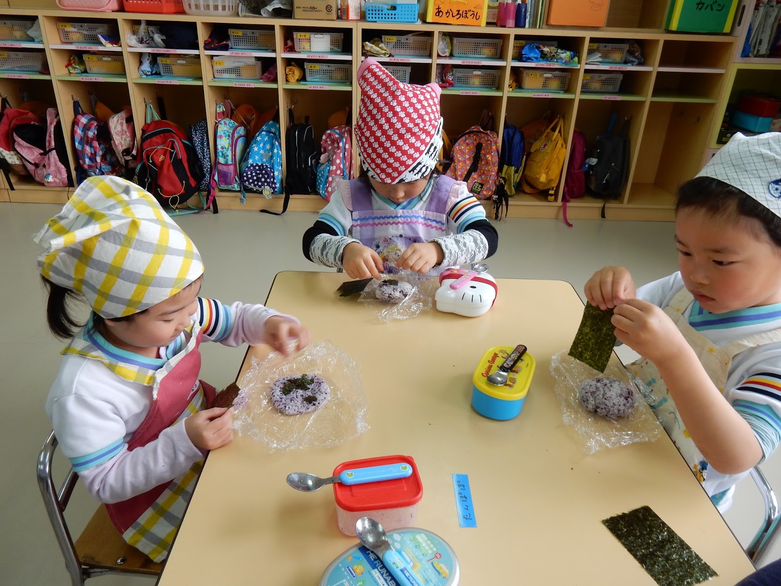じゃ~ん!!! ”てんとう虫おにぎり” これは、あい先生作です! さあ~、みんなものりをちぎっててんとう虫おにぎりをつくるよ~!!