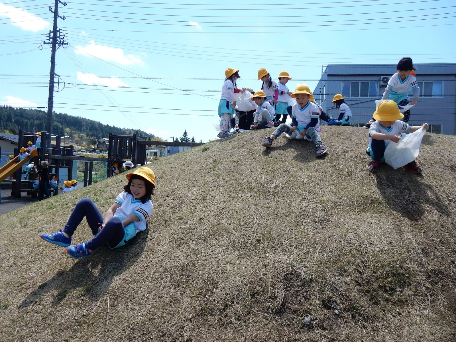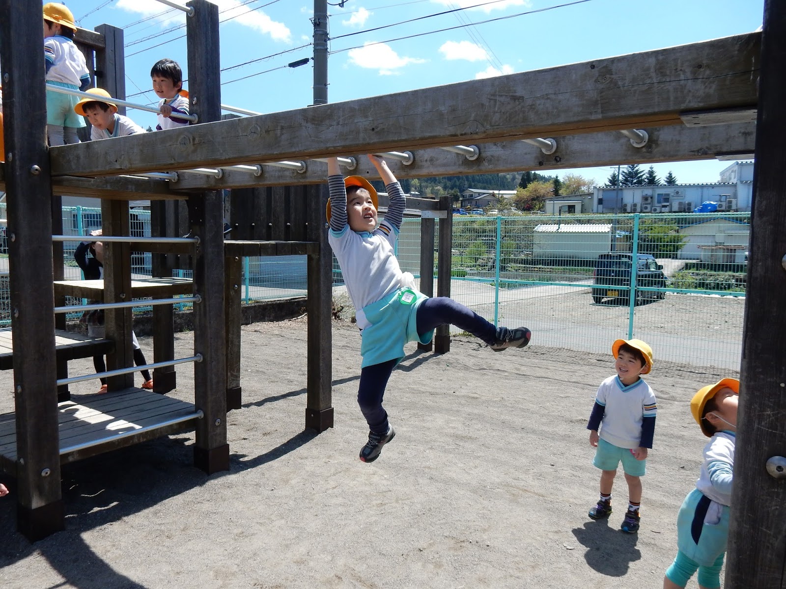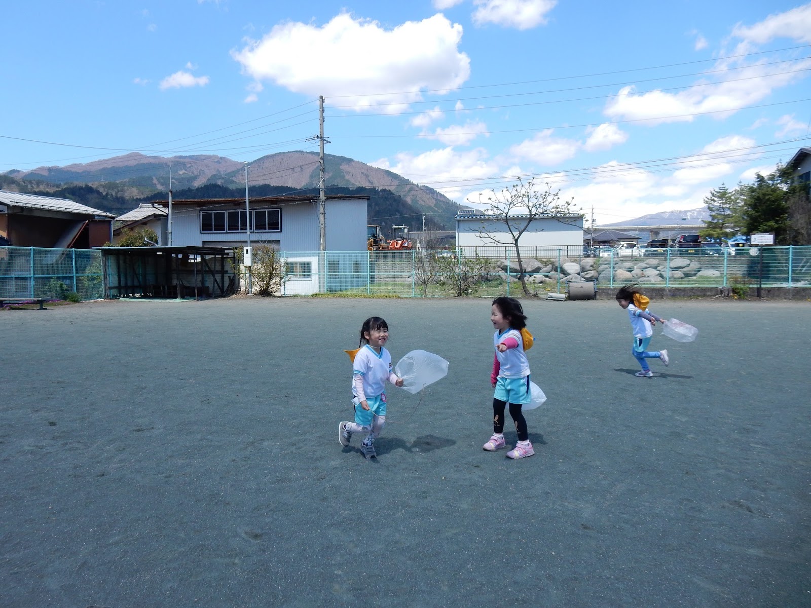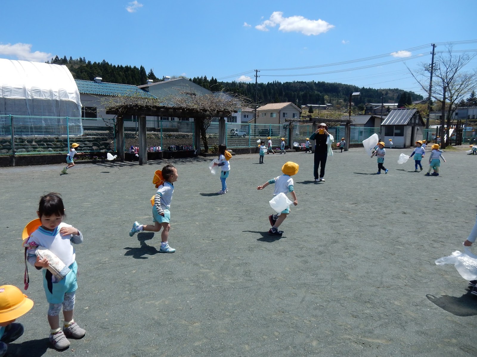 風が吹いてちょうどビニール袋がこいのぼりのように”パタパタ”となびいて、おもしろかったよ!走って遊んで、吹いて行くビニール袋を追いかけたりして・・・