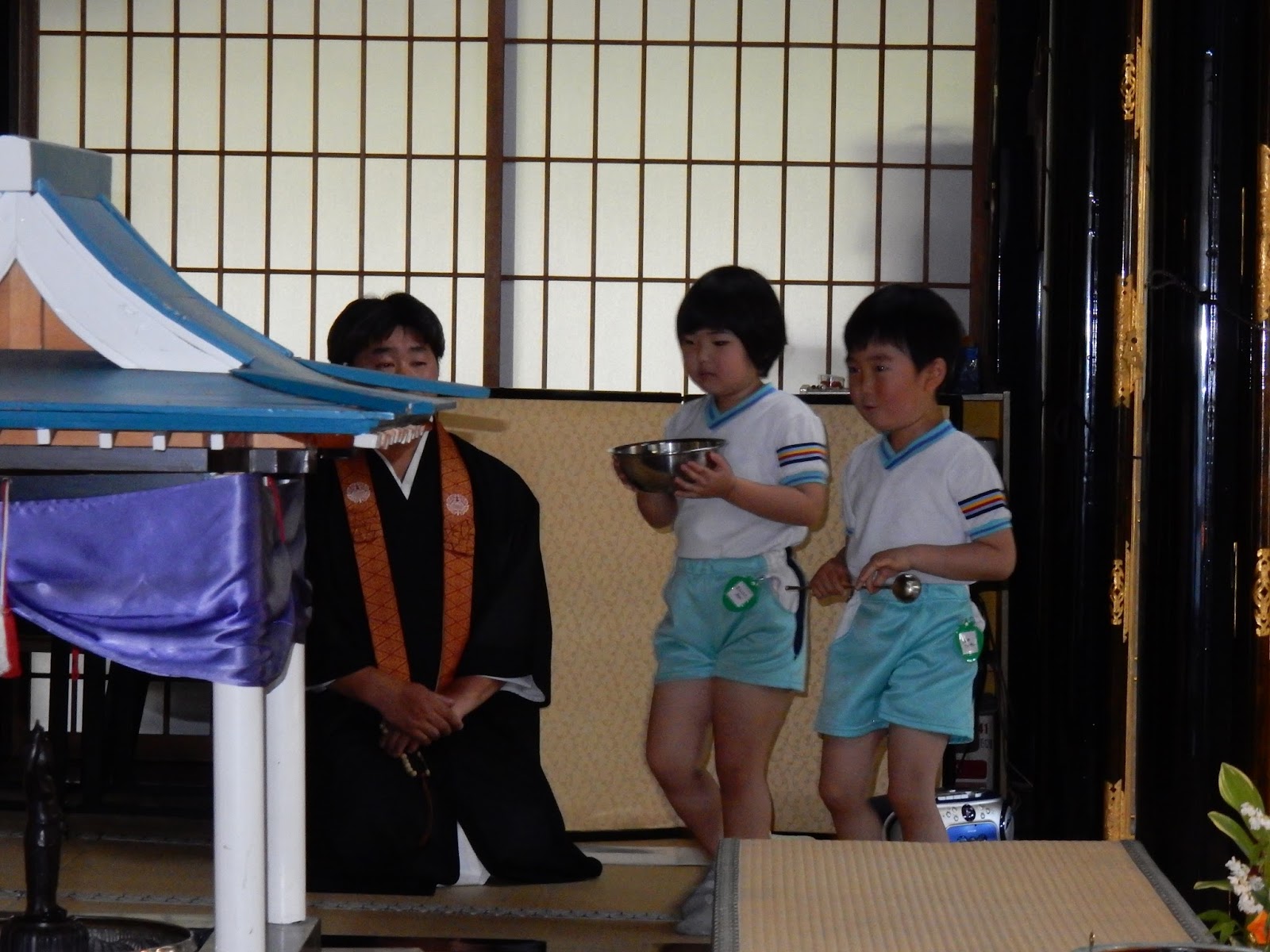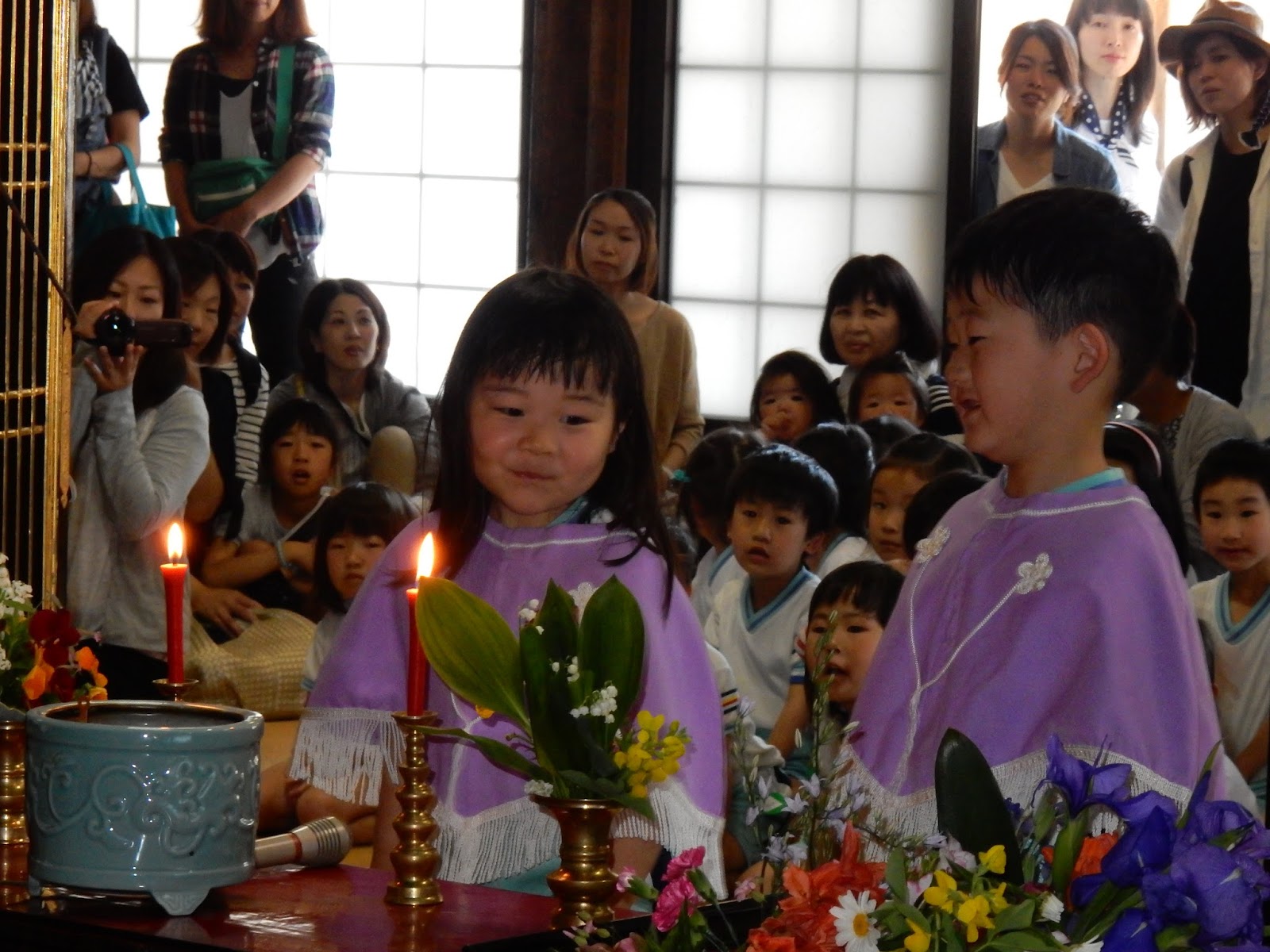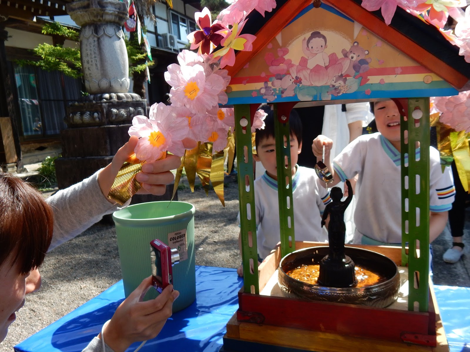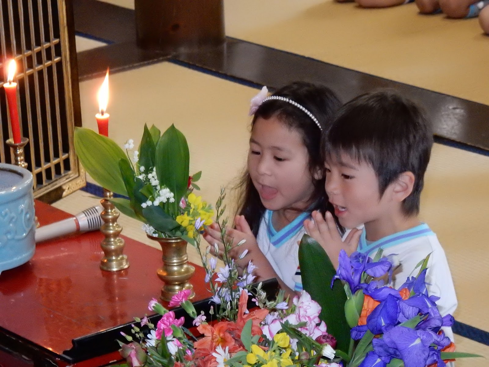 持ってきて頂いたお花を飾り、ののさまに甘茶を差し上げ、お父さん、お母さんと一緒でみんなとても嬉しそうでしたね。