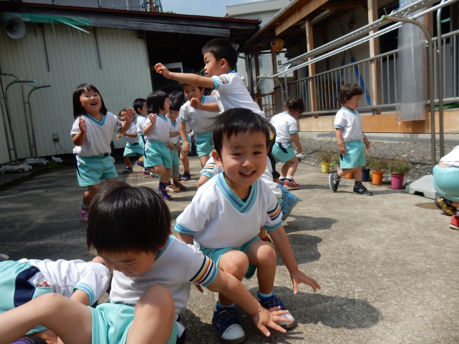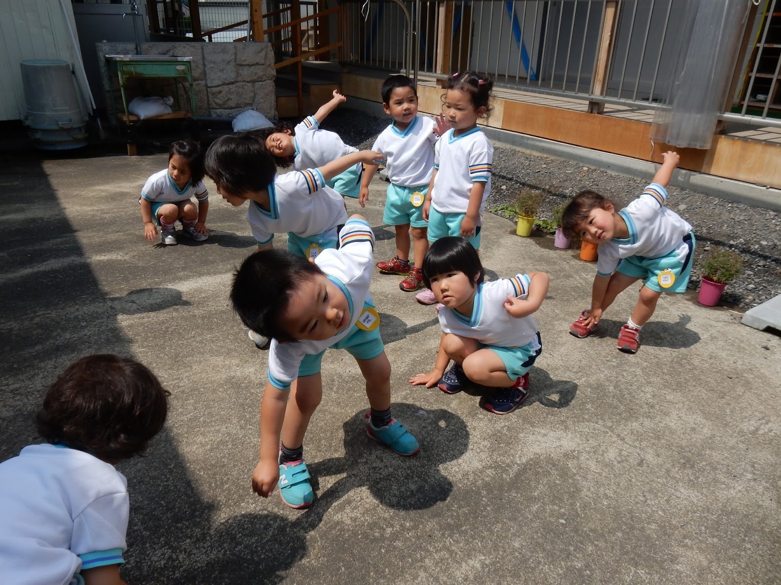 夜中に雨が降り、今朝の園庭はまだ濡れていて、朝の体操&マラソンは今日はなし・・・という事でしたが・・・・どんどんお日さまがキラキラと輝き、天気も良くなり・・・ 元気なたんぽぽさんは、中庭に集まって体操をしました!!