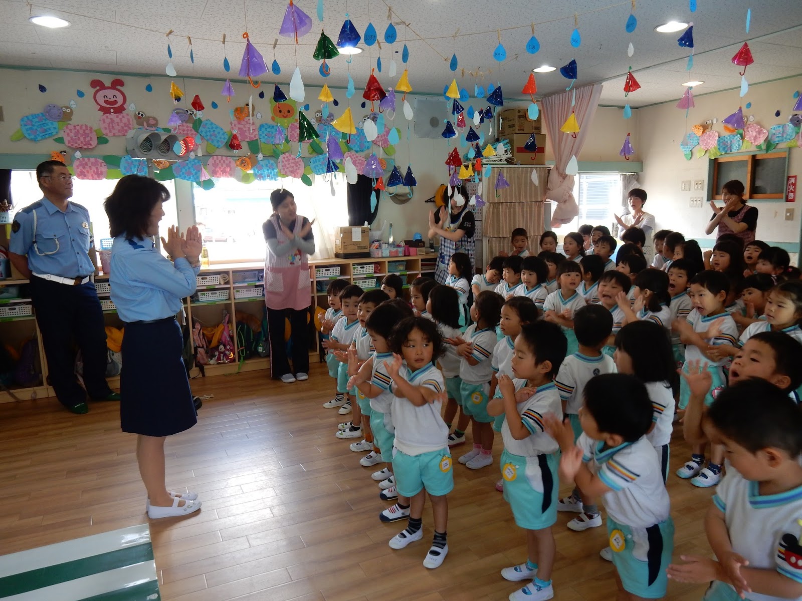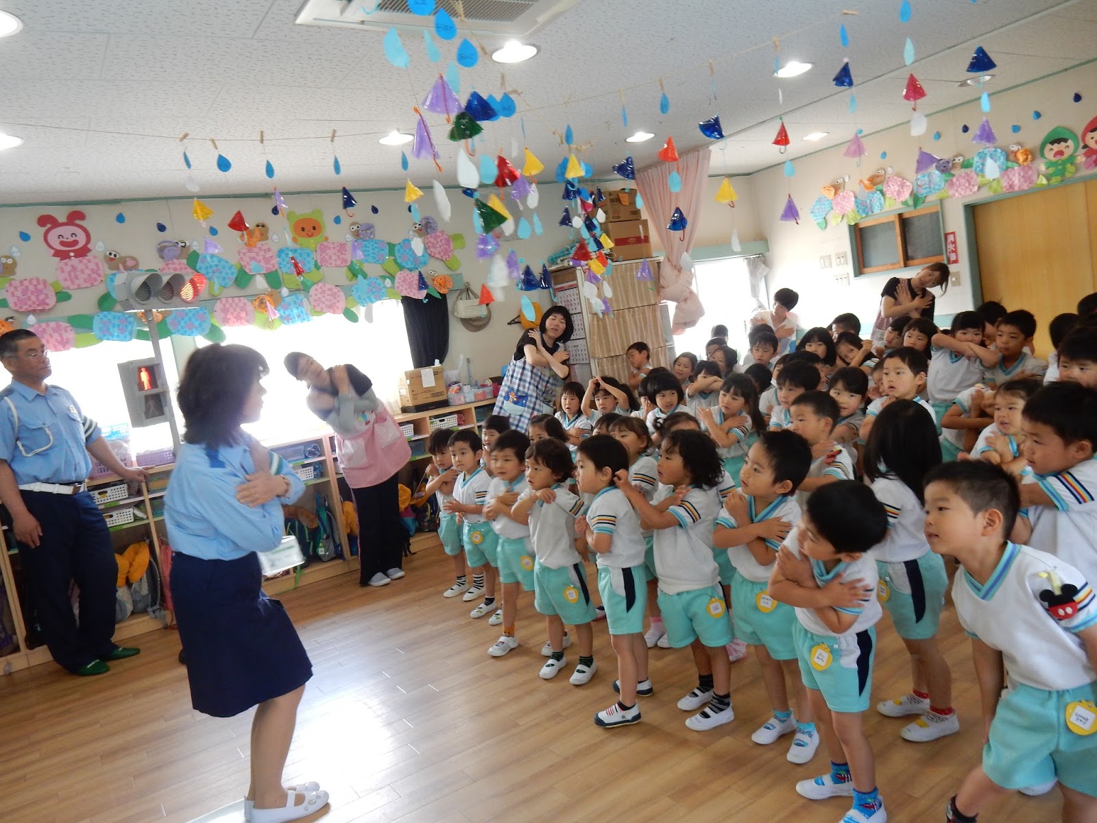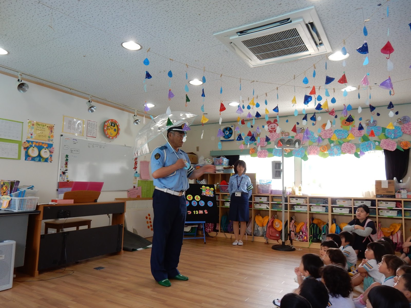 おまわりさんを目の前にして、ちょっぴり緊張しています・・・ おまわりさんが最初に「みんな!梅雨の時期に入りました。そうそう、こうやってね、チョンチョンとつけてね、ズルズル!!っと食べるつゆ!?・・・・・ではありませんよっ~」(笑) と、ちょっぴりユーモアなおまわりさん??のお話から始まりました!