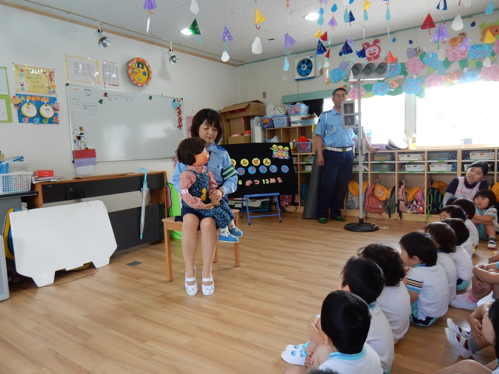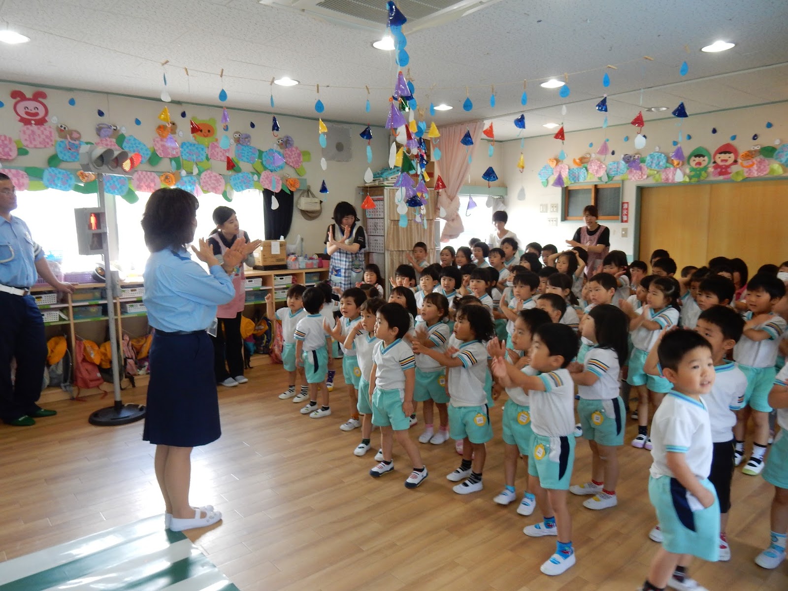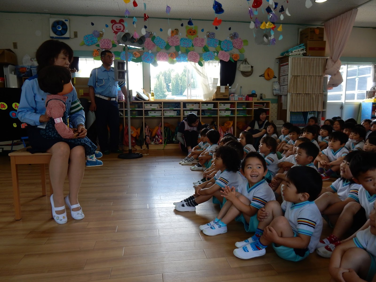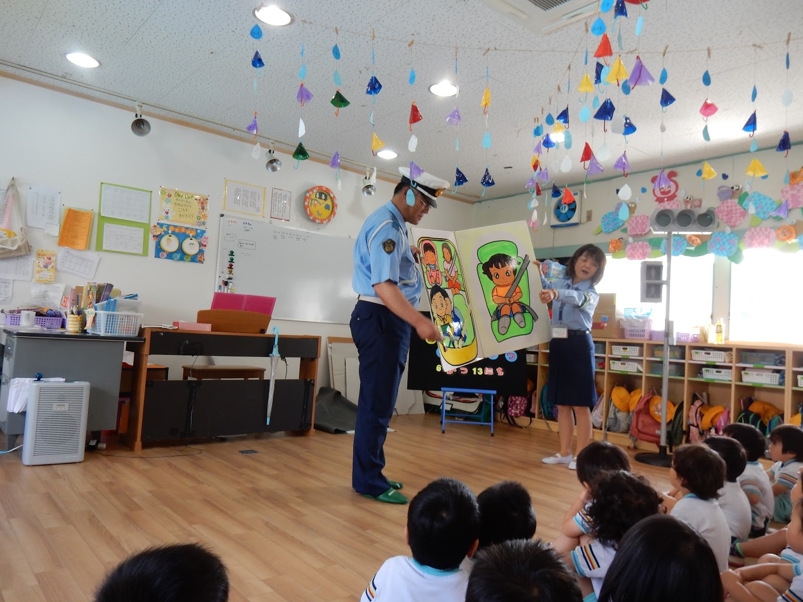 おまわりさんを目の前にして、ちょっぴり緊張しています・・・ おまわりさんが最初に「みんな!梅雨の時期に入りました。そうそう、こうやってね、チョンチョンとつけてね、ズルズル!!っと食べるつゆ!?・・・・・ではありませんよっ~」(笑) と、ちょっぴりユーモアなおまわりさん??のお話から始まりました!