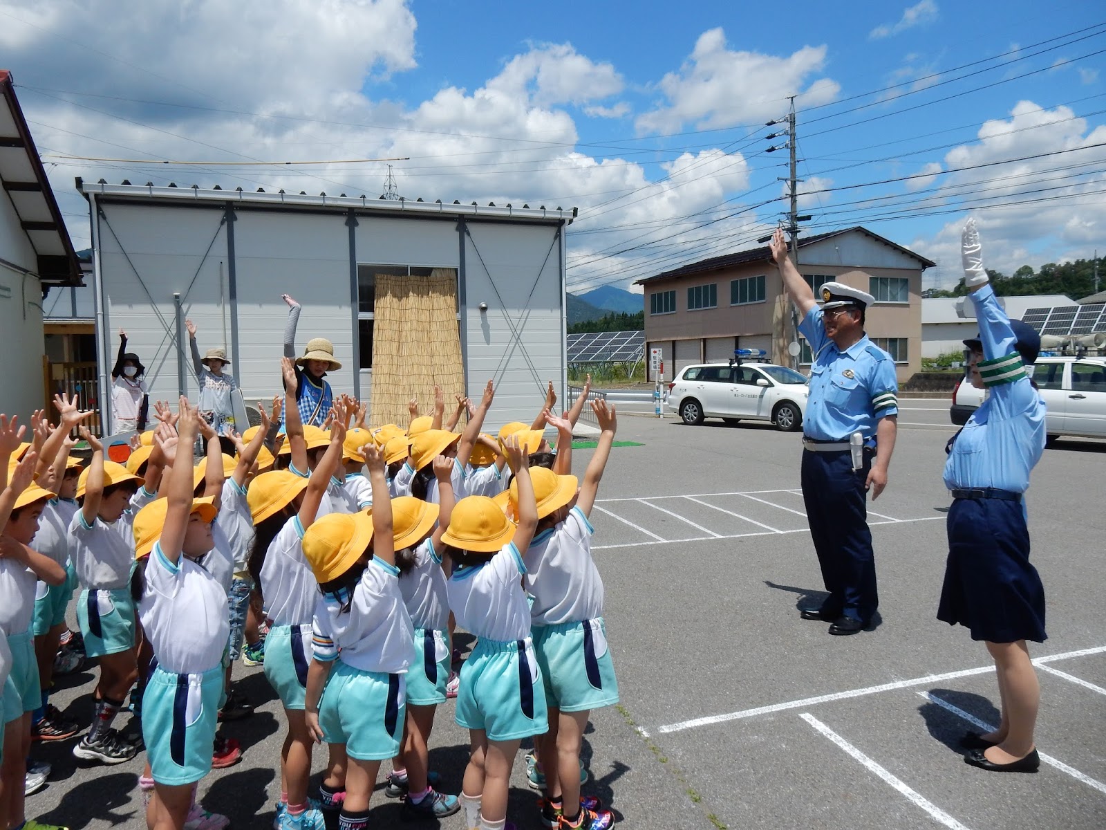 今日は、八幡警察署のおまわりさんと指導員さんに来てもらい、交通安全のお話を聞きました。