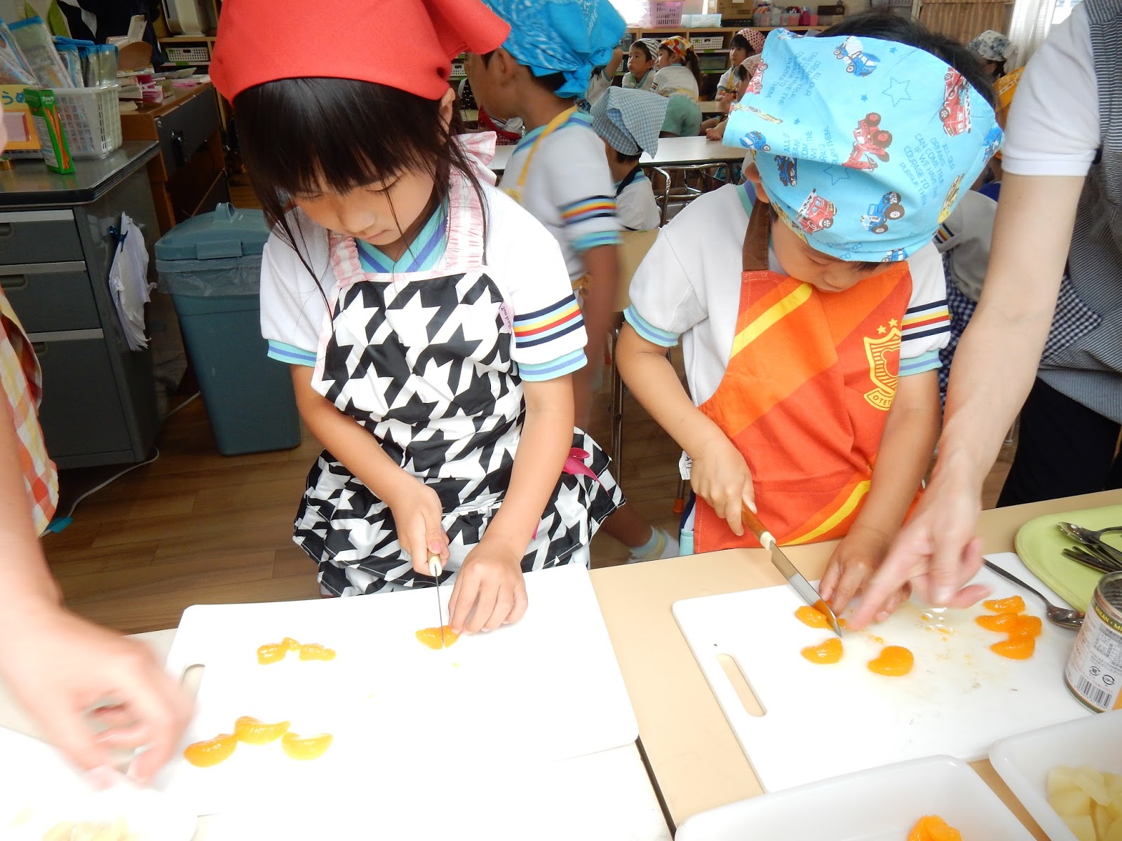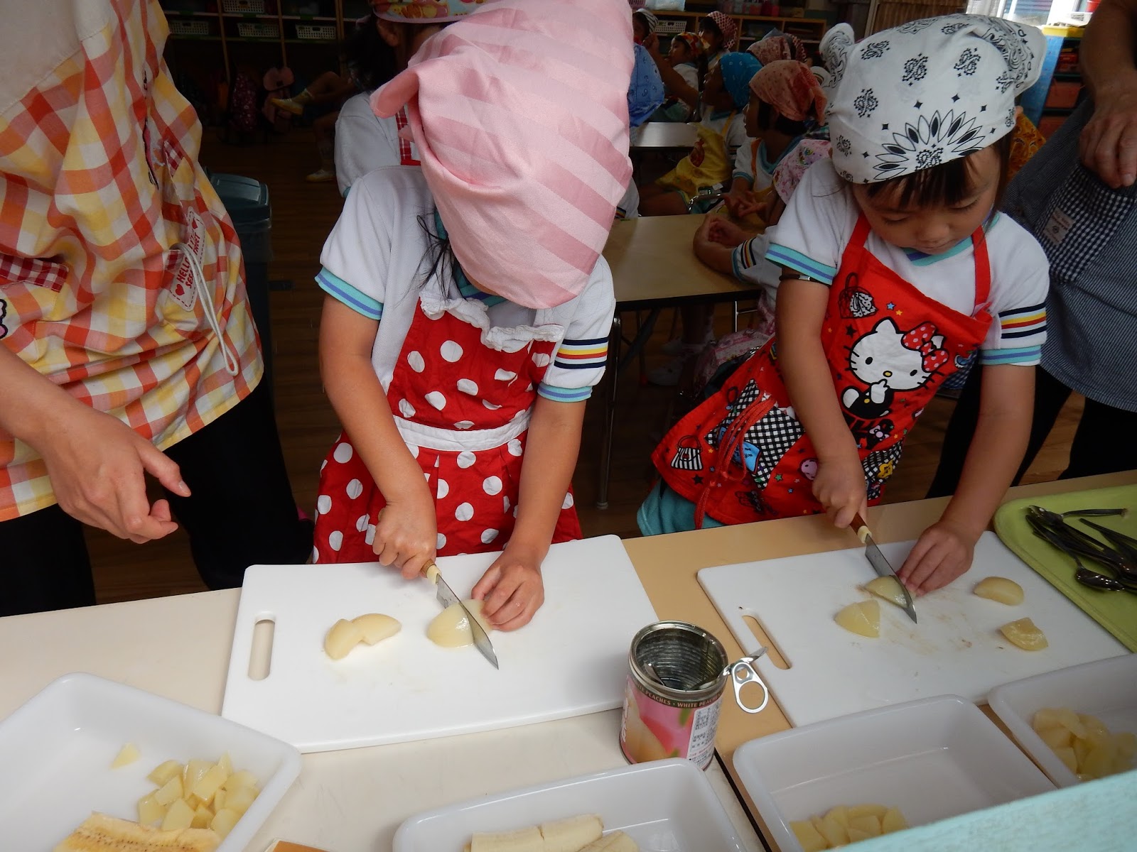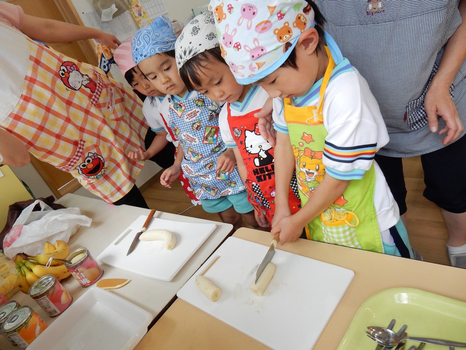 うんうん、左手でしっかりバナナを押さえて切っていますね!上手上手!!