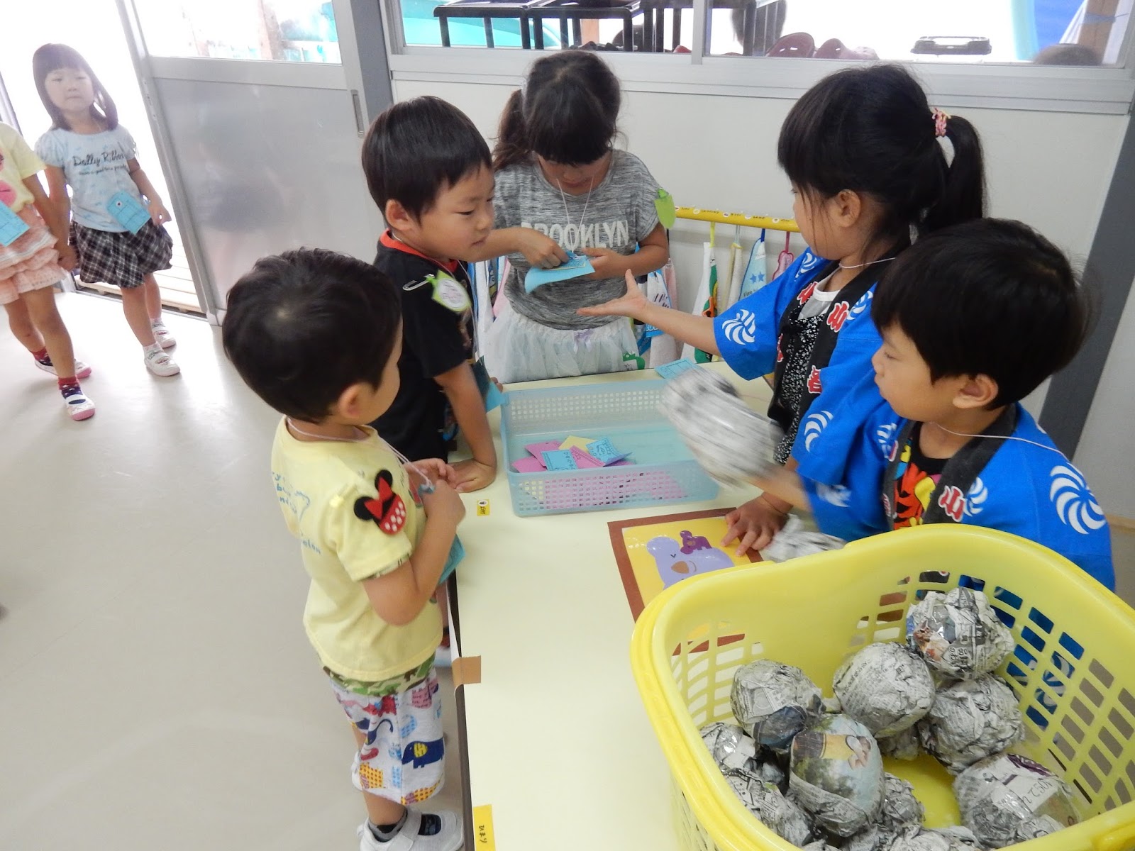 縦割りグループに分かれて、受付でチケットと交換です。 「はい!ここは受付で~す!チケットくださ~い!」