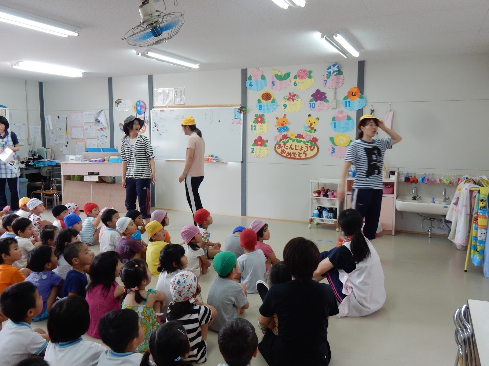 先生達の劇が始まりました! 子ども達が遊んでいて、先生が不審な人を見かけて子ども達に「暗号」を伝えて集めていますが、1人のお友達は暗号を聞かずに不審な人の方へと近づき・・・・