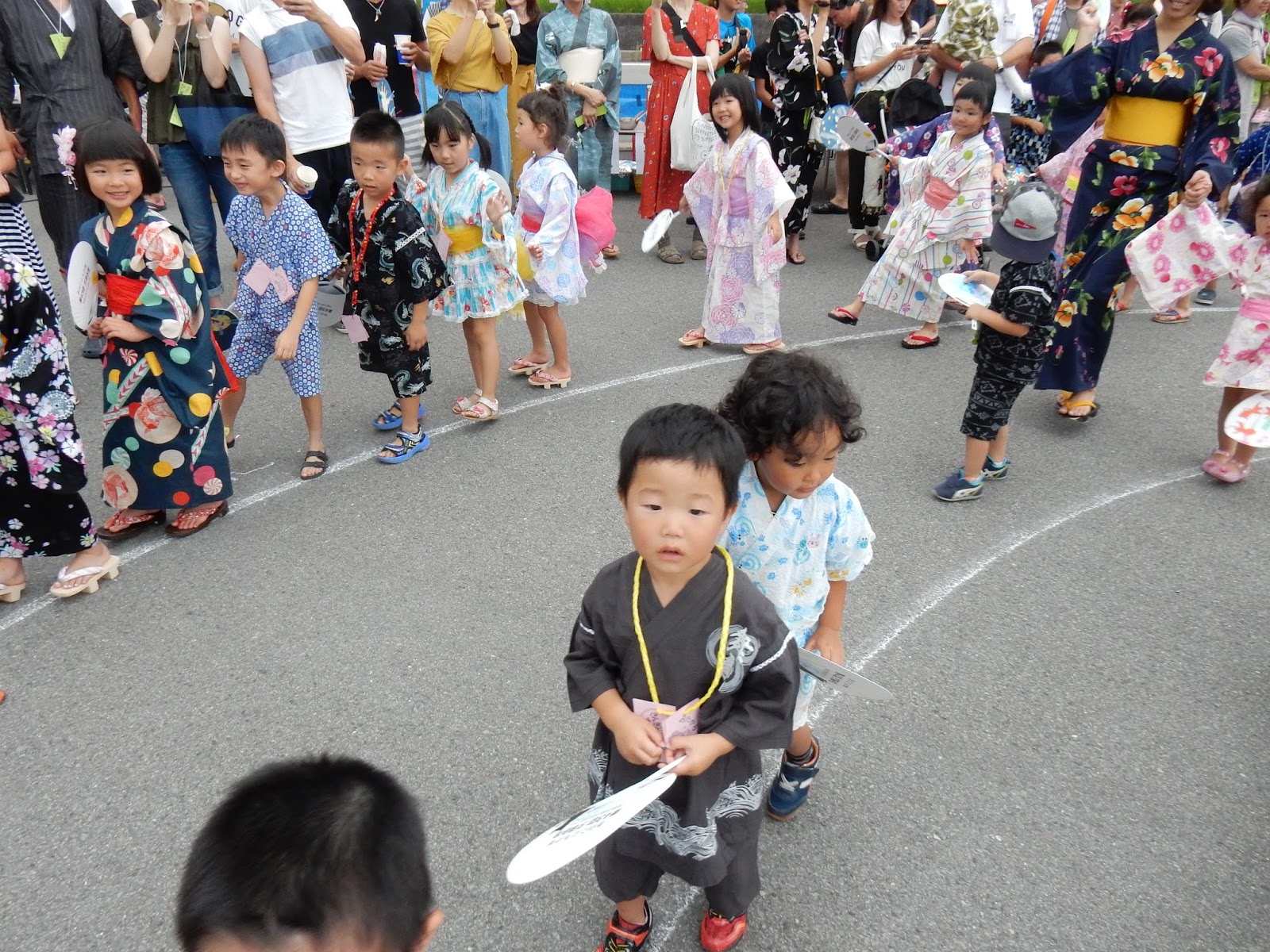 練習してきたやさい音頭と源助さん。『よろしく~!!』の掛け声も元気いっぱい!家族の皆さんに見てもらい、一緒に踊ることができて、とっても嬉しそうな子ども達。クラスごとに作ったうちわも見ていただけたでしょうか。夏らしいうちわや、子ども達が大好きなキャラクターが題材になっていたんです。工夫が沢山の素敵なうちわでしたね!