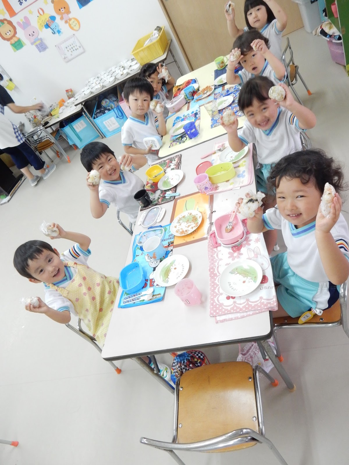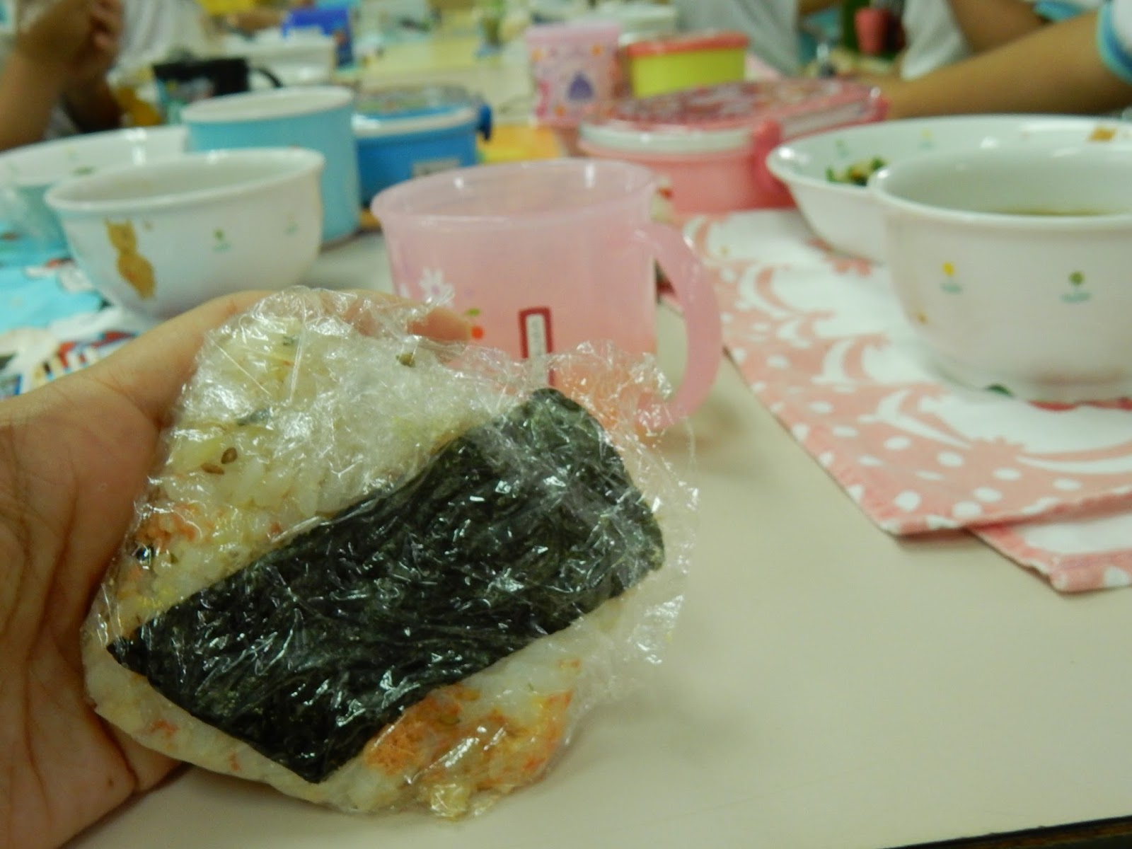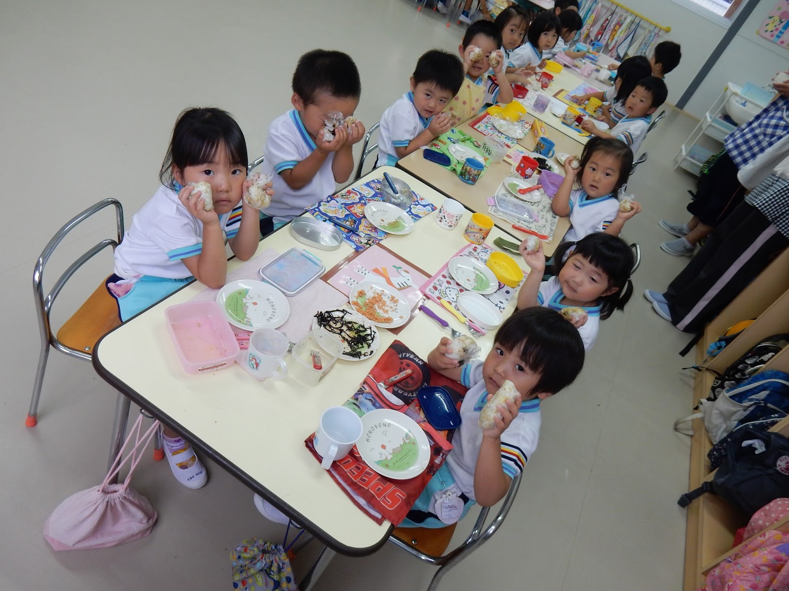 のりを巻いて(のせて)出来上がりです!『せんせ~!のりはのりだけで食べるね!』というお友達がいたり、せっかく握ったおにぎりから具だけだして海苔ではさんで食べたりと、食べ方も色々!『あぁぁ!!せっかく作ったのに~』なぁんて言いながら笑っている先生に、美味しそうな笑顔でお返事してくれるたんぽぽさん。とにかくみんな楽しそう!自分で作るって、どうしてこんなに美味しいんでしょう!