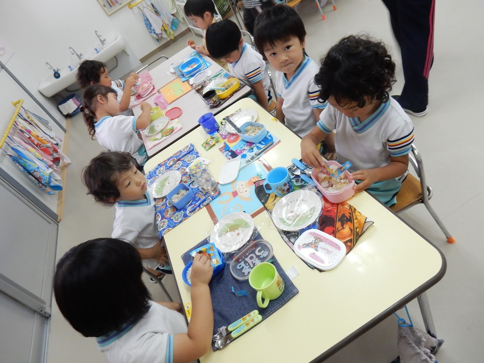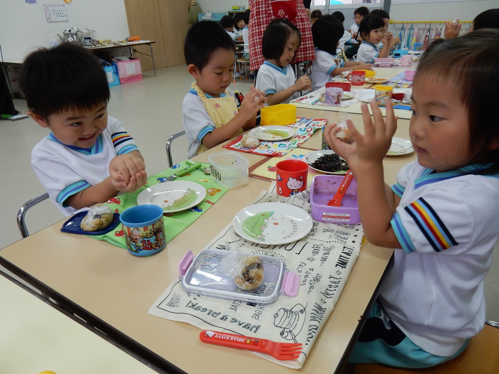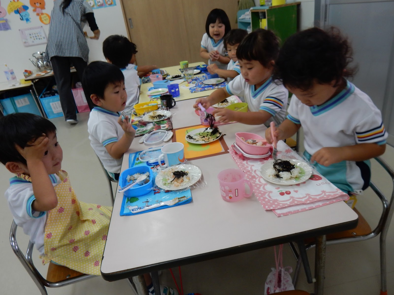 のりを巻いて(のせて)出来上がりです!『せんせ~!のりはのりだけで食べるね!』というお友達がいたり、せっかく握ったおにぎりから具だけだして海苔ではさんで食べたりと、食べ方も色々!『あぁぁ!!せっかく作ったのに~』なぁんて言いながら笑っている先生に、美味しそうな笑顔でお返事してくれるたんぽぽさん。とにかくみんな楽しそう!自分で作るって、どうしてこんなに美味しいんでしょう!