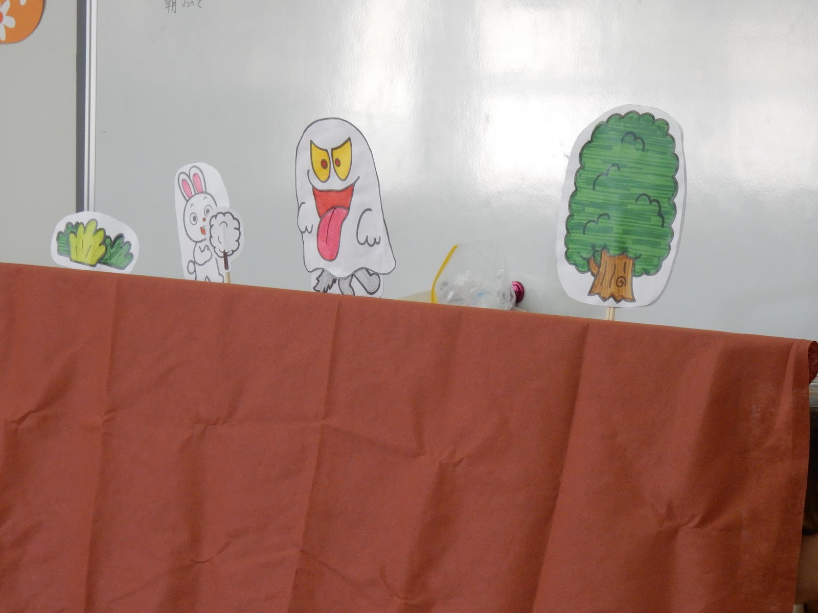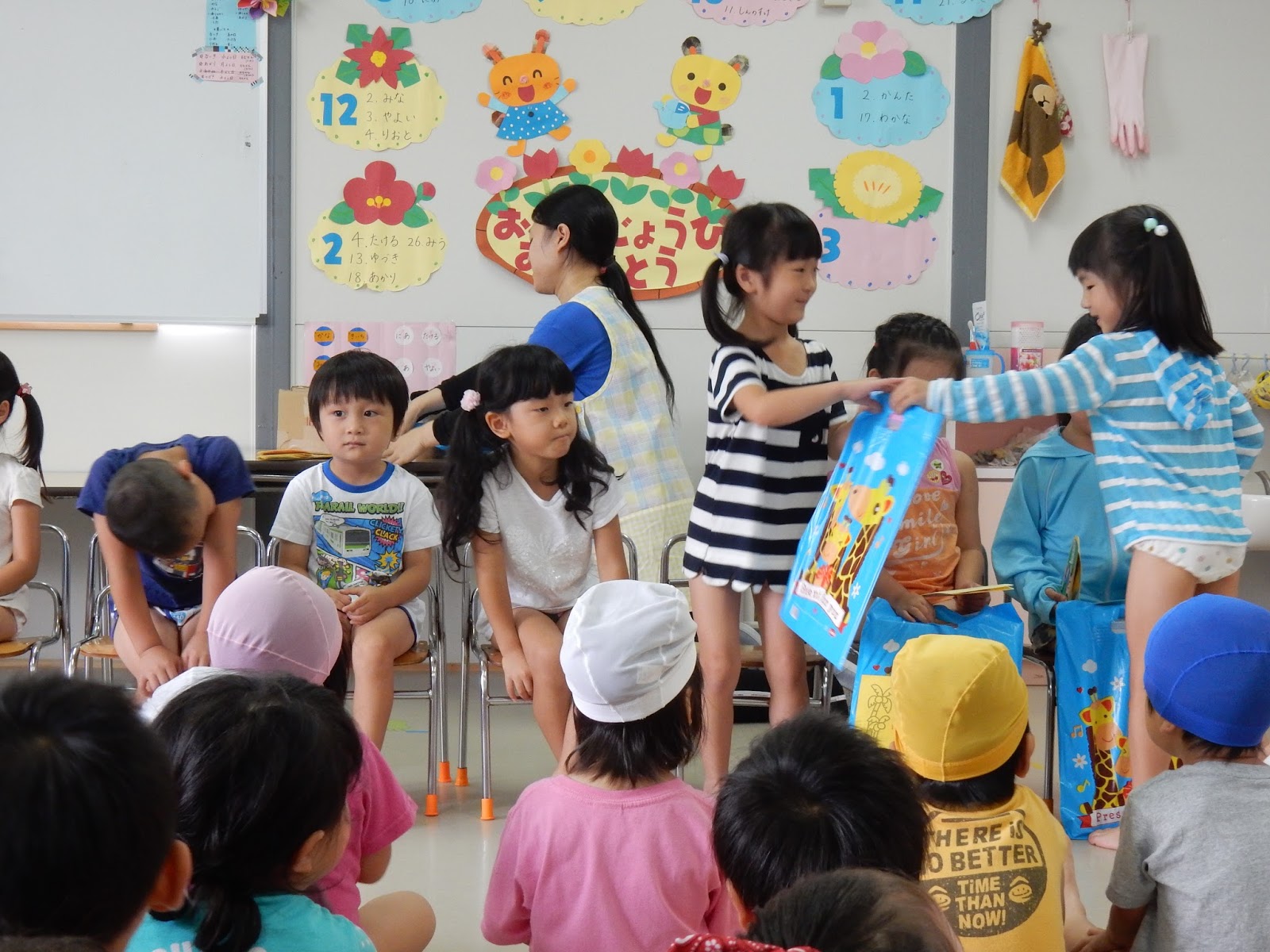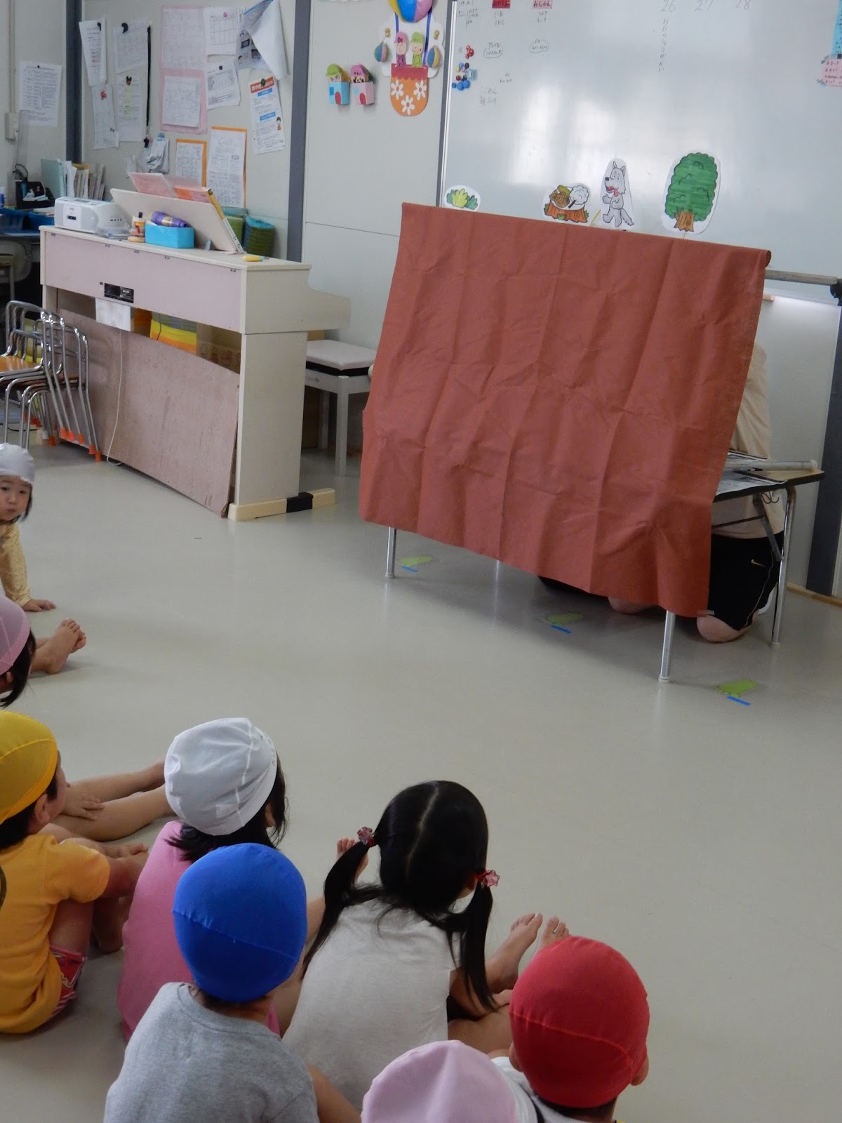 あやか先生と、みなみ先生がお話をしてくれました。夏らしく、おばけが出てくるお話だったんですが、子ども達は、おばけがだーいすき…♡出てくるたびにキャ~キャ~笑って、おばけをやっつけたり、動物さんを応援したり。中には、ちょっぴり怖がって、お隣りに座っていた先生の膝にピタッと手をおいているお友達も♡そんな姿も可愛いですよね!おばけさんの正体はオオカミさん!みんなが仲良くなると、ホッとして笑顔をみせていましたよ!