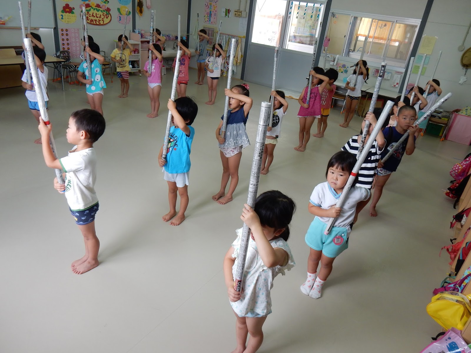 ゆり組さんの旗の練習は、新聞を丸めた棒を持って、基本の姿勢を練習中!ピシッと伸びた背中、おでこと、おへそに棒をしっかりくっつけて、あい先生の指示する手をしっかり見ている姿は、もうすでに形になっています!指示に合わせて『はい!』と返事をしながら素早く棒を傾けたり、もとに戻したり。ゆりさんのやる気に満ち溢れた雰囲気を感じてきました!