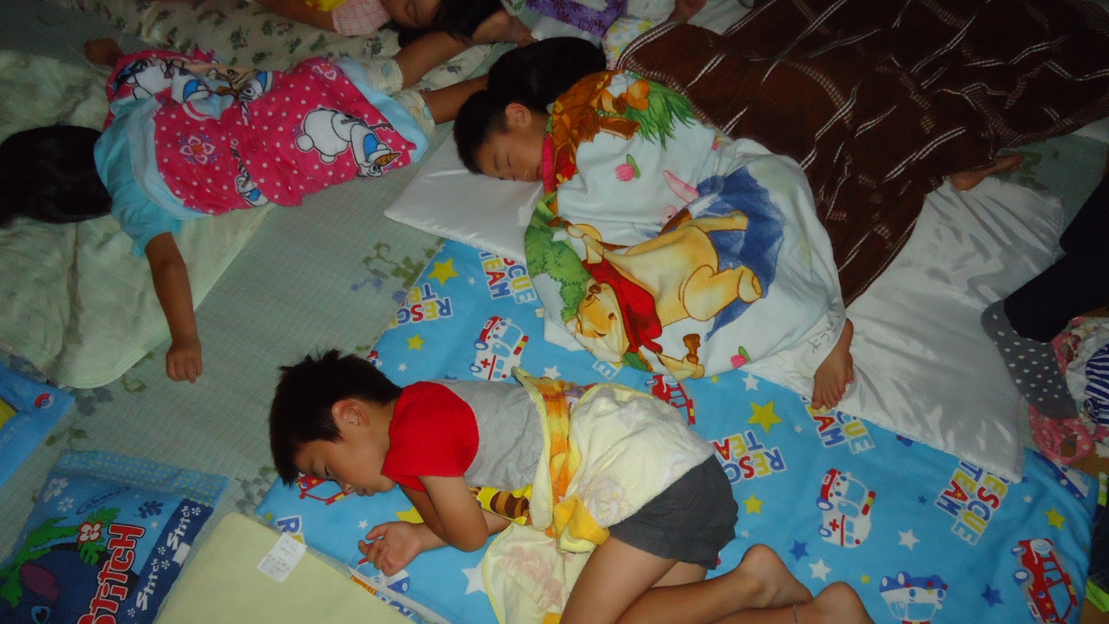 就寝準備をして、お布団に横になる頃には、お化けが怖くて涙していた子も笑顔になり、みんなでおやすみなさい!!こんな風に、お友達と一緒に眠る経験って、貴重ですよね!疲れてすぐに寝てしまう子もいましたが、逆にテンションが上って、なかなか眠れない子も(笑)それでもみんな眠りにつき、無事に1日目を終えました。どんな夢を見ているのかな。