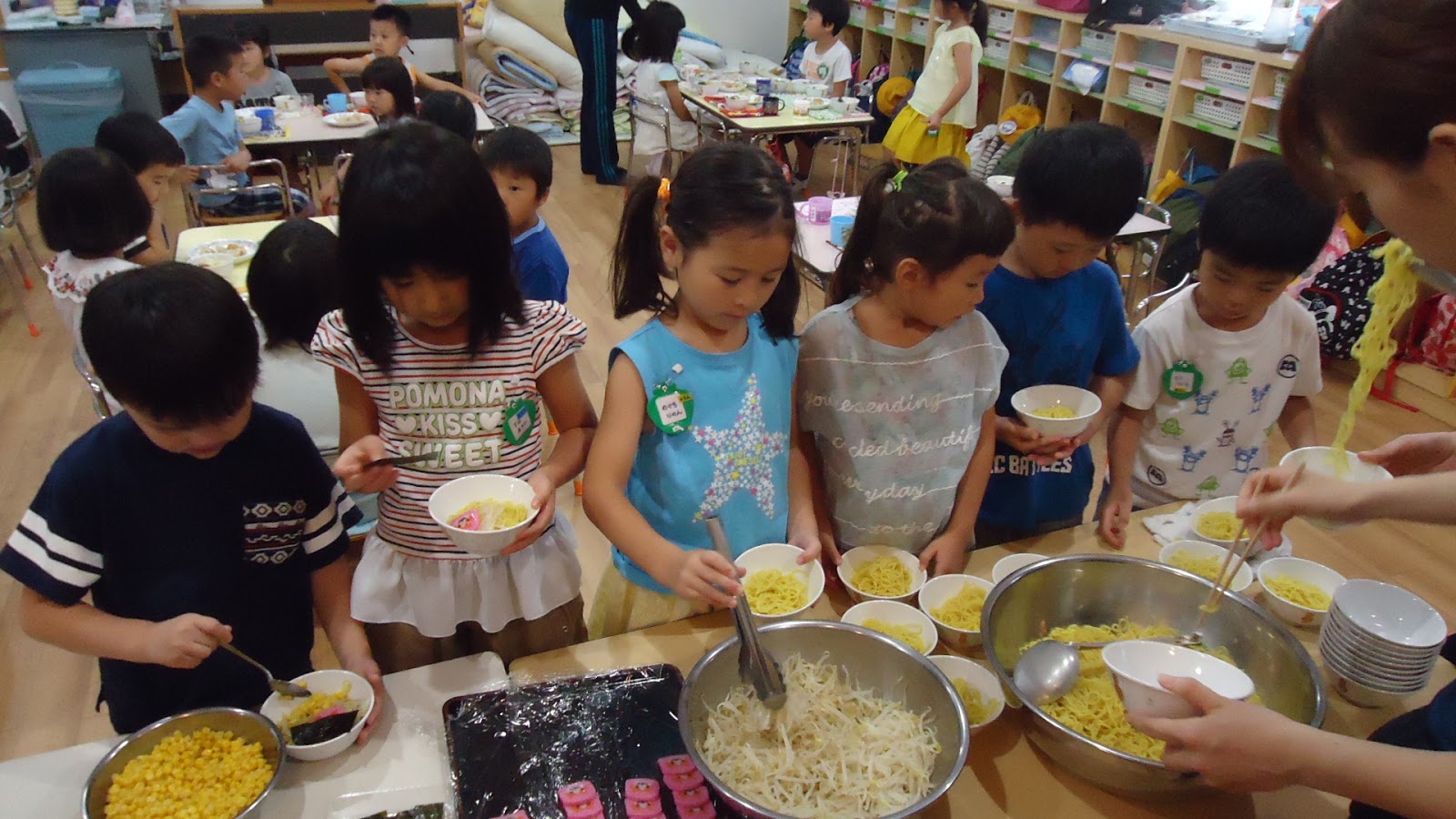 みんながお出かけしている間に、園では給食の先生が美味しい夕ご飯を作っていてくれました。今年のひまわりさんからのリクエストは、ラーメンセット!!トッピング自由だったので、バイキング形式でオリジナルのラーメン作りを楽しみました。たくさん遊んで、モリモリ食べましたよ!
