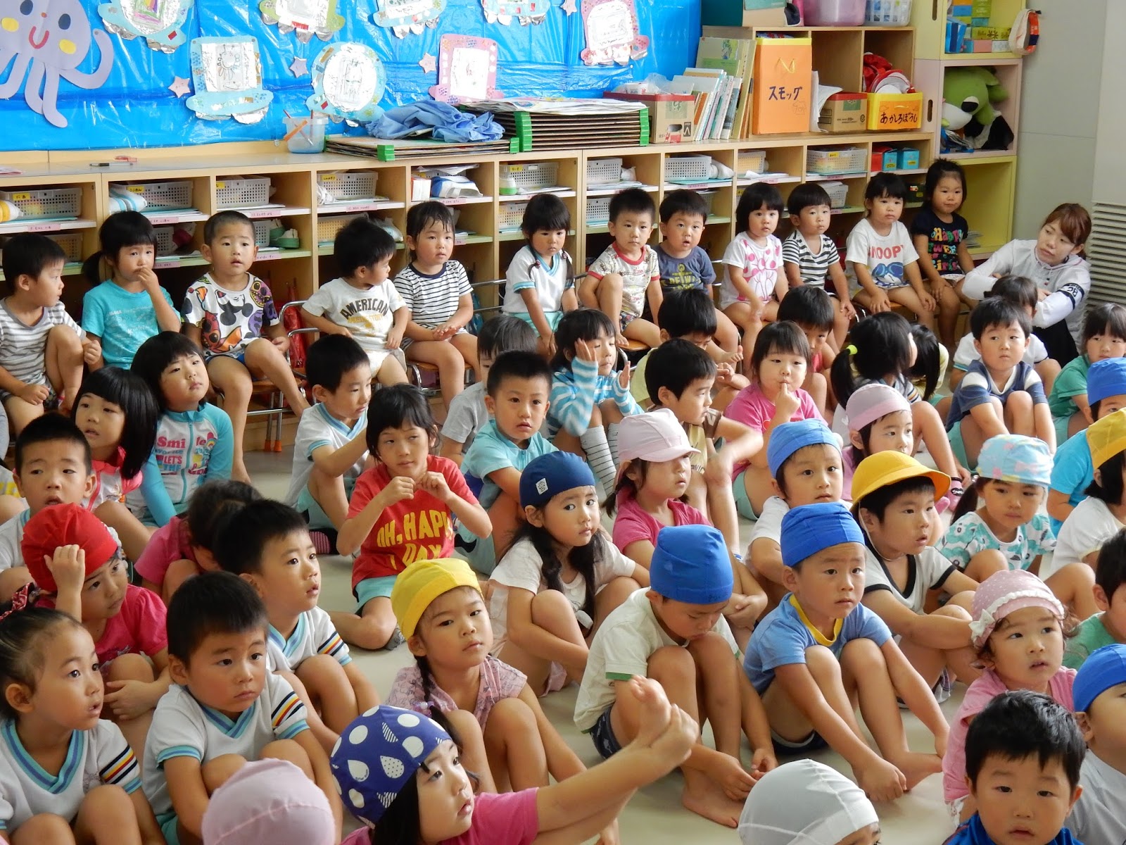 今日は、1学期の終業式でした。明日から夏休みに入るという事で、みんなで集まって、園長先生のお話を聞きました。