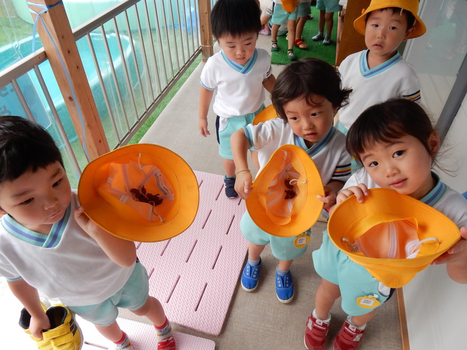 外遊びから帰ってきたたんぽぽさん。帽子の中には、たくさんのセミの抜け殻♪『たーくさん見つけたよ~!!!』と見せてくれました!!