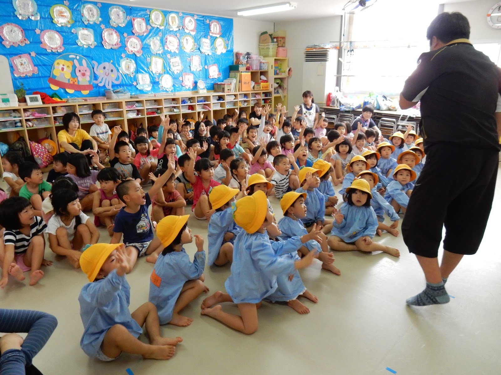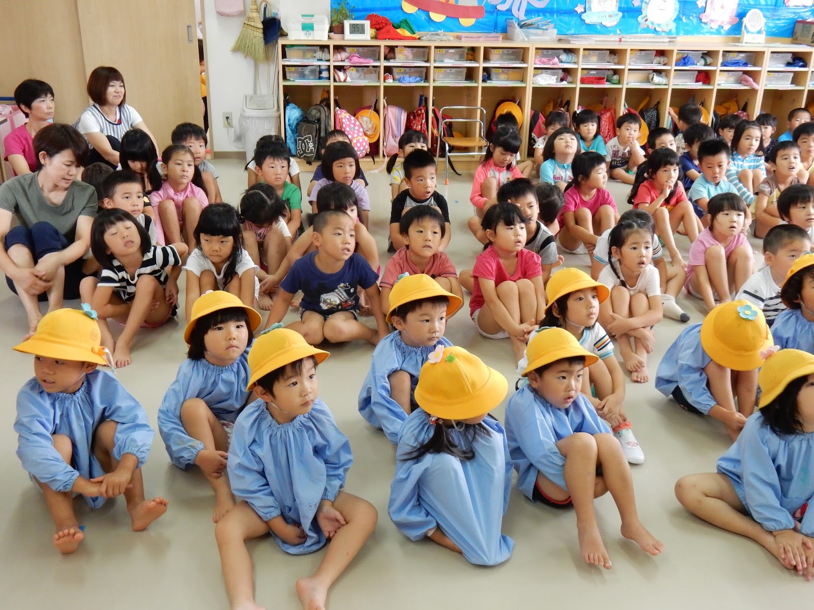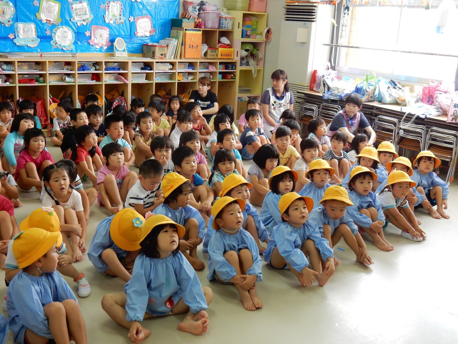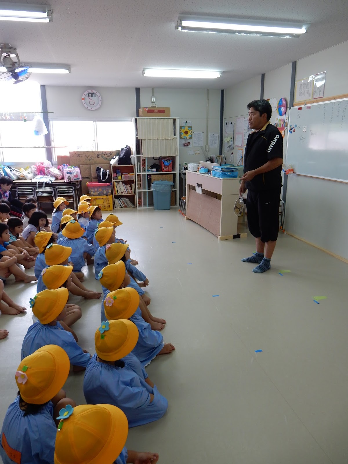 今日から2学期が始まりました!みなさん、夏休みはどんなふうに過ごしましたか??真っ黒に日焼けをして『海に入ったよ!』と話してくれる子、『映画を見たよ!』 『おじいちゃん、おばあちゃんのうちに泊まったよ!』いろんな話を聞いていると、楽しかったんだろうなぁと、感じました。さぁ、長い2学期のスタートです。園長先生のお話を聞くことから始まります。