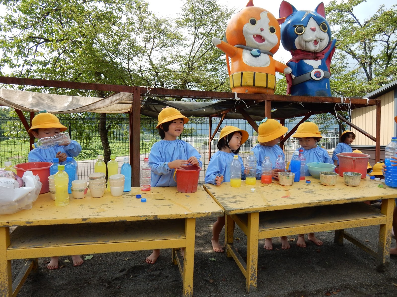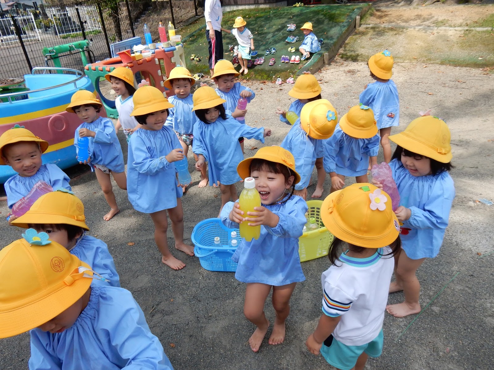 実際に、みんなも1本ずつペットボトルを持ってフリフリ…『あか!!』 『こっちはあお!』と嬉しそうに見せてくれました。お友達の色水を分けてもらって色が変わると、またビックリ!!カラフルなペットボトルが並ぶと、ジュース屋さんの開店です♪