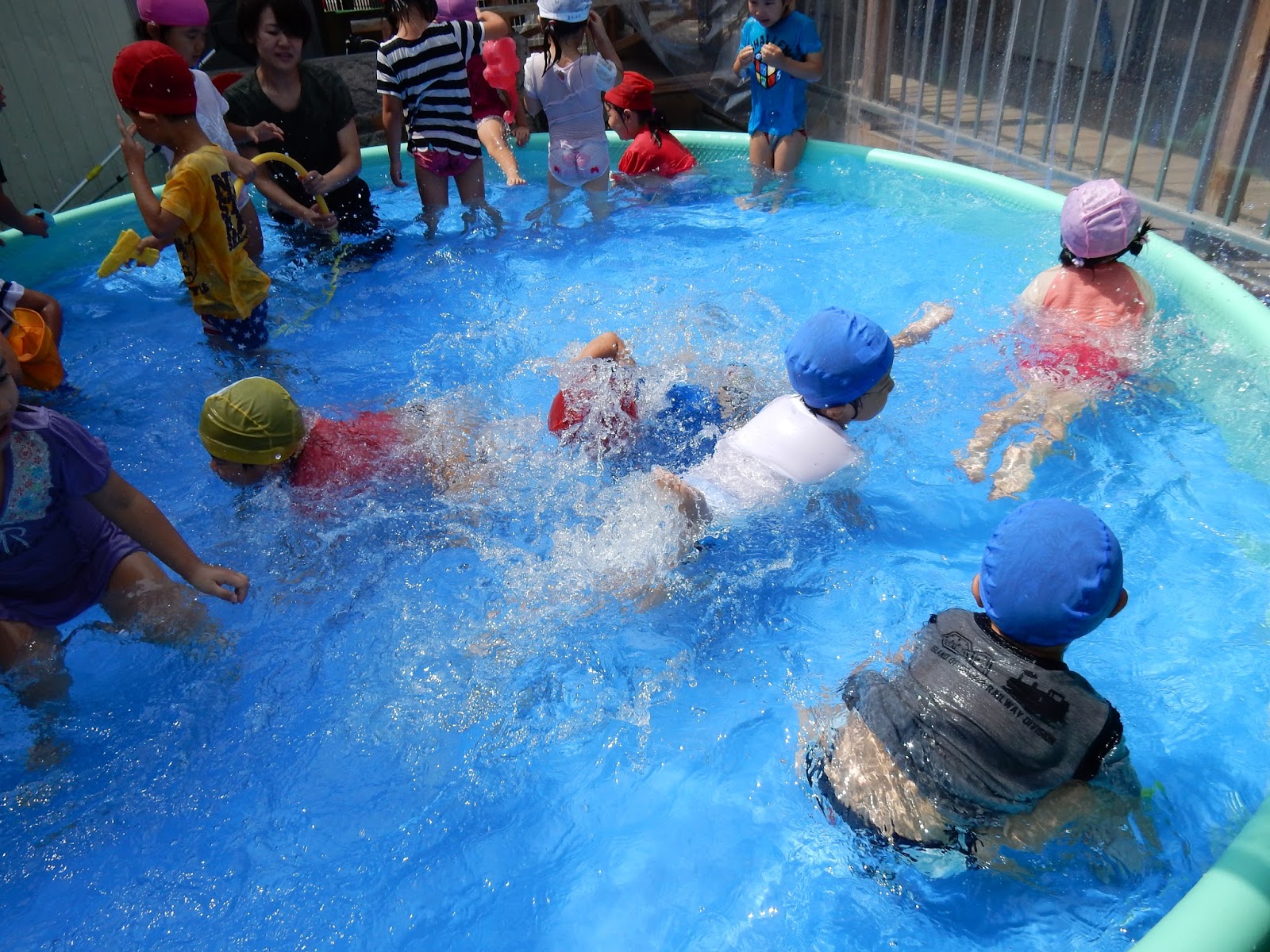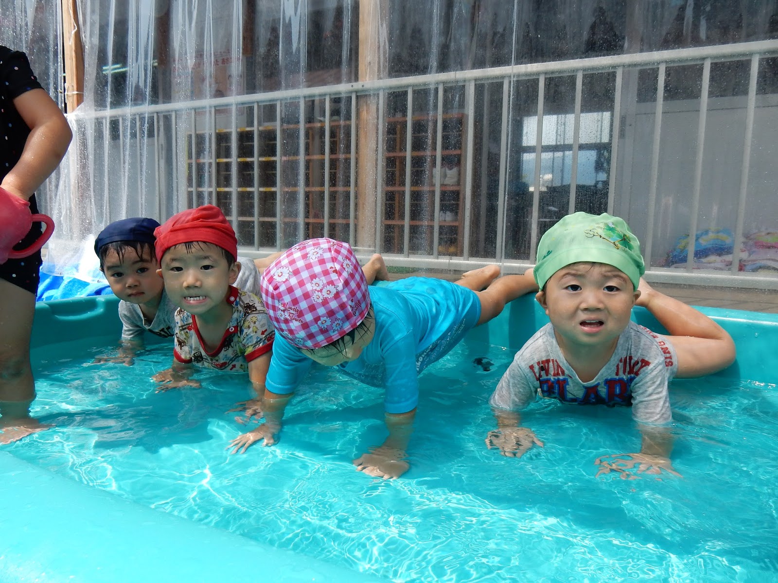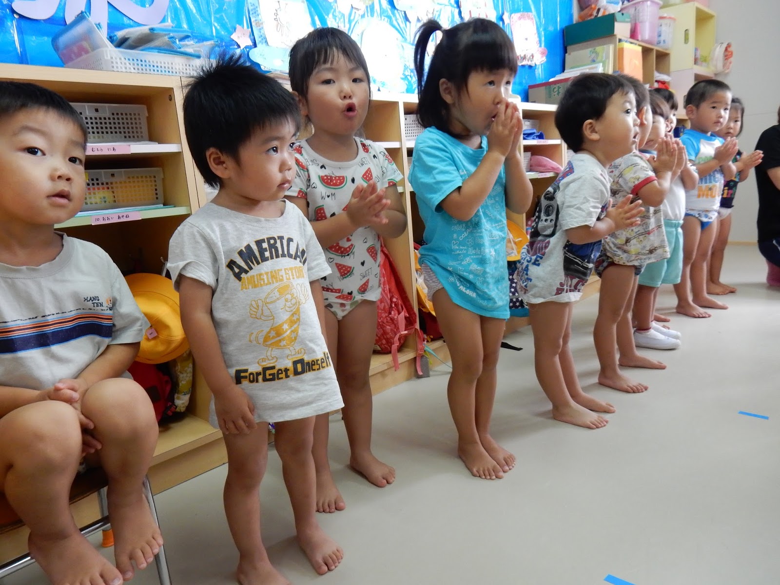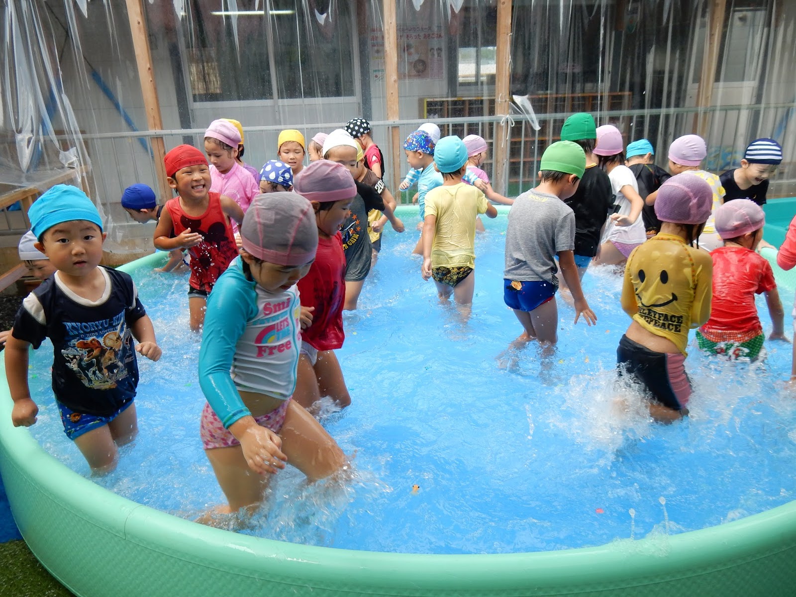 今日も暑かったですね!各クラス、水遊びを楽しんでいましたよ!休み前、顔に水がかかることが苦手だったお友達が、ざぶん!!と顔付けを見せてくれたり!先生たちもビックリしていました!