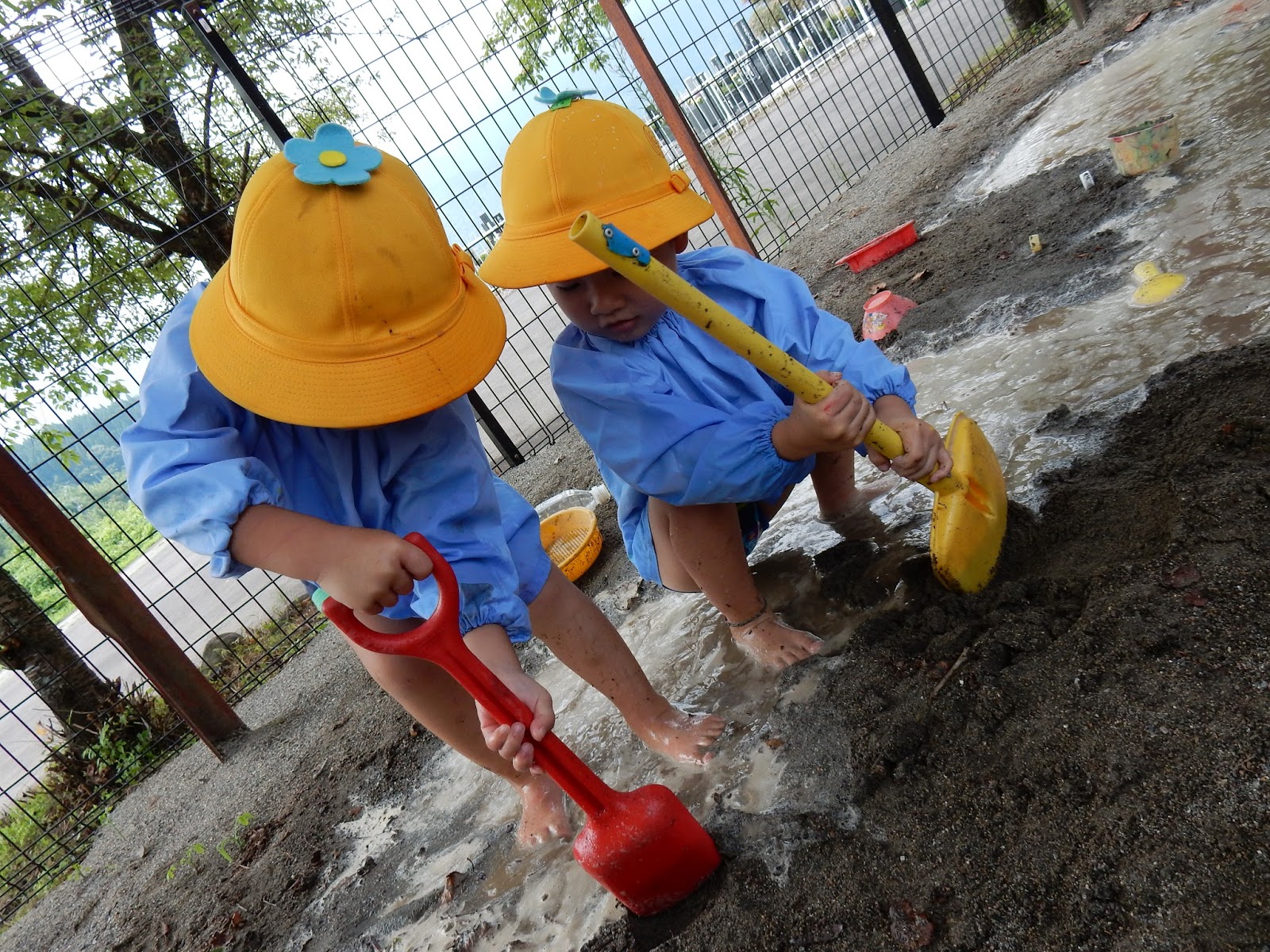 砂場では、『工事中でーす!!』とシャベルで掘ったり、足でグリグリ…穴が開いたところに水がたまっていくのを楽しんだりと、どんどん遊びが広がっていきました。