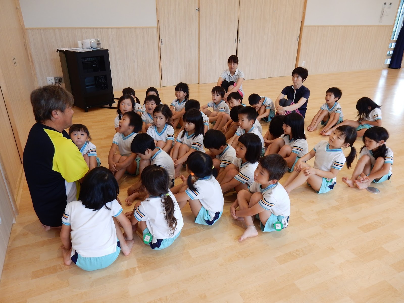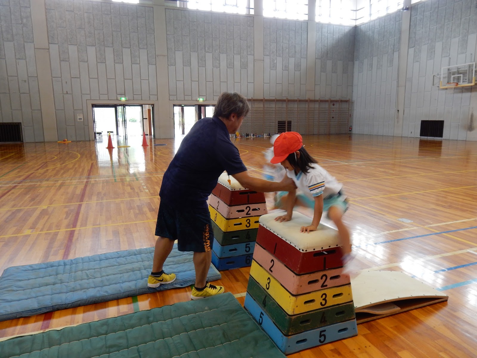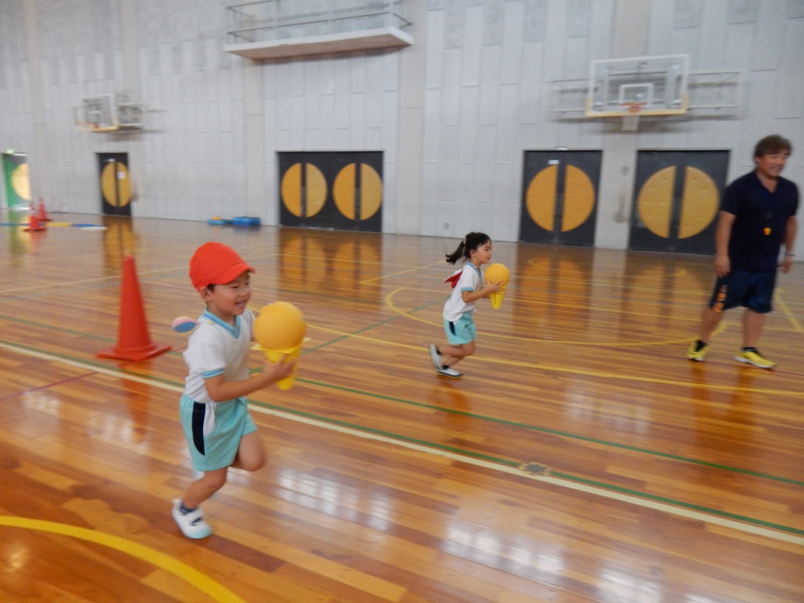 今日は、8月の体操教室でしたね。天気予報では雨が降るような…朝の天気も微妙で…町民体育館での体操教室でした。蒸し暑い中だったので、水筒を持って出かけて行った子ども達。暑い中ですが、力いっぱい体を動かして遊んできましたよ!