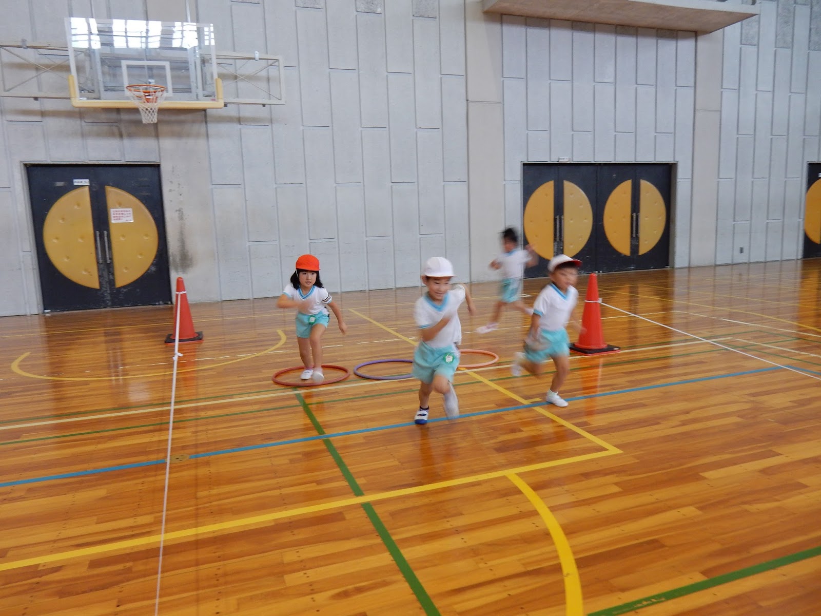 かけっこやリレーの練習もしています!写真がぶれているのはみんなが速く走っている証拠ですね!力いっぱい腕を振って走ります。バトンタッチが勝負の鍵!こちらもこれから練習していこうね!