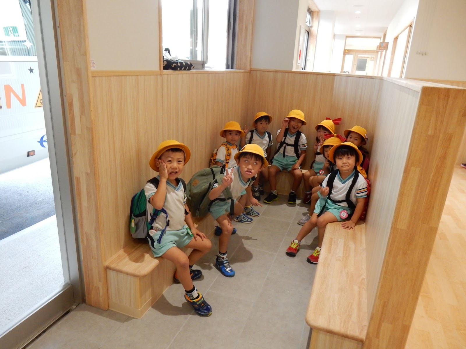 バスを待っているお友達のためにも、こんな可愛らしい椅子が設置されています。すぐ近くまでバスが来てくれるので、まるで旅館の入口のよう!思わず、朝到着したバスの扉が開いたとき、『いらっしゃいませ♡』なぁんて言ってしまいました!出迎えられた子ども達の恥ずかしそうな、でもとっても嬉しそうな笑顔がかわいらしかったです!