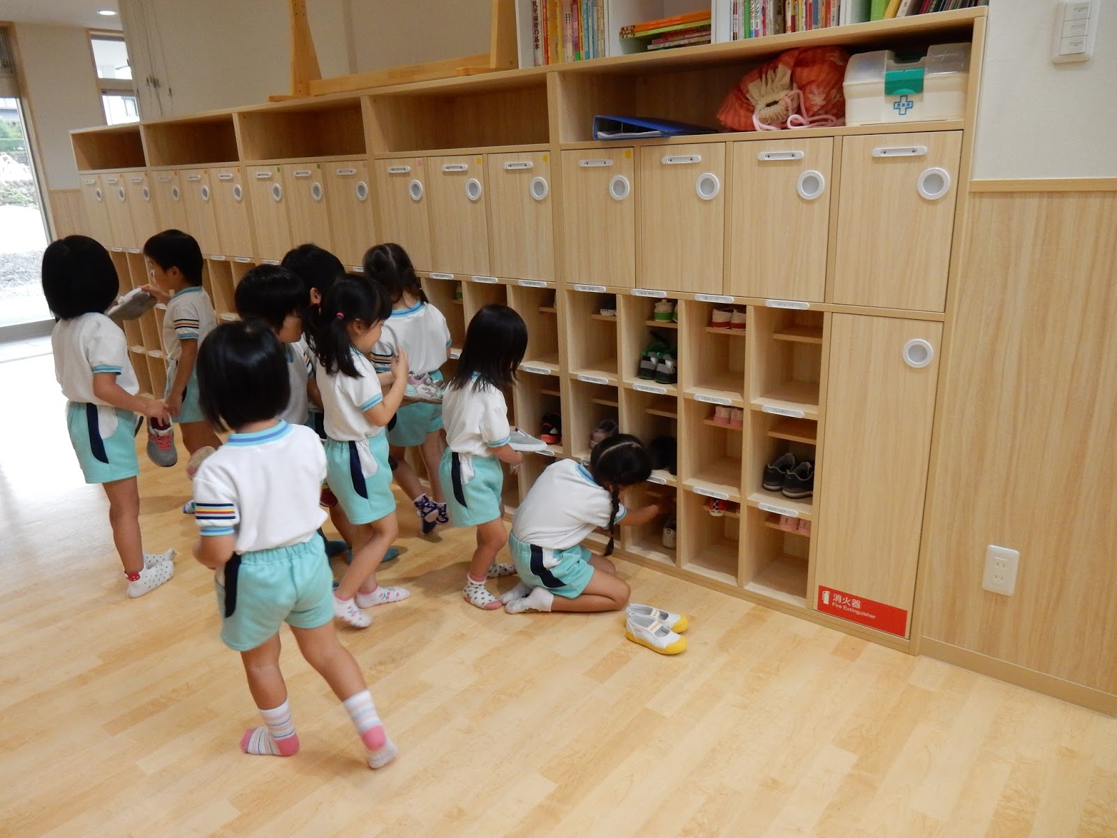 大きいクラスのお友達は、たくさん並んだ靴箱の中から自分の名前や、マークの付いたシールを探します。なかなか見つからずに困っていた子も、一度覚えてしまうと、次からはもうまっすぐそこへ向かっていきます!