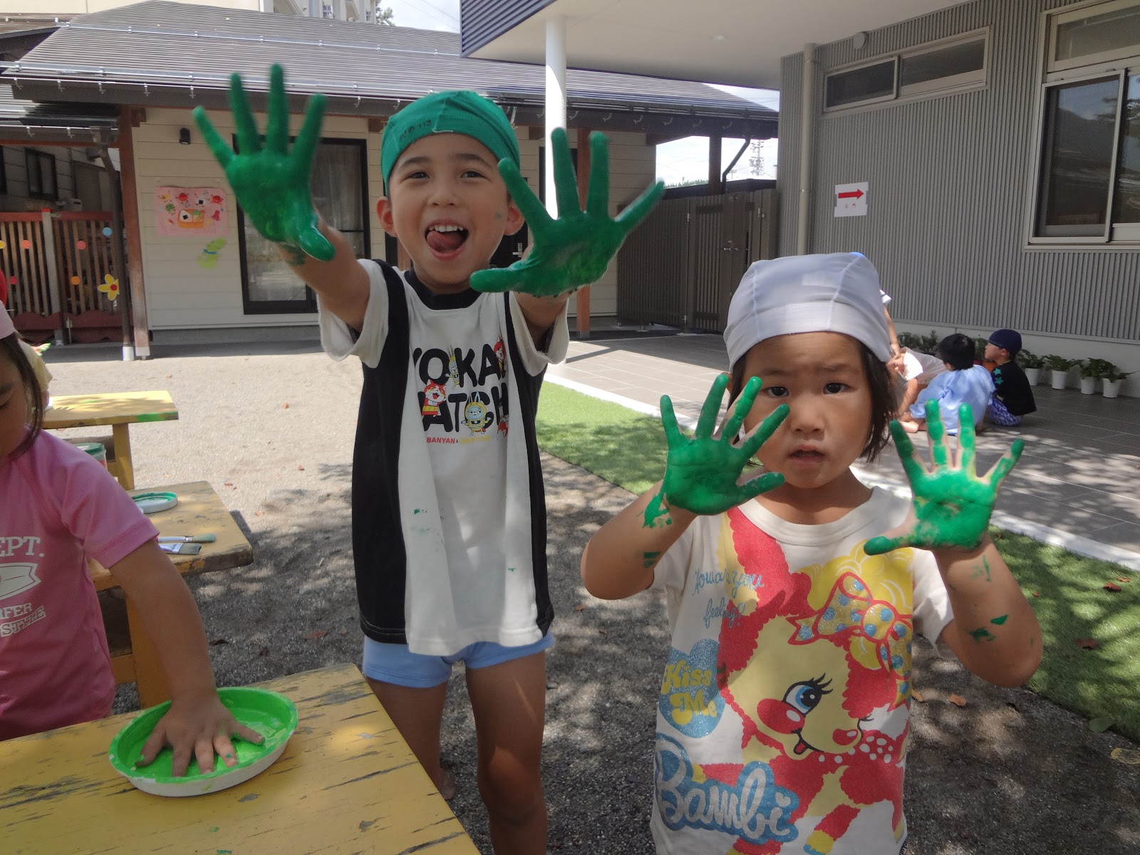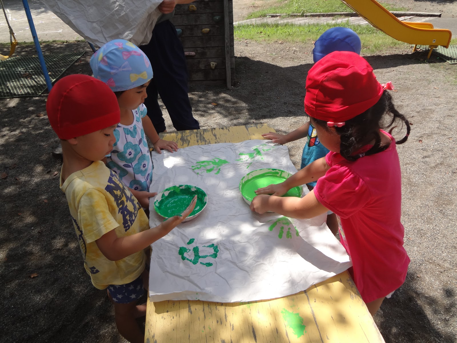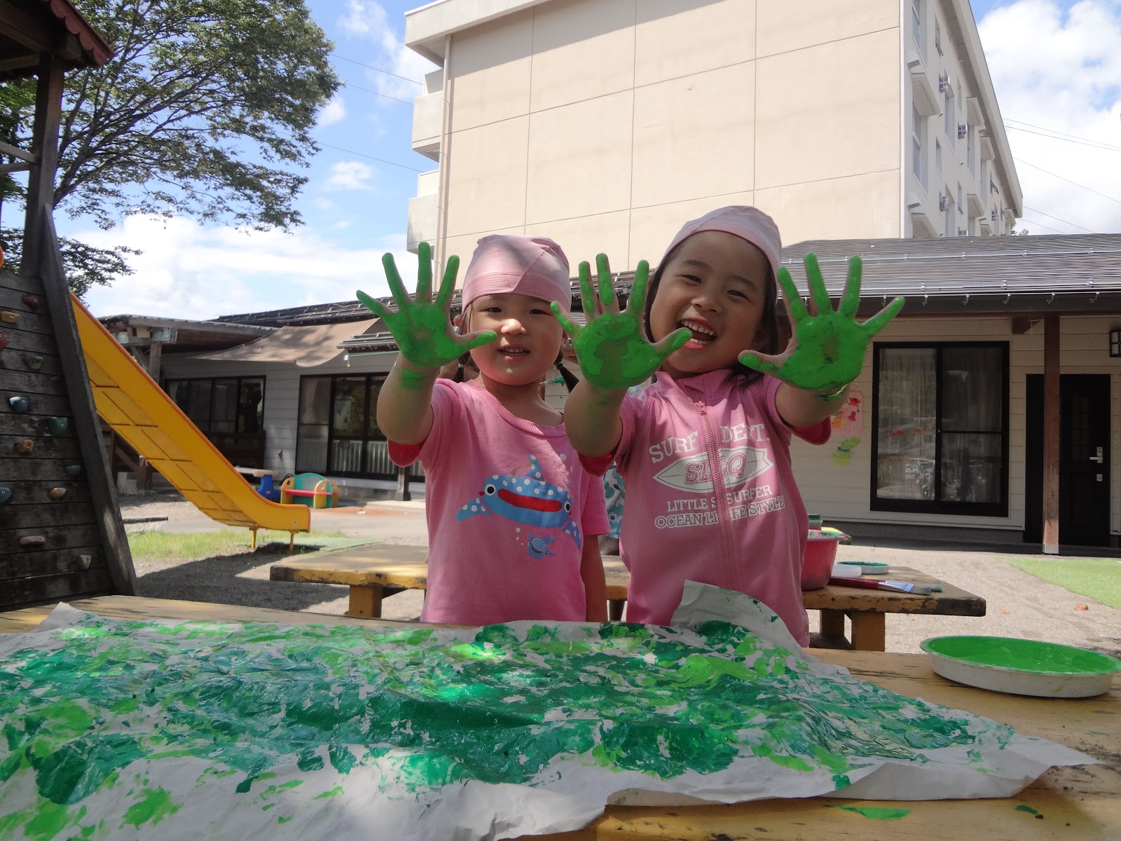 ゆりさんは、手形をしています!緑の手形がいっぱい!これは何になるのかな?楽しみですね!