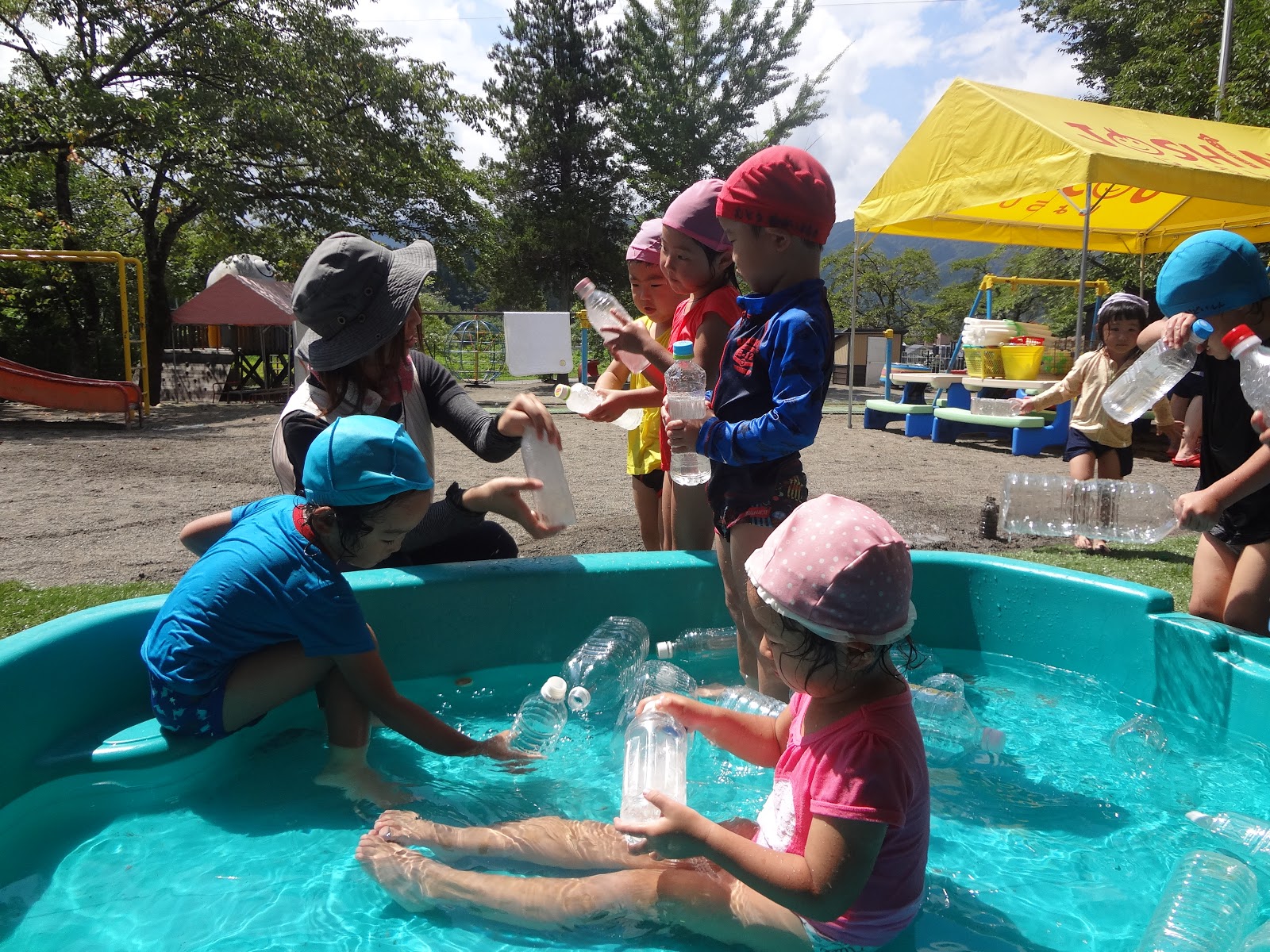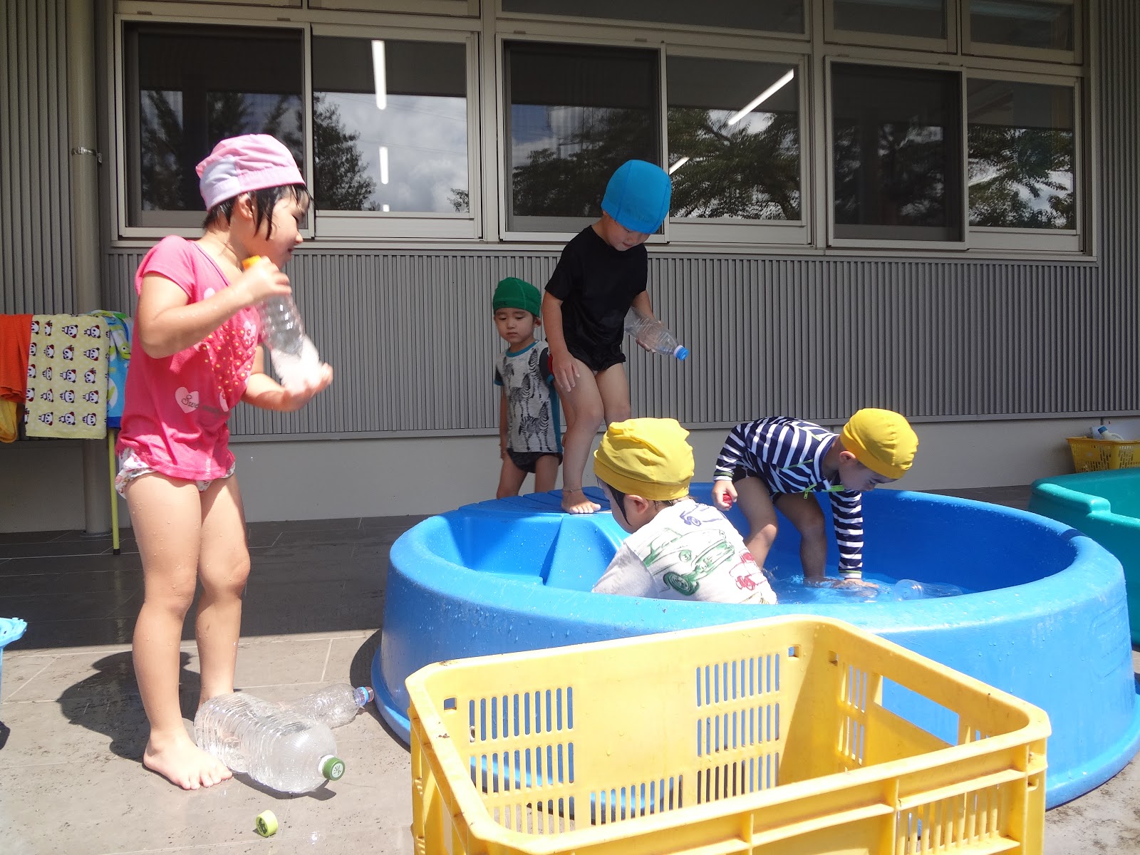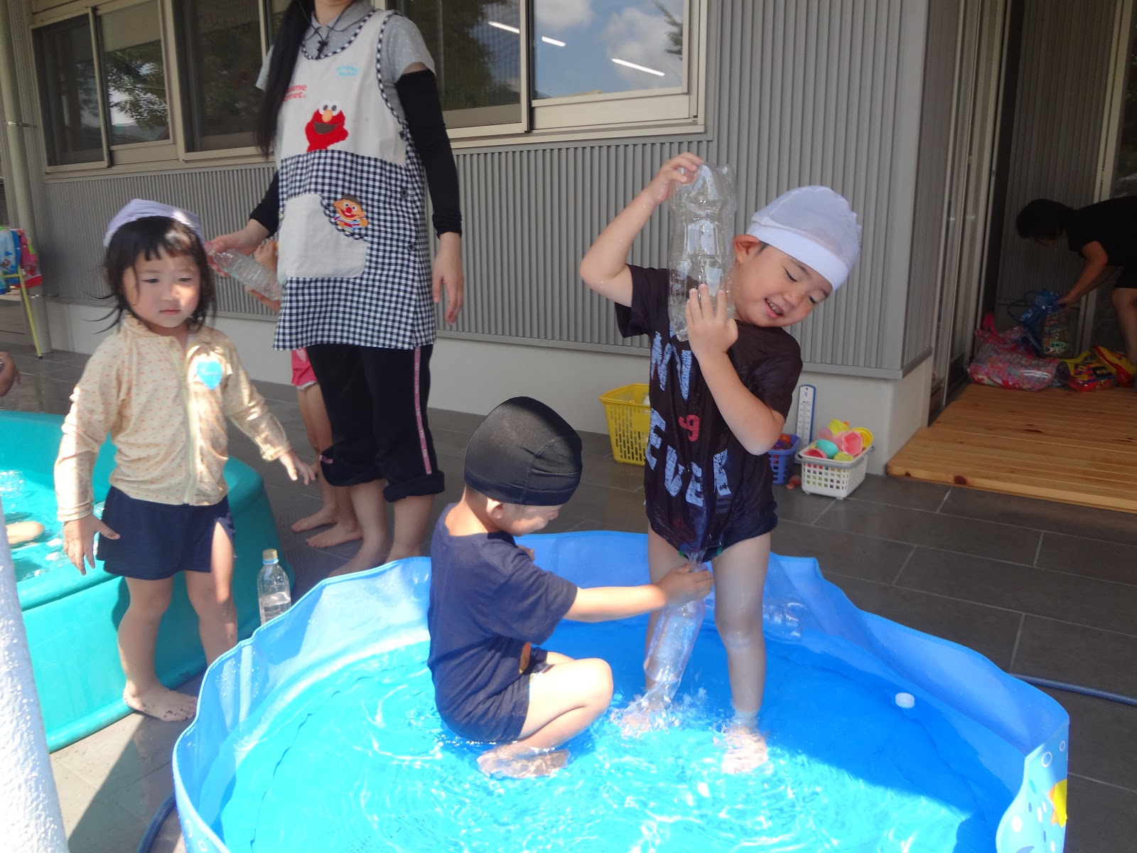 玄関横のスペースにプールを持ってきて。ペットボトルがたくさん!子ども達は自分で工夫しながらいろんな遊びを思いつきます!お風呂のお湯をかぶっているみたい!なんだかとっても気持ちよさそうですね!