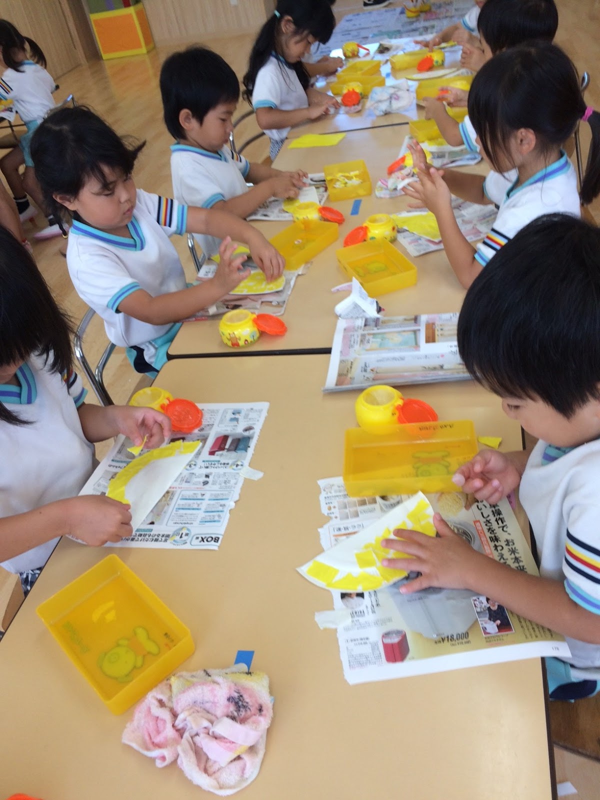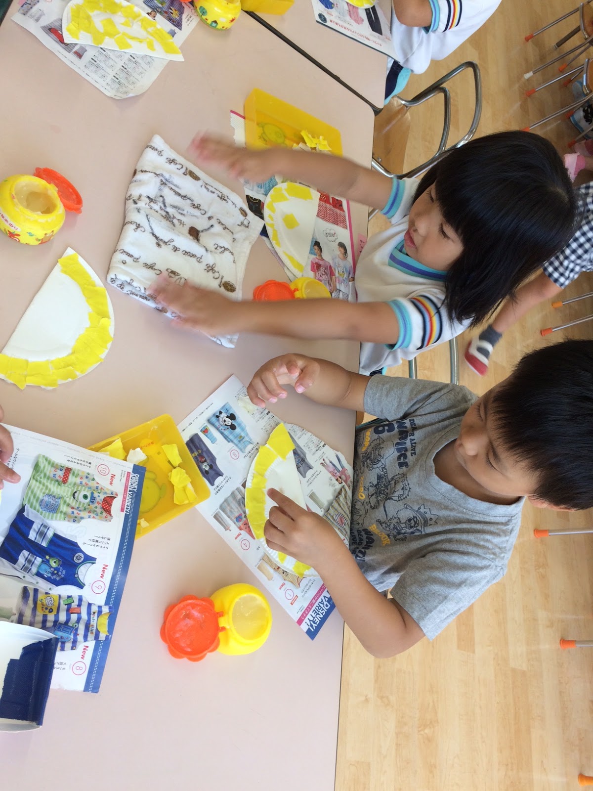 ゆりさんは、折り紙をちぎって、紙皿に貼っていきます細かい作業だけど、集中してますね!運動会練習で体をたくさん使うので、こんな風に手先を使う作業が案外楽しかったりもするんです♪