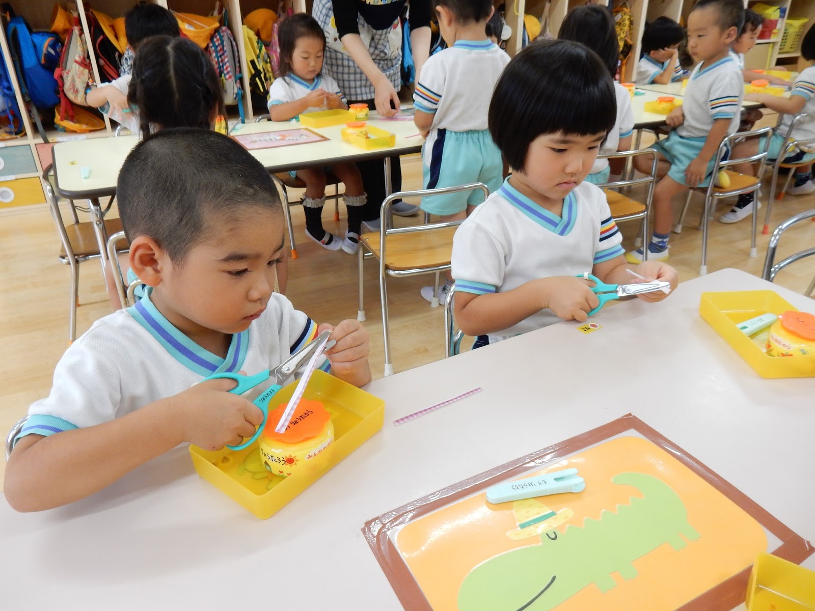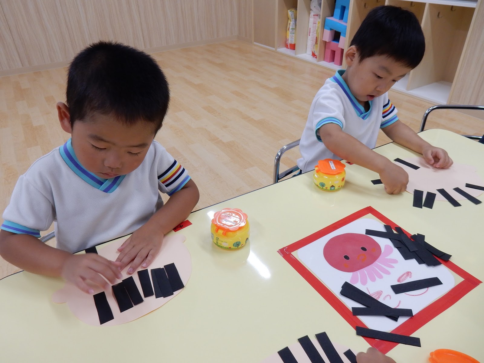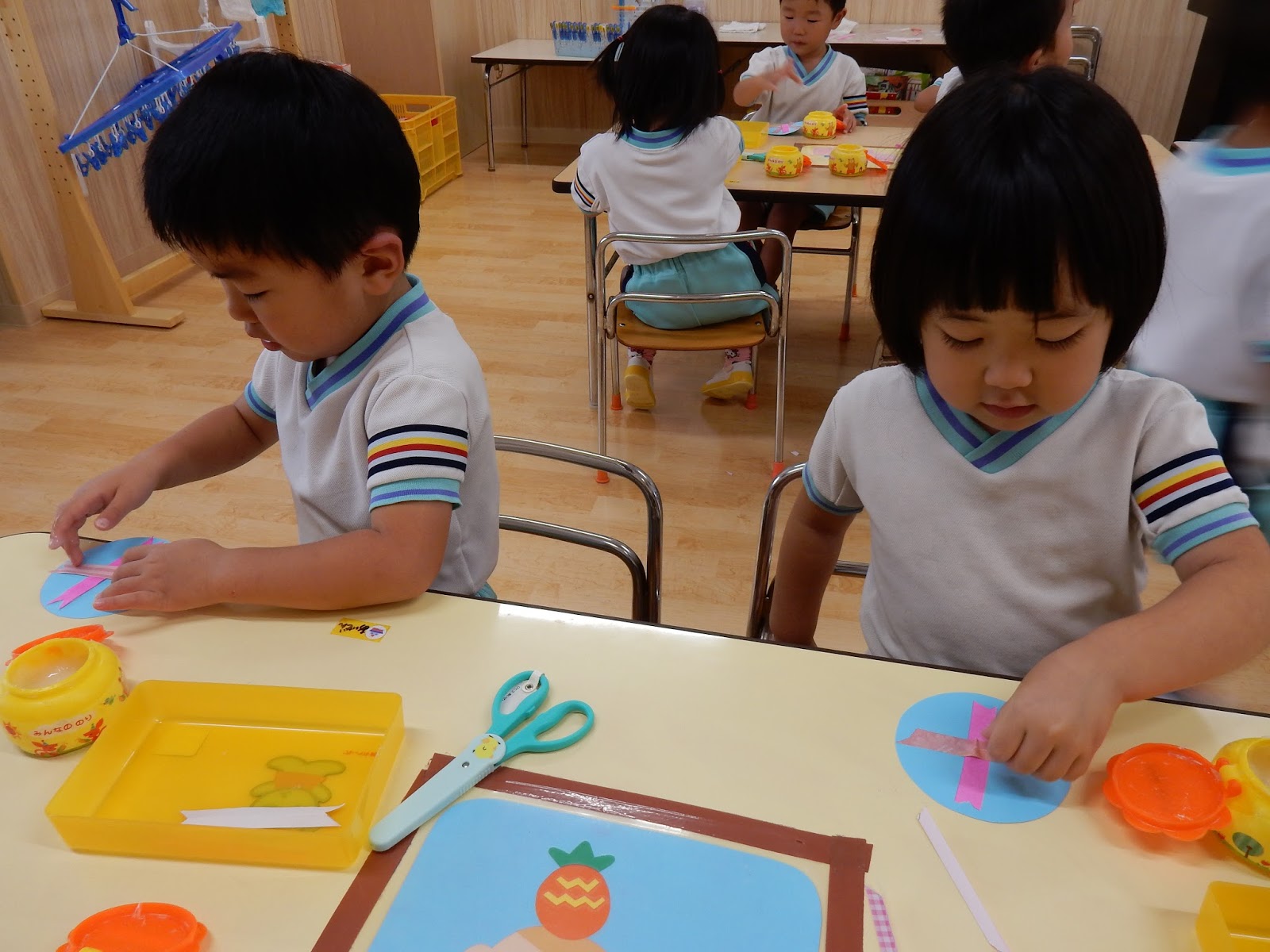 たんぽぽさんは、はさみで切って、ノリを貼って…よーく見ながら黒い線の上を切ったり、ノリで貼るのも、横向き、縦向きと方向が決まっていたんです!なかなか高度!!でも、向きを説明する時に子ども達が、「シートベルトみたい!」というとっても的確な発言をしてくれたので、とっても上手に貼れる事が出来ました!子どもの発送って、素敵ですね!